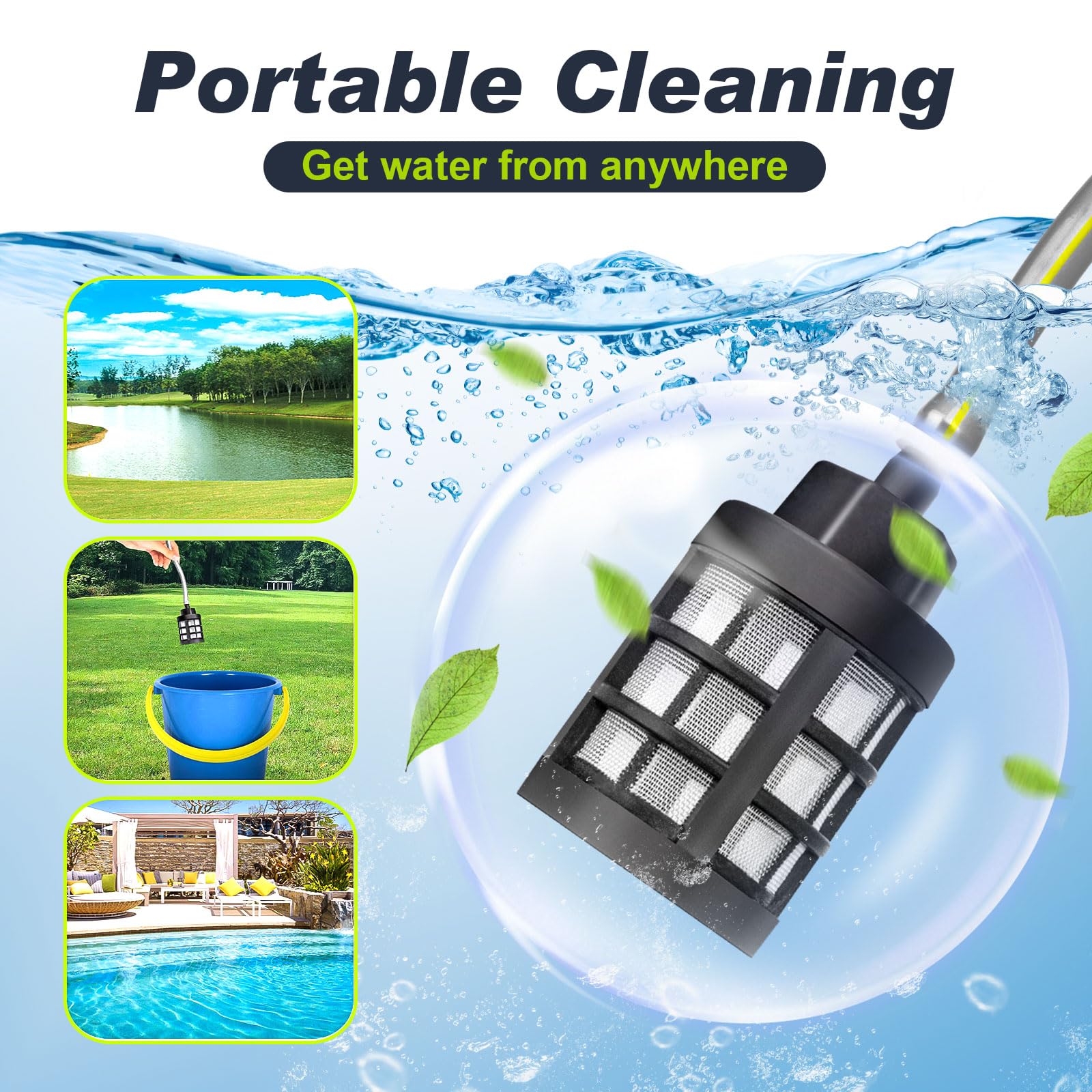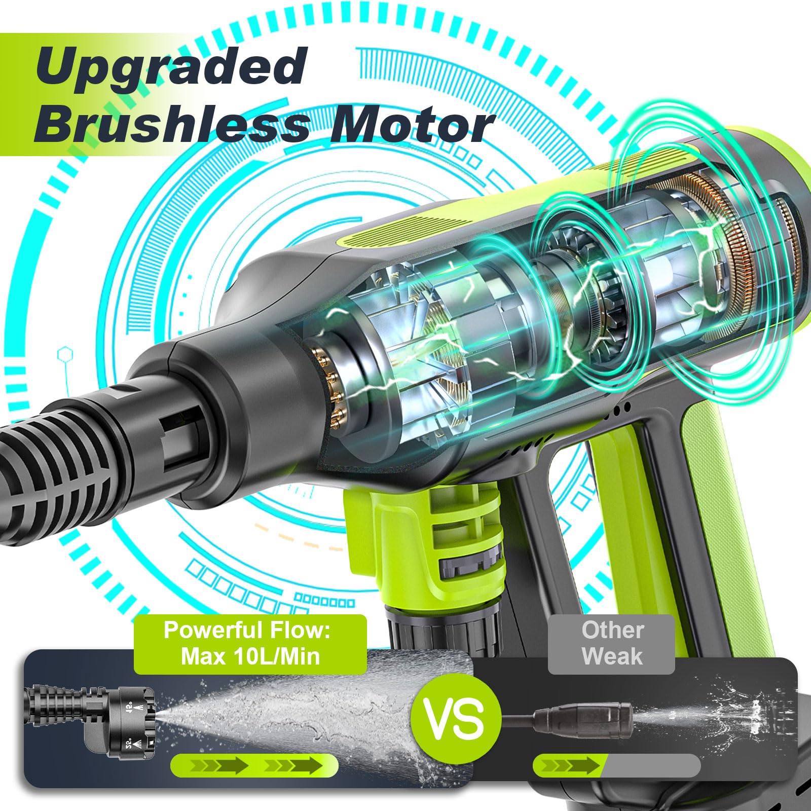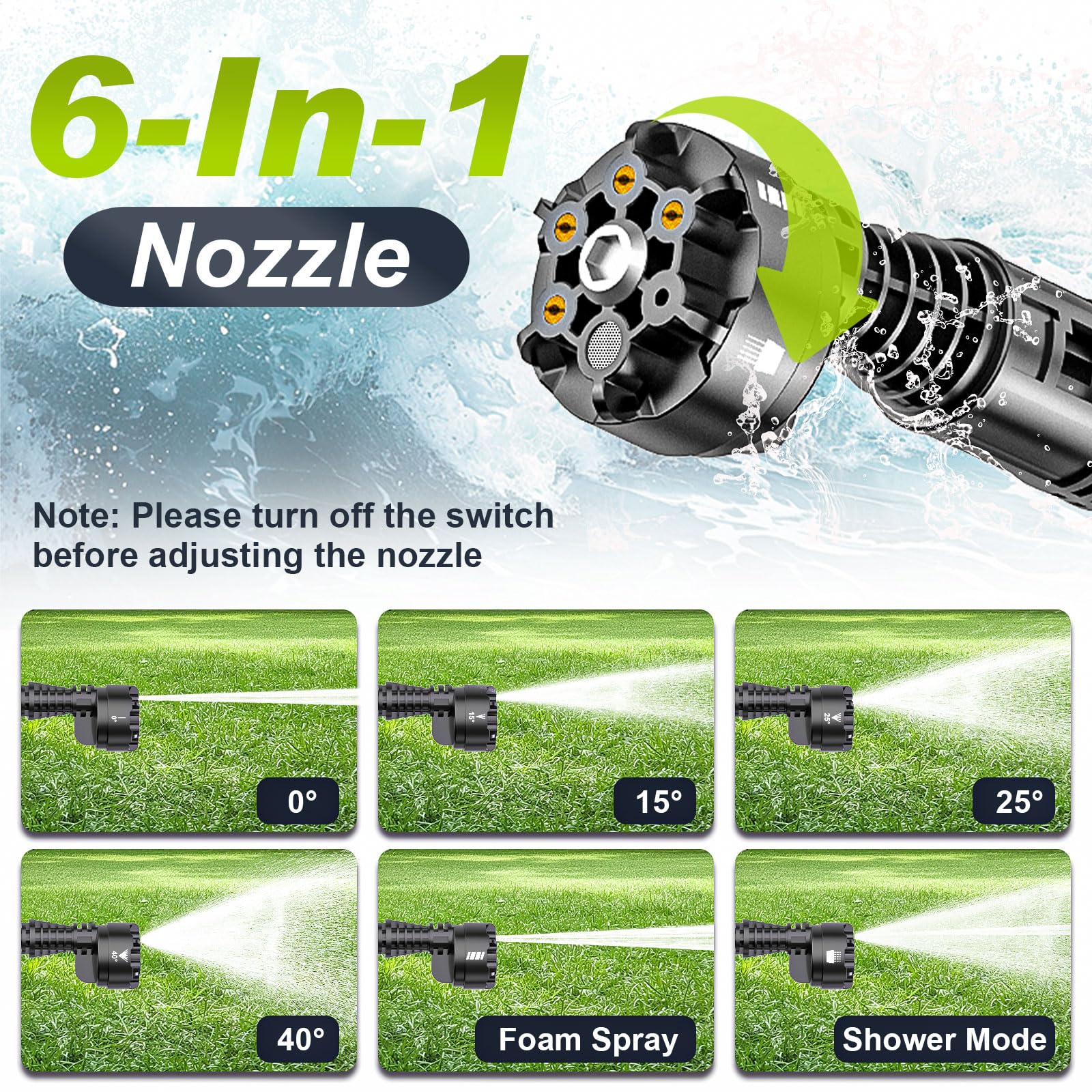 Lieferumfang: 1*Pressure Washer, 1*6-in-1-Düse, 1*Rotationsdüse, 1*Schaumsprüher, 1*Verlängerungsstange, 1*Schlauchanschluss, 1 Filter, 1*5m Schlauch, 2*4Ah-Batterien, 1*Ladegerät, 1*Anleitung, 1 Tragetasche.