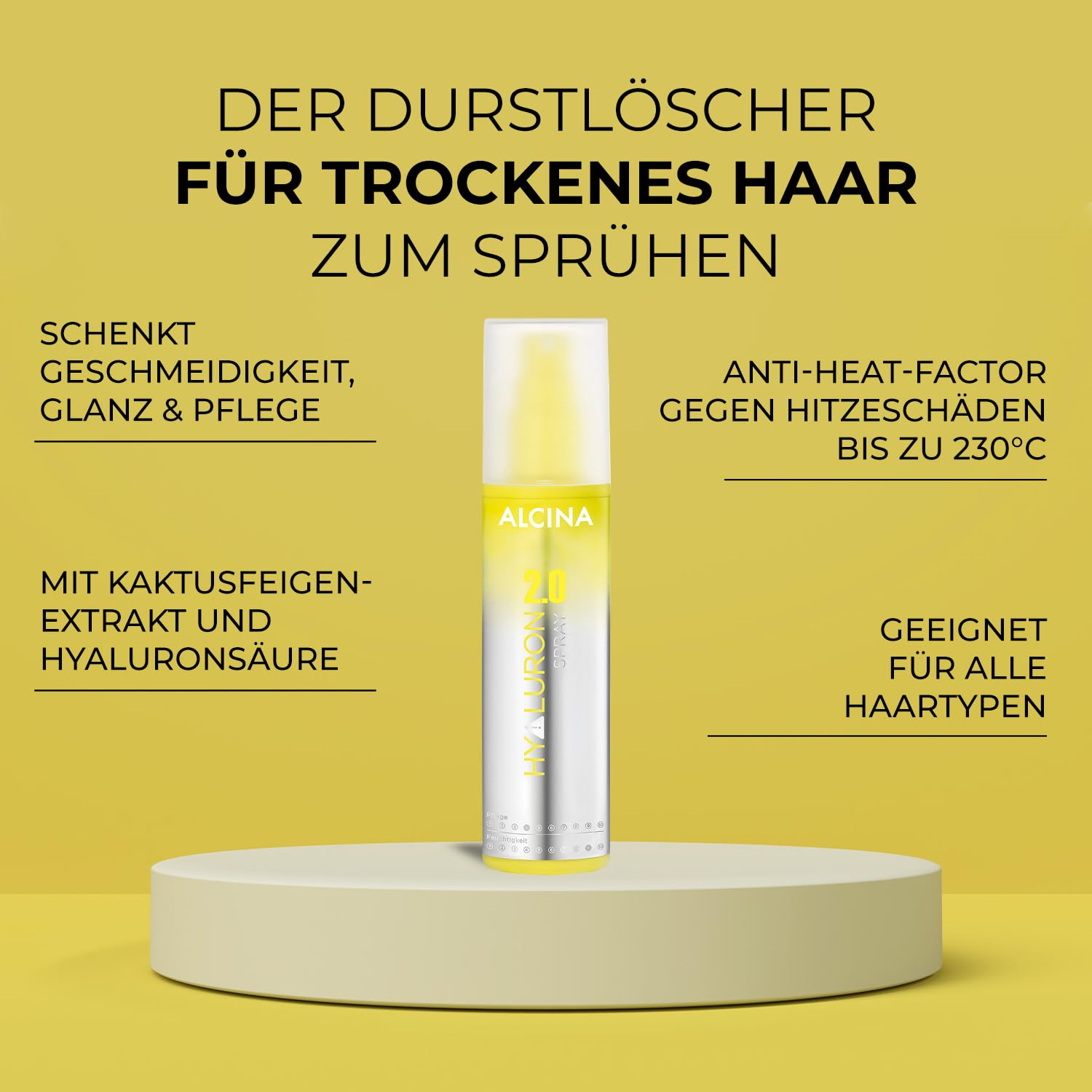 ALCINA Hyaluron 2.0 Spray (125 ml) - Spray für trockene & spröde Haare - für Glanz & Geschmeidigkeit - verhindert Hitzeschäden bis zu 230°C - Haarpflege mit Hyaluronsäure & Kaktusfeigenextrakt