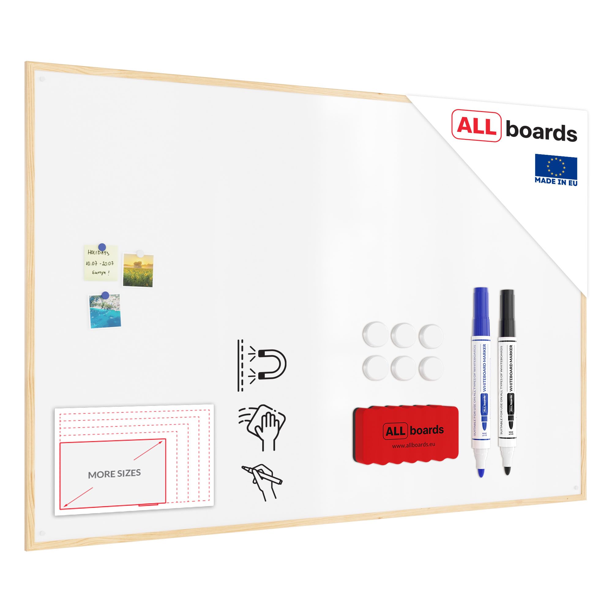 ALLboards Whiteboard mit Holzrahmen 180x120cm Magnettafel Weiss Magnetisch, Trocken Abwischbar