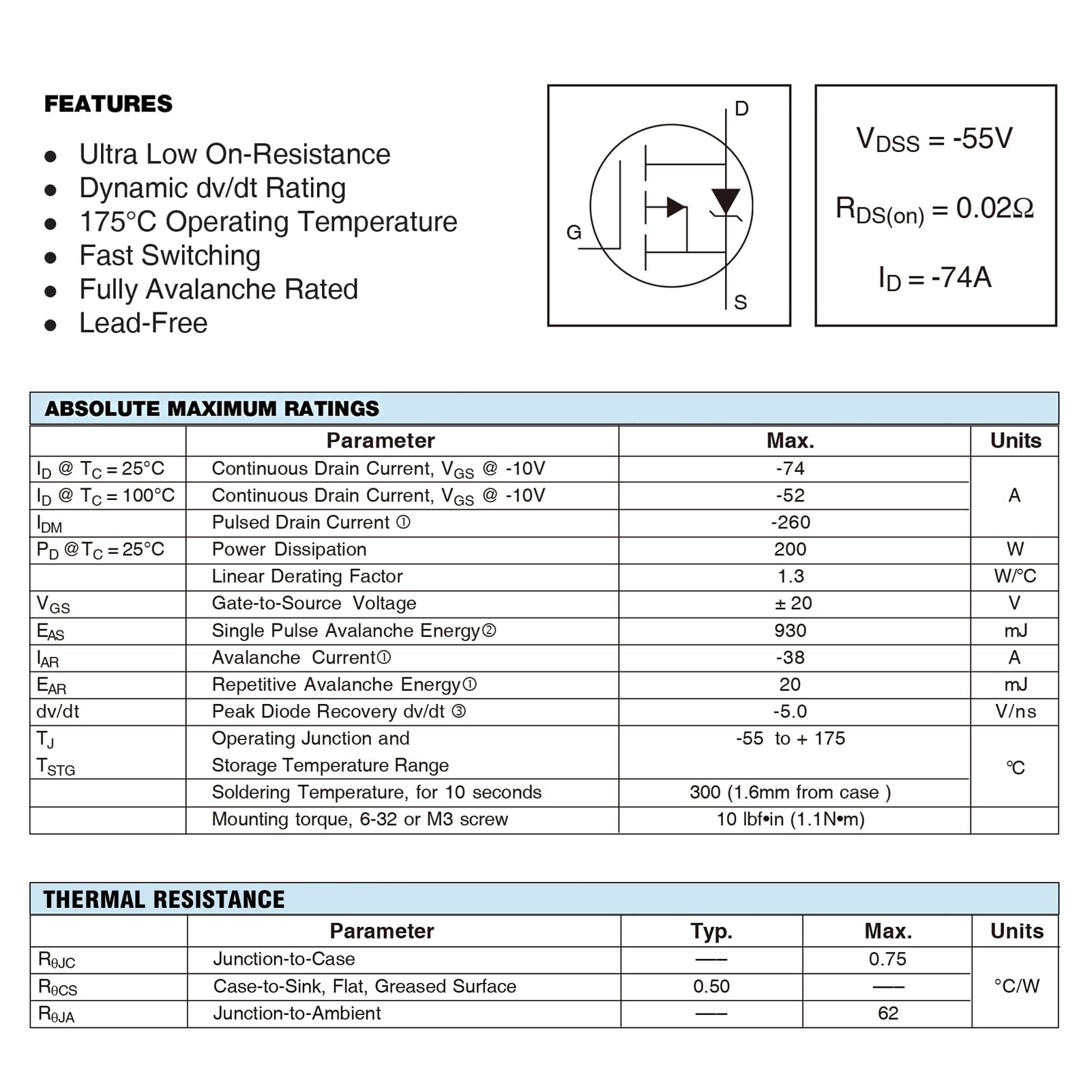ALLECIN 10 Stück IRF4905 IRF4905P IRF4905PBF MOSFET Transistoren Leistungs Halbleiterprodukte 55V 74A P-Kanal Mosfets Transistor 55 Volt 74 Ampere TO-220