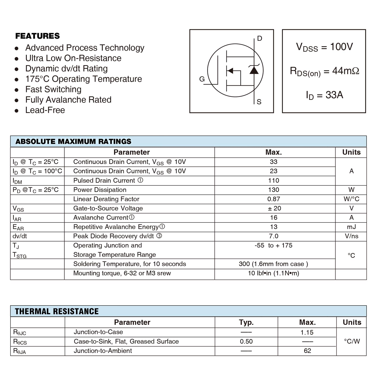 SpezifikationenNennspannung: 100 VNennstrom: 33AArbeitstemperatur: -55 ℃ ~ 175 ℃Durchlasswiderstand Rds(on): 0,04 OhmStromstärke im Dauerbetrieb: 27 AStrom-Idm-Impuls: 110A