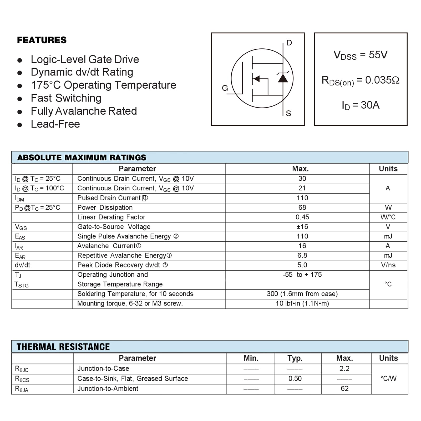 SpezifikationenGrösse: 15,65mm * 10mm * 4,4mmTransistorpolarität: N-KanalDrain-Source-Durchbruchspannung: 55VDauerstrom: 30AOn-Drain-Source-Widerstand: 0,035ΩArbeitstemperatur: -55℃ ~ 175℃