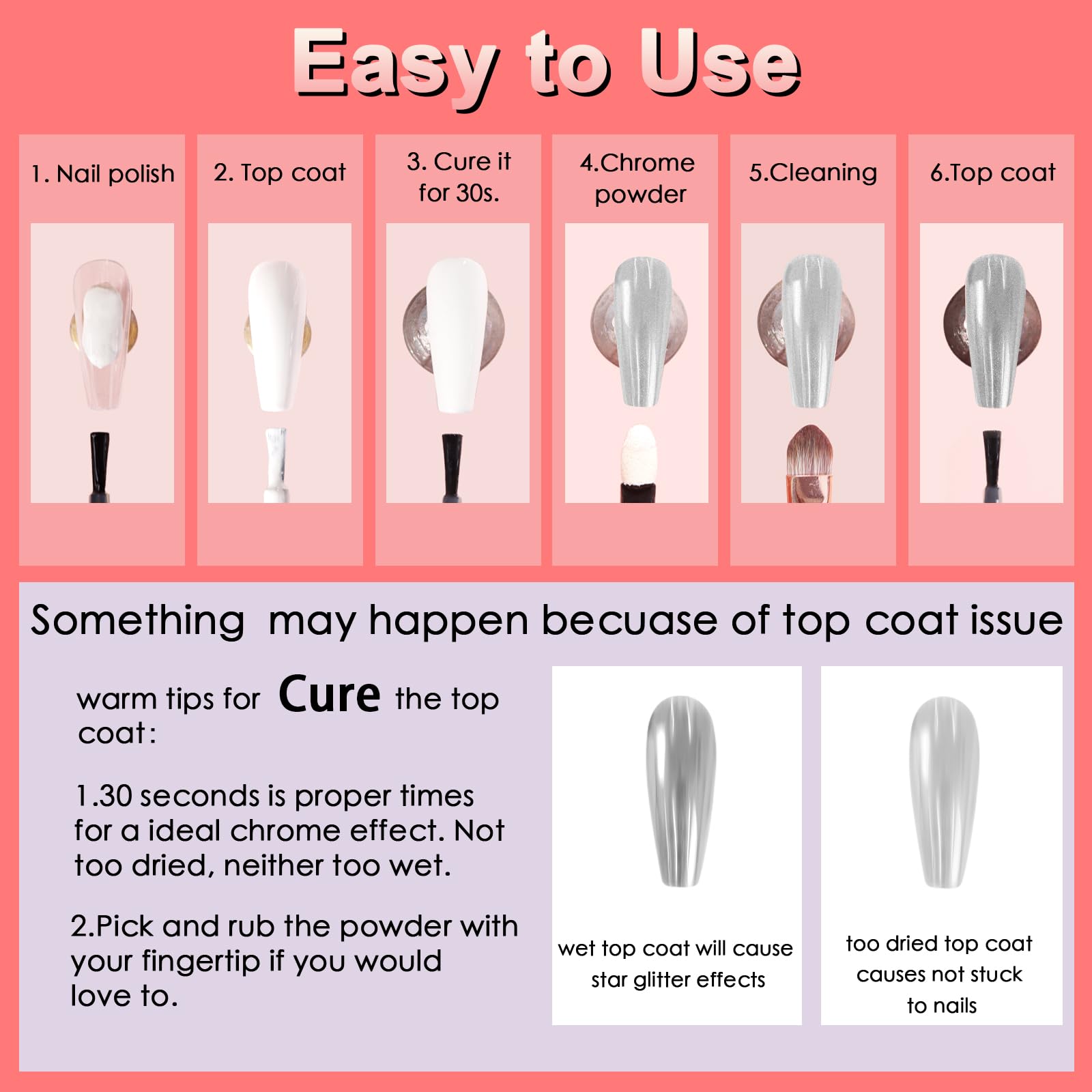 (3)Topcoat: After the nail polish glue, apply a no-wipe top coat and cure with UV/LED lamp for 30 seconds.