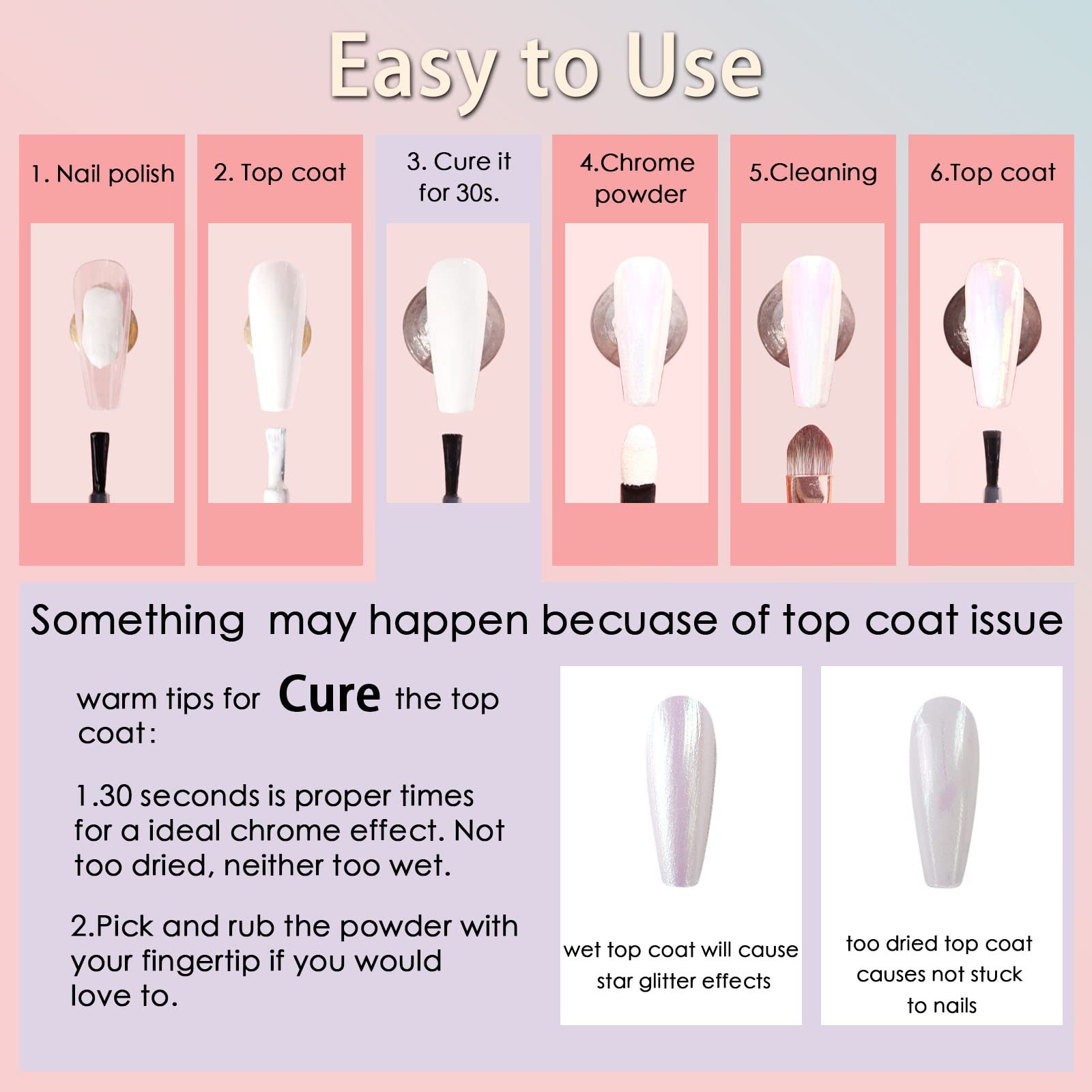 (4) Spiegeleffektpulver: Tauchen Sie das Pulver mit dem Schwammstift auf den Nagel und polieren Sie es, um einen Spiegeleffekt zu erzielen. (5) Wischen: Wischen Sie die Nageloberfläche mit einer Bürste ab, um überschüssiges Zauberspiegelpulver zu entfernen.