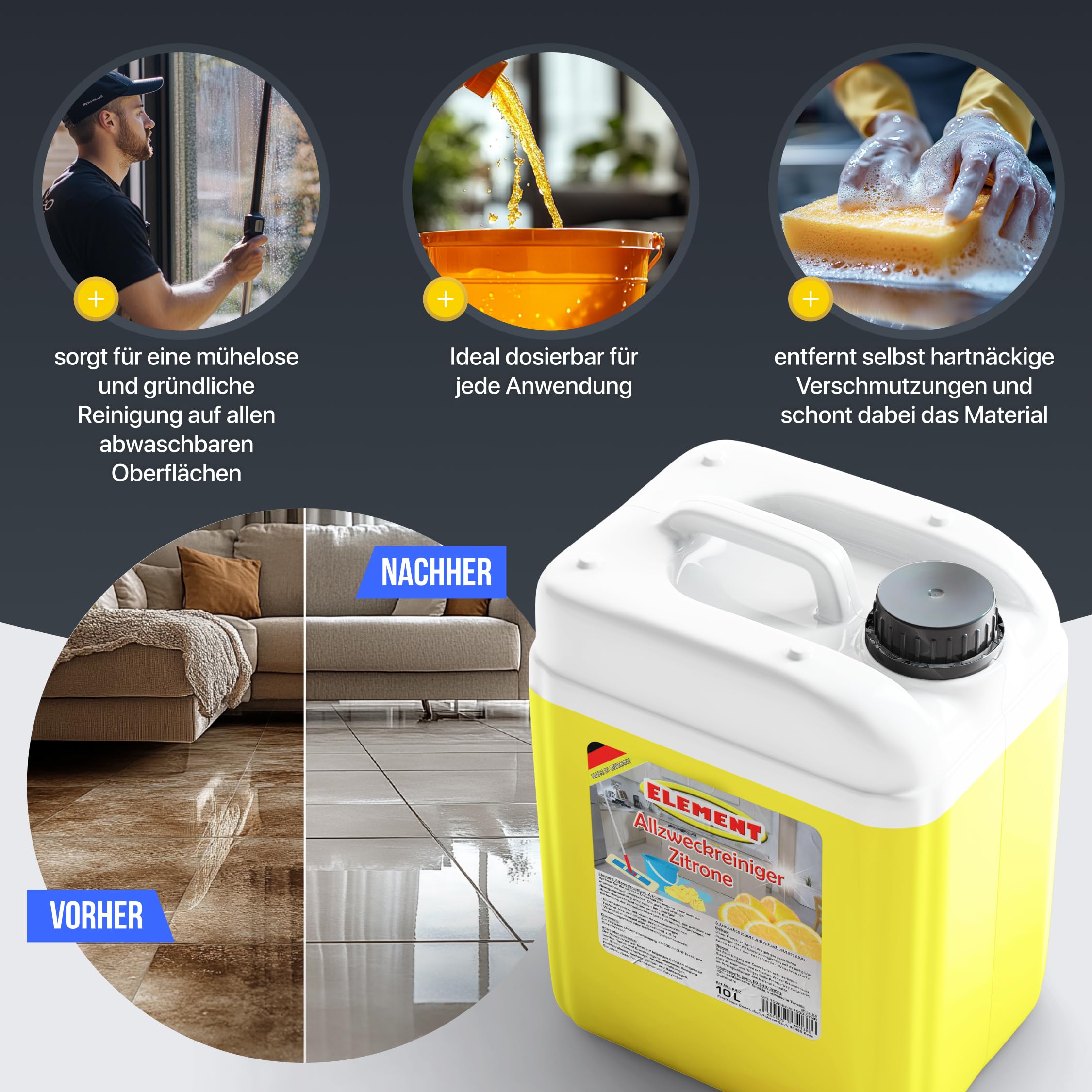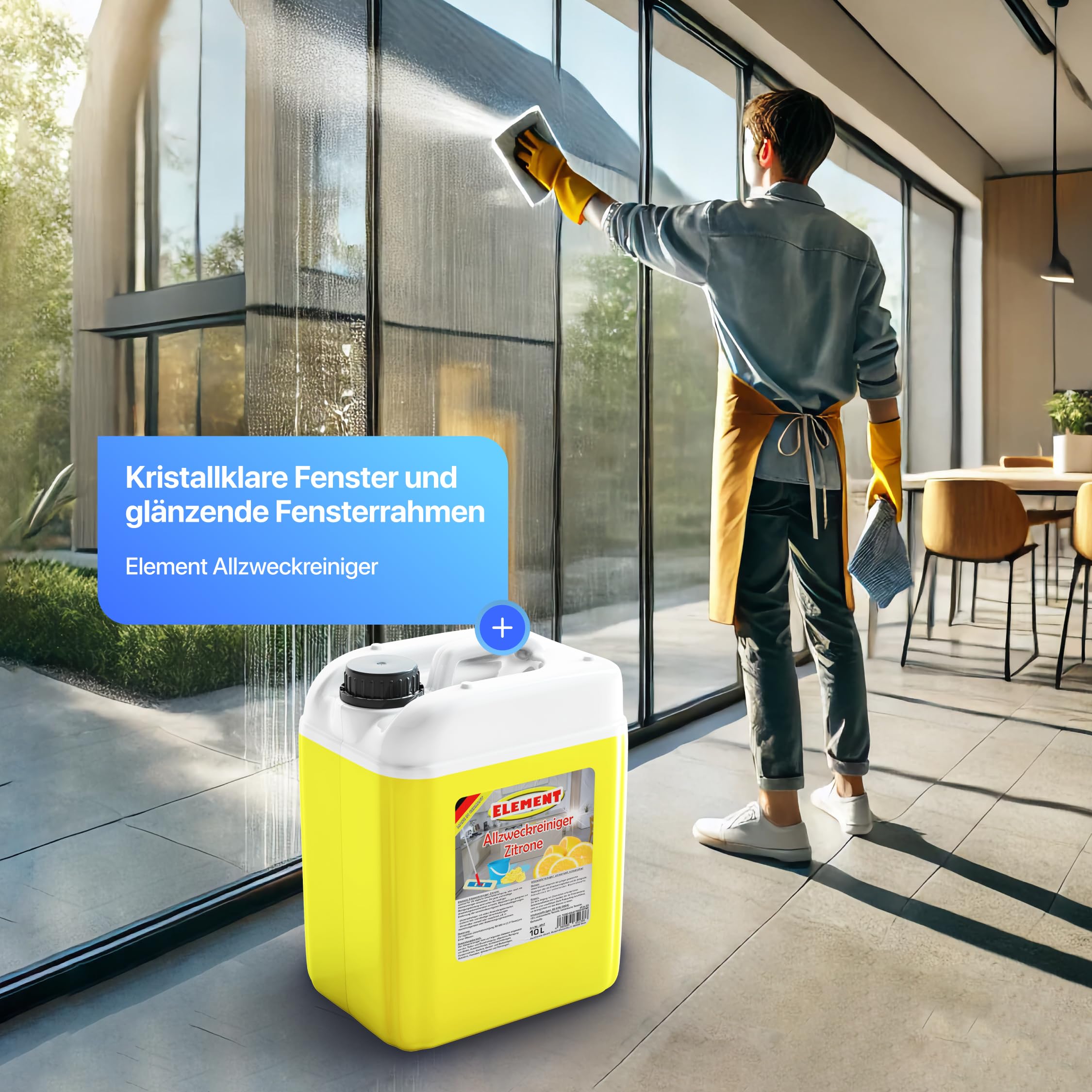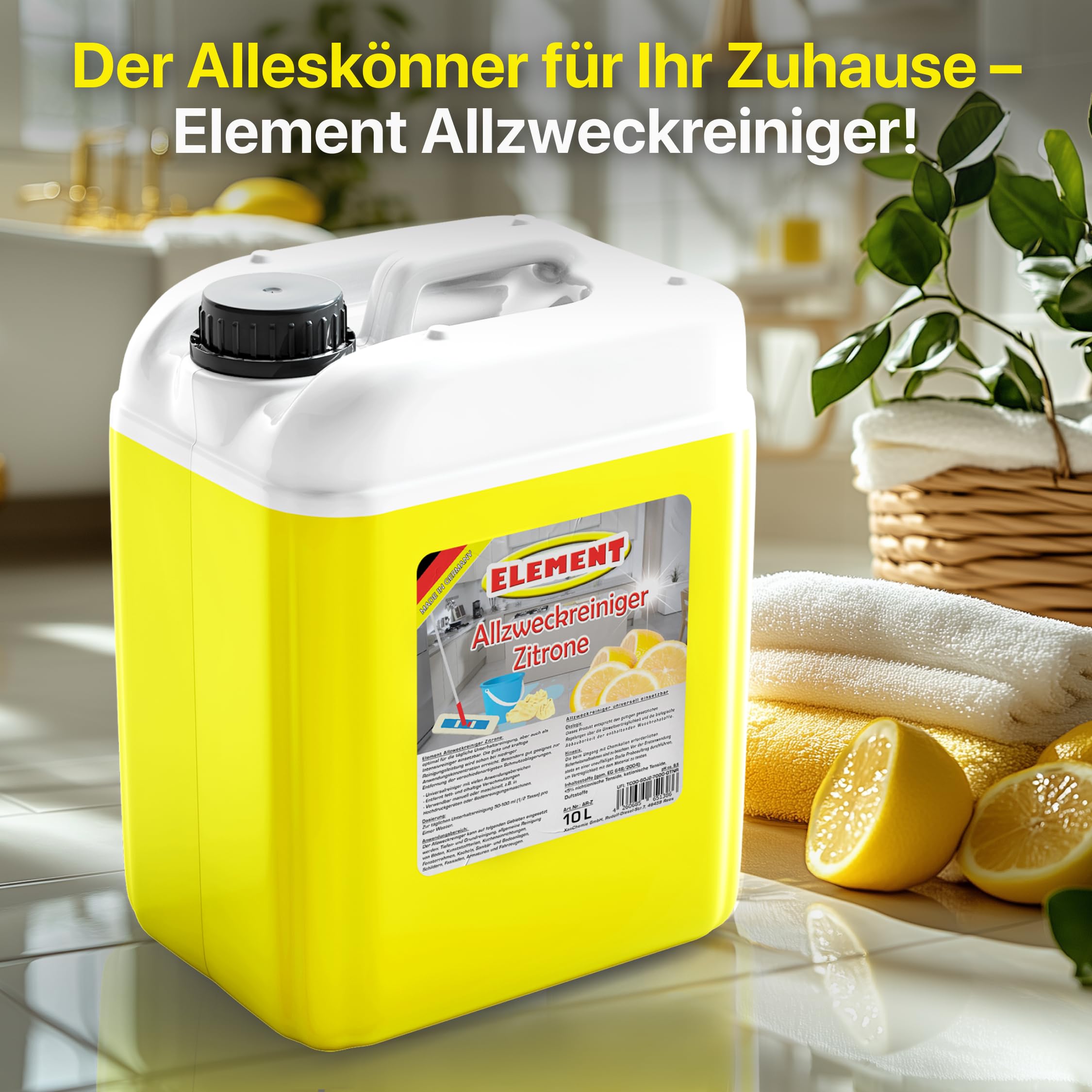 Element Allzweckreiniger Zitrone: " Element Allzweckreiniger verleiht Ihrer Wohnung einen unvergleichlich frischen Glanz. Natürliche Frische, hygienische Reinheit, leichtes und sauberes Dosieren, anwendbar auf allen abwaschbaren Oberflächen. Anwendungsbereich: Für alle abwaschbaren Flächen wie Böden, Türen, Fensterrahmen, Kacheln, Fliesen, Schränke, Treppen - Sehr gute Reinigungsleistung & Materialverträglichkeit - zur mühelosen Entfernung hartnäckiger VerschmutzungenZur Fussbodenreinigung verdünnen: Geben Sie zwei Verschlusskappen voll (60 ml) auf 5 Liter Wasser. Auf gestrichenen oder lackierten Oberflächen nur verdünnt anwenden. Im Zweifelsfall zuerst an einer unauffälligen Stelle testen. Nicht auf nicht abwaschbaren Oberflächen wie gewachstem oder unbehandeltem Holz verwenden. Bei unverdünnter Verwendung (direkt auf der Oberfläche oder auf einem Schwamm) Hände nach Anwendung abspülen und trocknen. Dosierung: Bei normaler Verschmutzung genügen 50 ml Allzweckreiniger auf 10 l Wasser (optimal). Bei extremen Verschmutzungen unverdünnt einwirken lassen und anschliessend den Schmutz mit einem Schrubber lösen. Nach der Reinigung mit klarem Wasser nachwischen. Hinweis: Vor der Erstanwendung stets Probeauftrag durchführen um Verträglichkeit mit dem Material zu testen. Bei besonders beschichteten oder behandelten Oberflächen und Kunststoffen empfiehlt sich ebenfalls vorab eine Probe auf Materialverträglichkeit an einer nicht einsehbaren Stelle. Einstufung gemäss Verordnung (EG) Nr. 1272/2008 Das Produkt ist gemäss CLP-Verordnung nicht eingestuft.