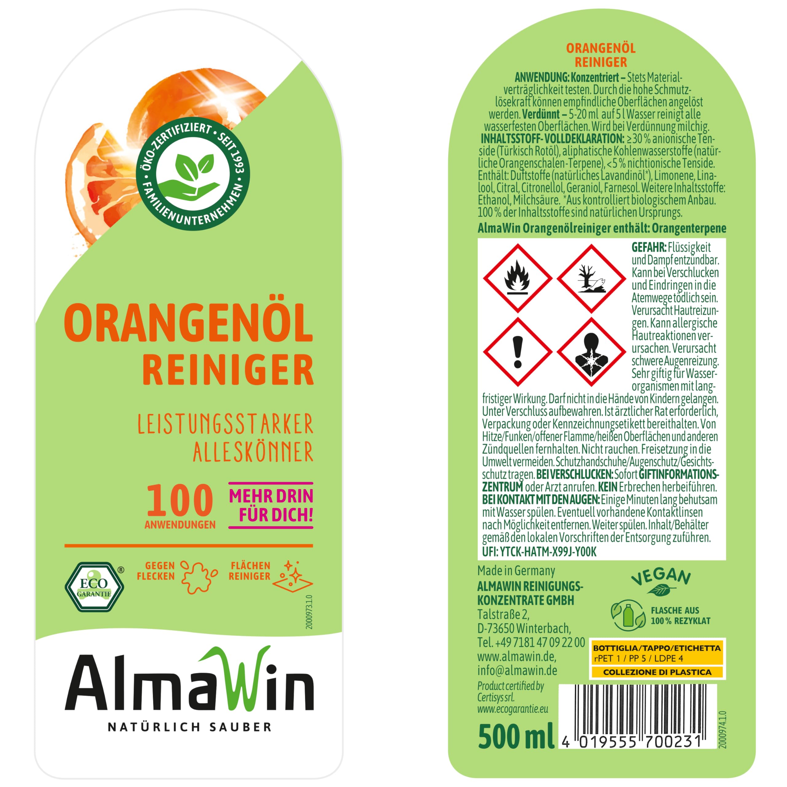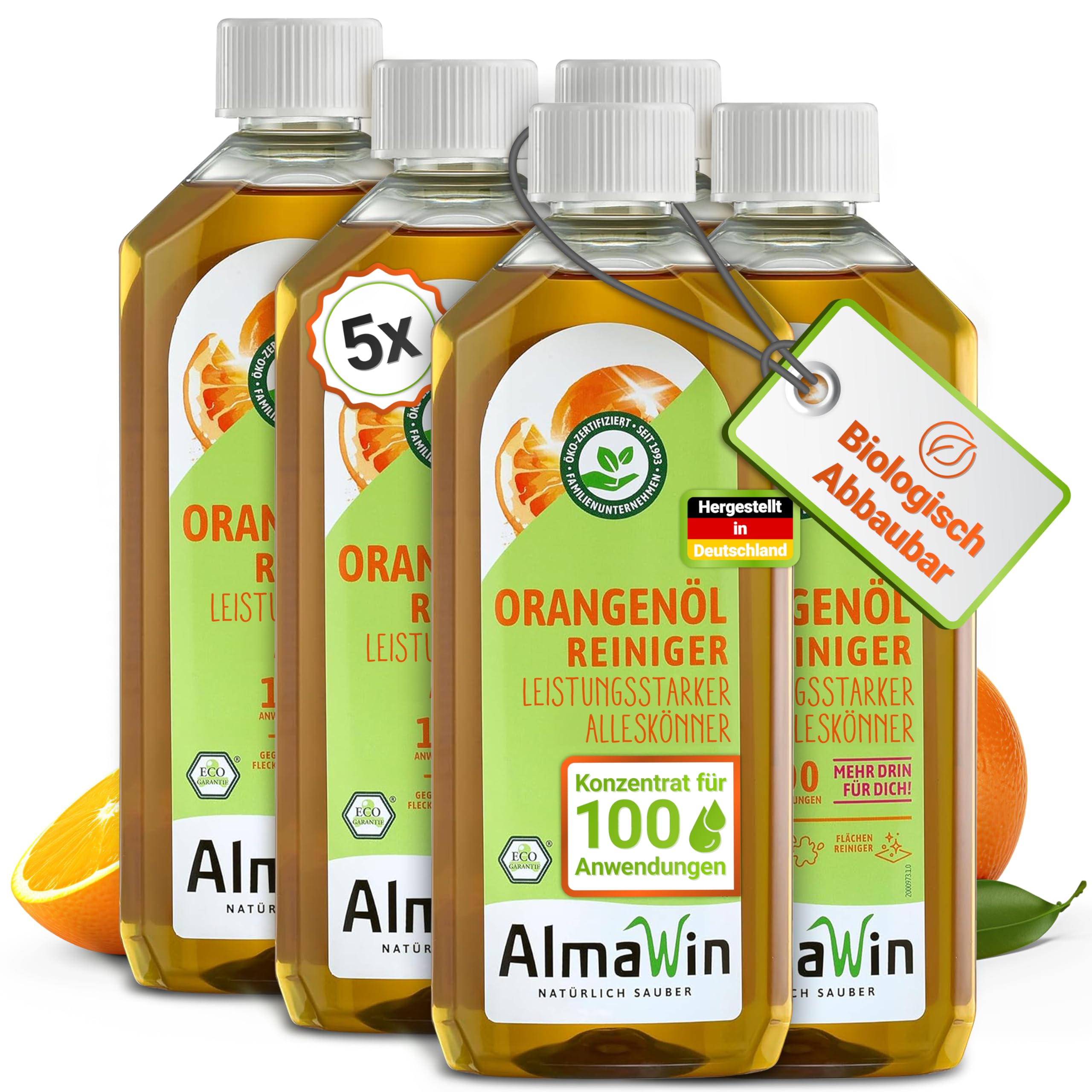 AlmaWin® Orangenölreiniger ÖKO [5x 500ml] ideal als starker Allesreiniger & Fettlöser - Veganes Orangenreiniger Konzentrat in recycelter Flasche - Besonders ergiebiger Orangenöl Reiniger