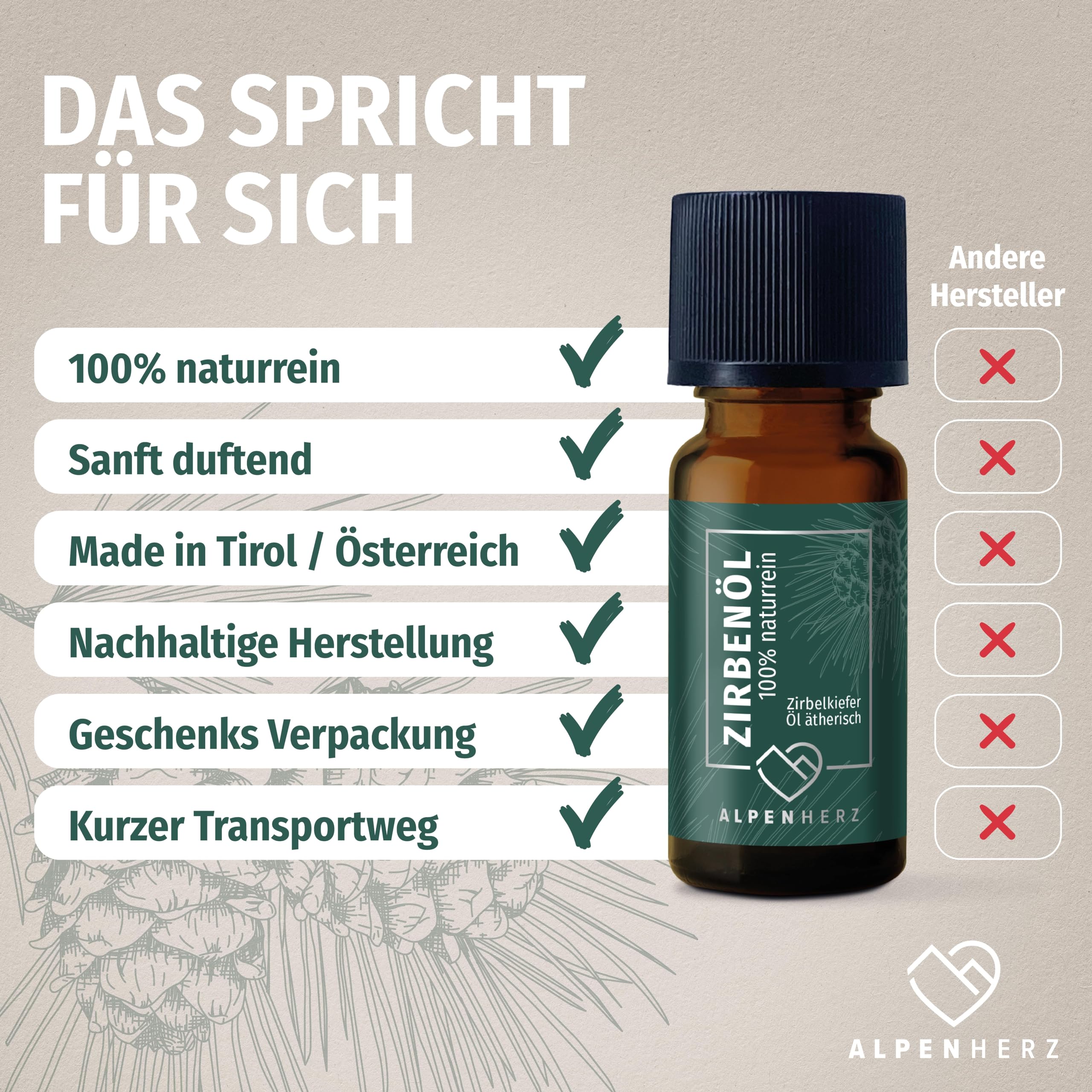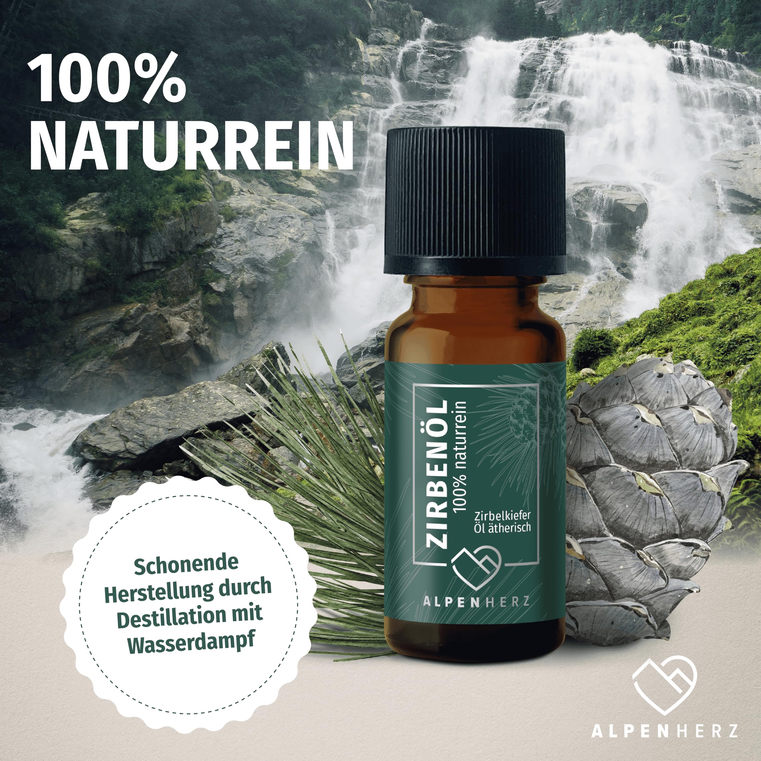 Alpenherz Zirbenöl 10 ml - 100% naturrein, ätherisches Zirbelkieferöl aus Österreich für Duftöl Raumduft Duftlampe Zirbenwürfel Diffuser Zirbe Lufterfrischer Zirbelkiefer Öl Geschenke
