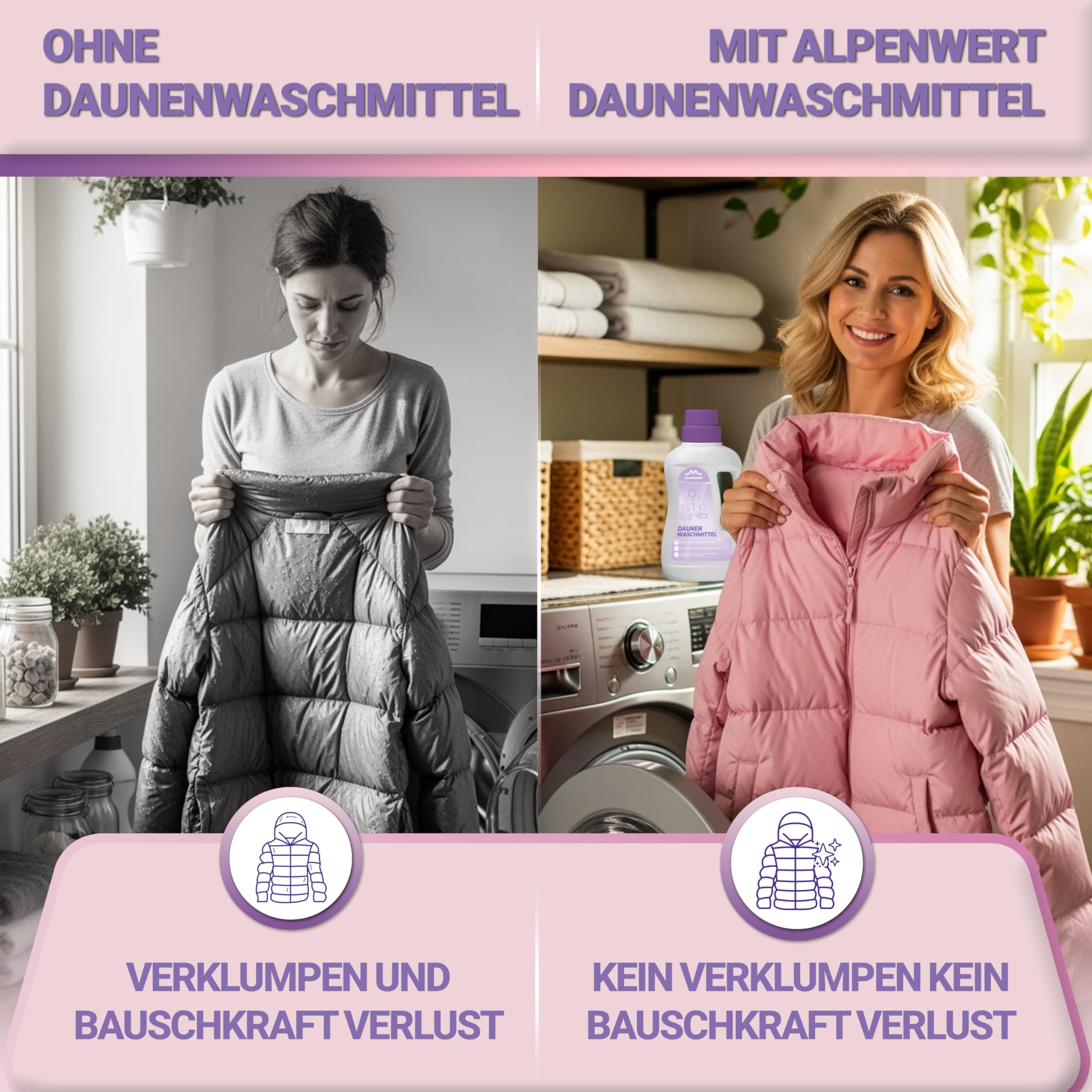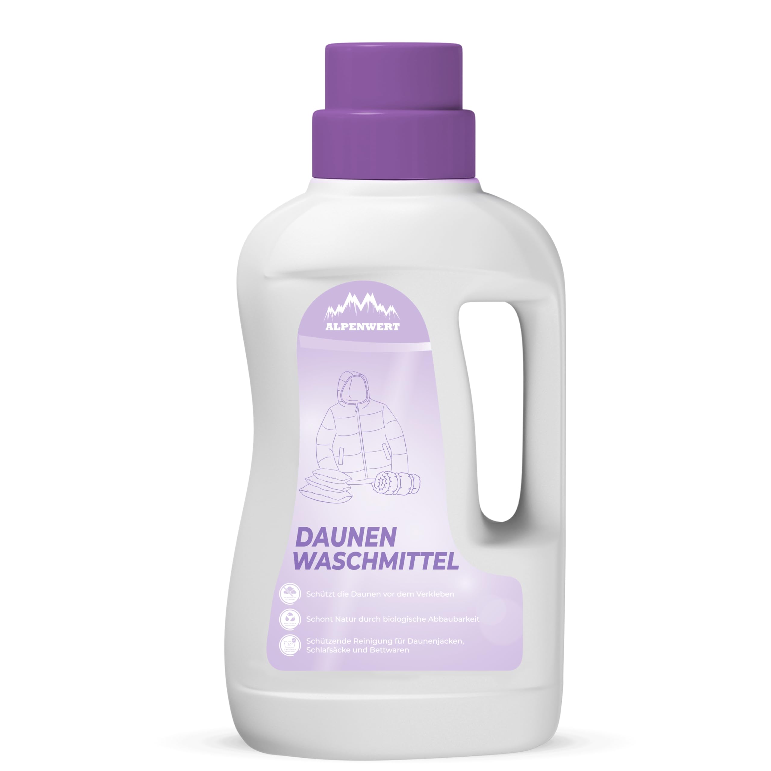 ALPENWERT® Daunenwaschmittel 1L - Spezialwaschmittel für Daunenjacken, Bettdecken, Schlafsäcke & Kissen - sanftes Waschmittel für fasertiefe Reinigung & Pflege mit frischem Duft - Made in Germany