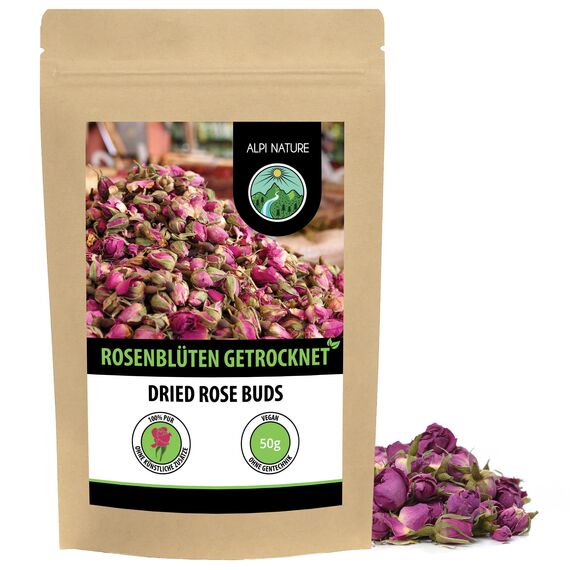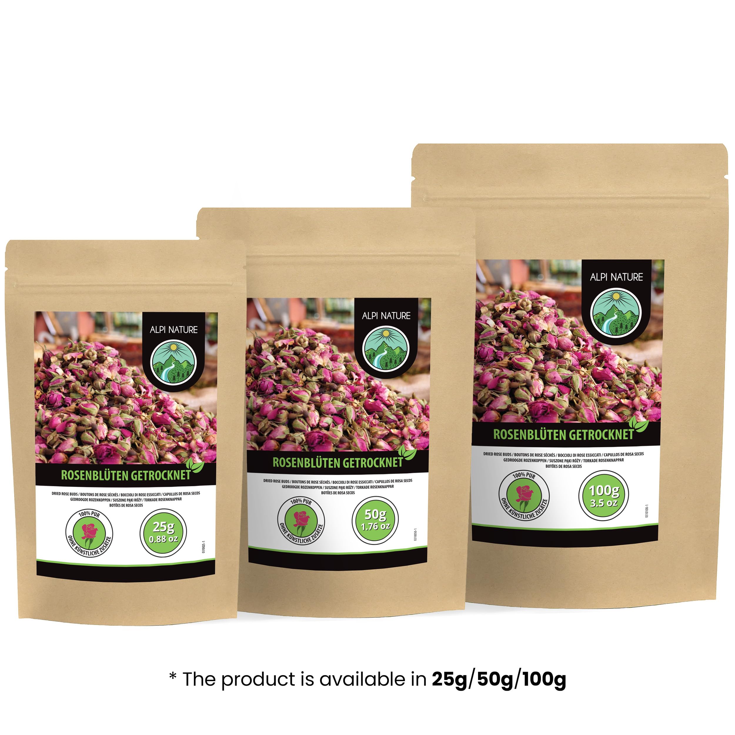 Mindestanzahl für die Bestellung von "Alpi Nature Rosenblüten getrocknet 50g, Rosenblüten Tee, Rosentee, ganze Rosenknospen getrocknet, Rosen Tee lose" ist 1.