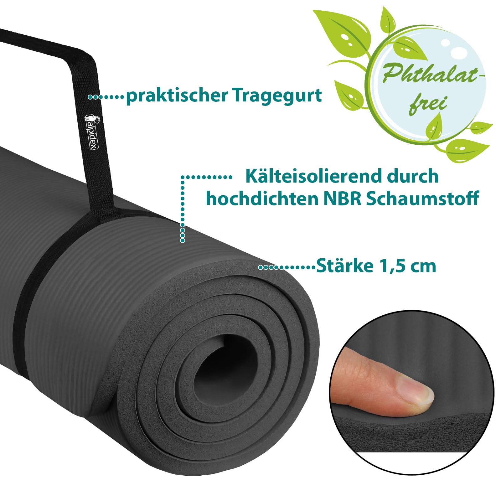 ALPIDEX Yogamatte Extra Dick 1,5 cm Gymnastikmatte 3 Grössen E-Book rutschfest Phthalatfrei Fitness Matte Turnen Pilates Sport Physio HIIT Yoga Trainingsmatte Isomatte
