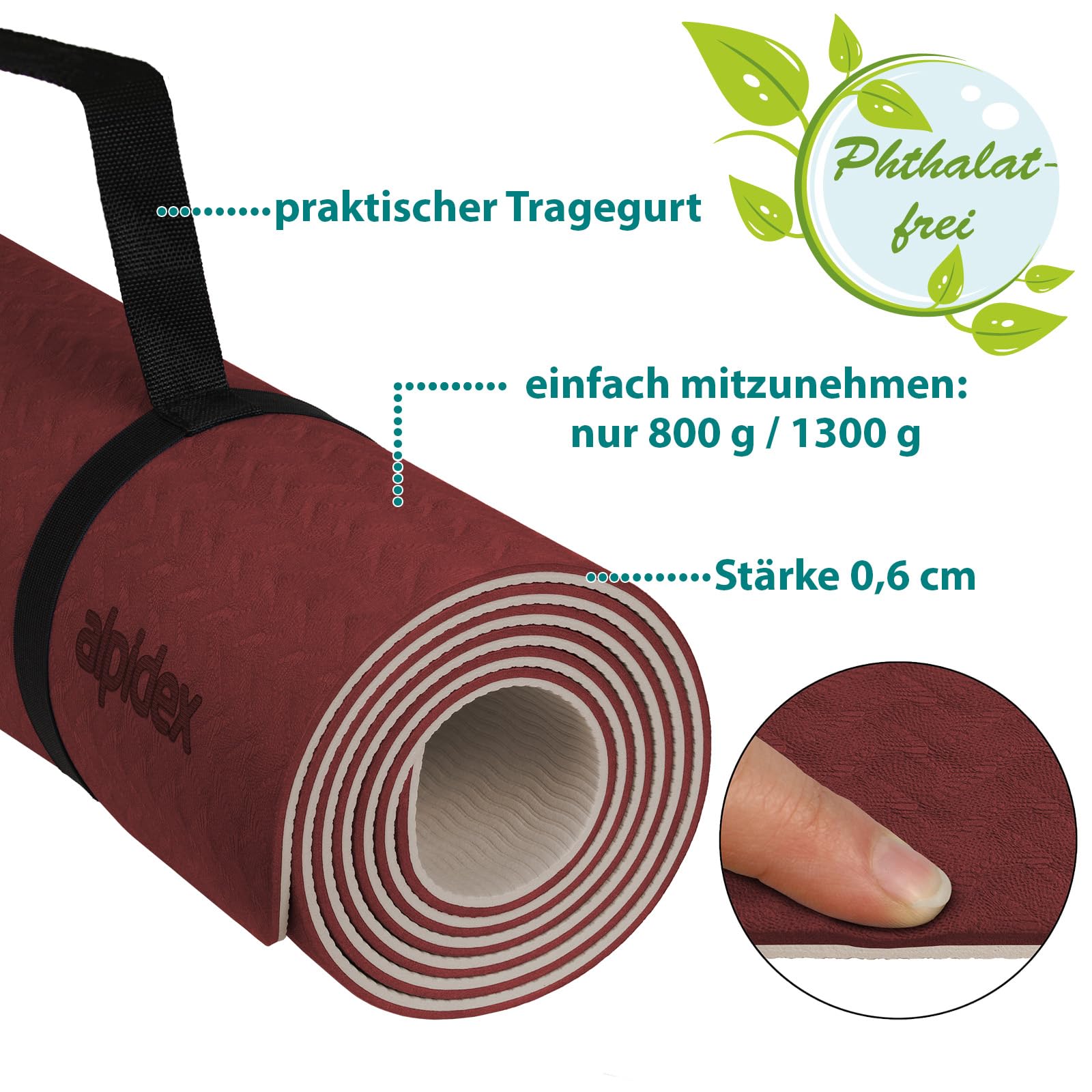 ALPIDEX Yogamatte rutschfest 190 x 61 x 0.6 cm | 190 x 90 x 0.6 cm E-Book Phthalatfreie Fitness TPE Matte Gymnastik Turnen Pilates Sport Yoga Trainingsmatte, Größe: 190 x 90 x 0.6 cm, Farbe: Bordeaux / Cream