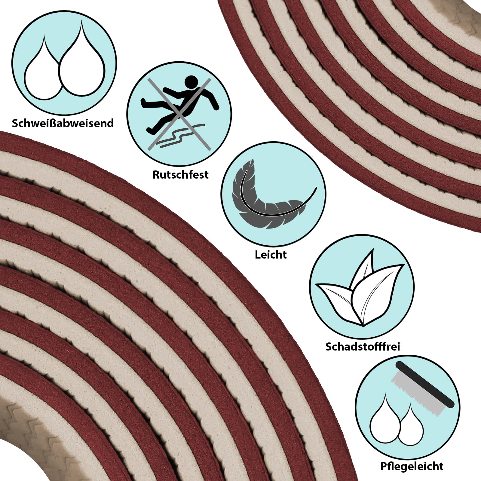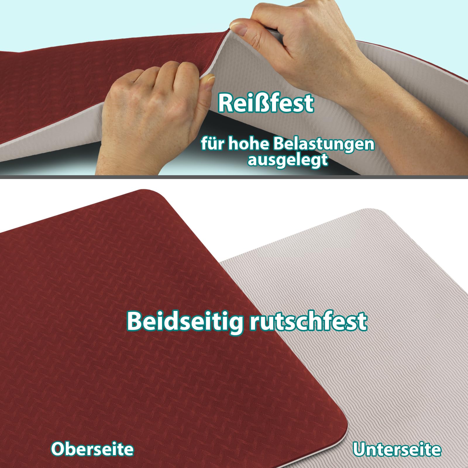 • RUTSCHFEST: durch die rutschfeste Eigenschaft des Materials bleibt die Gymnastikmatte immer an Ort und Stelle * die strukturierte Oberfläche sorgt zusätzlich für einen sicheren Halt bei allen Übungen