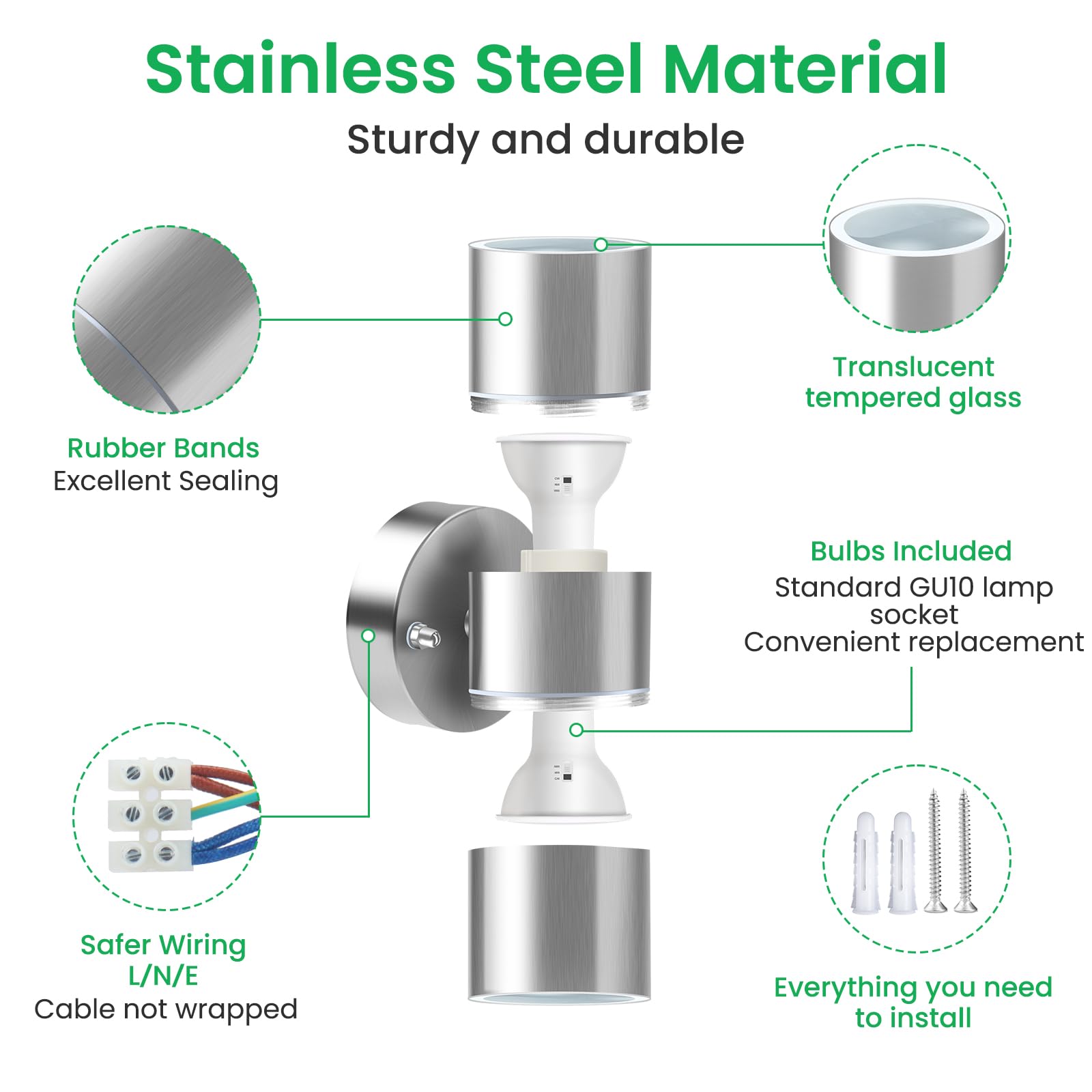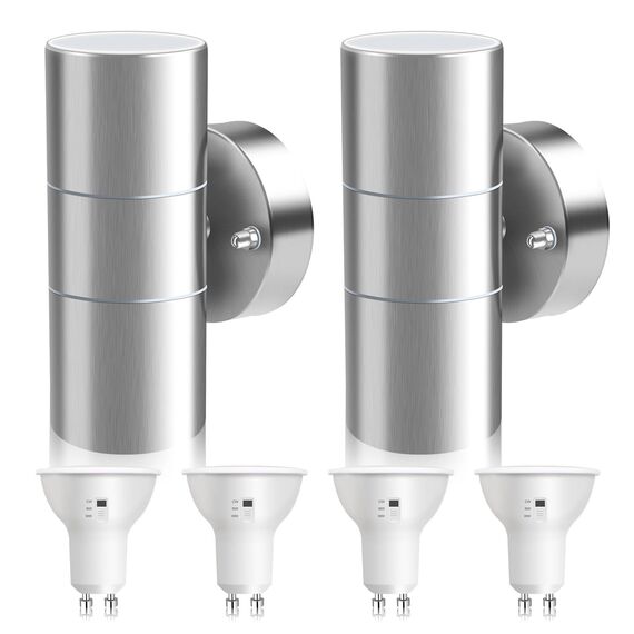 ALUSSO LIGHTING 2er Set Edelstahl LED Wandleuchte Innen/Aussen Up Down Aussenlampe, Wandlampe inkl. 4x 8W GU10 Glühbirnen 750LM 3000K/4000K/6000K Aussenlampe, Aussenleuchte IP65 Wasserdicht, Silber