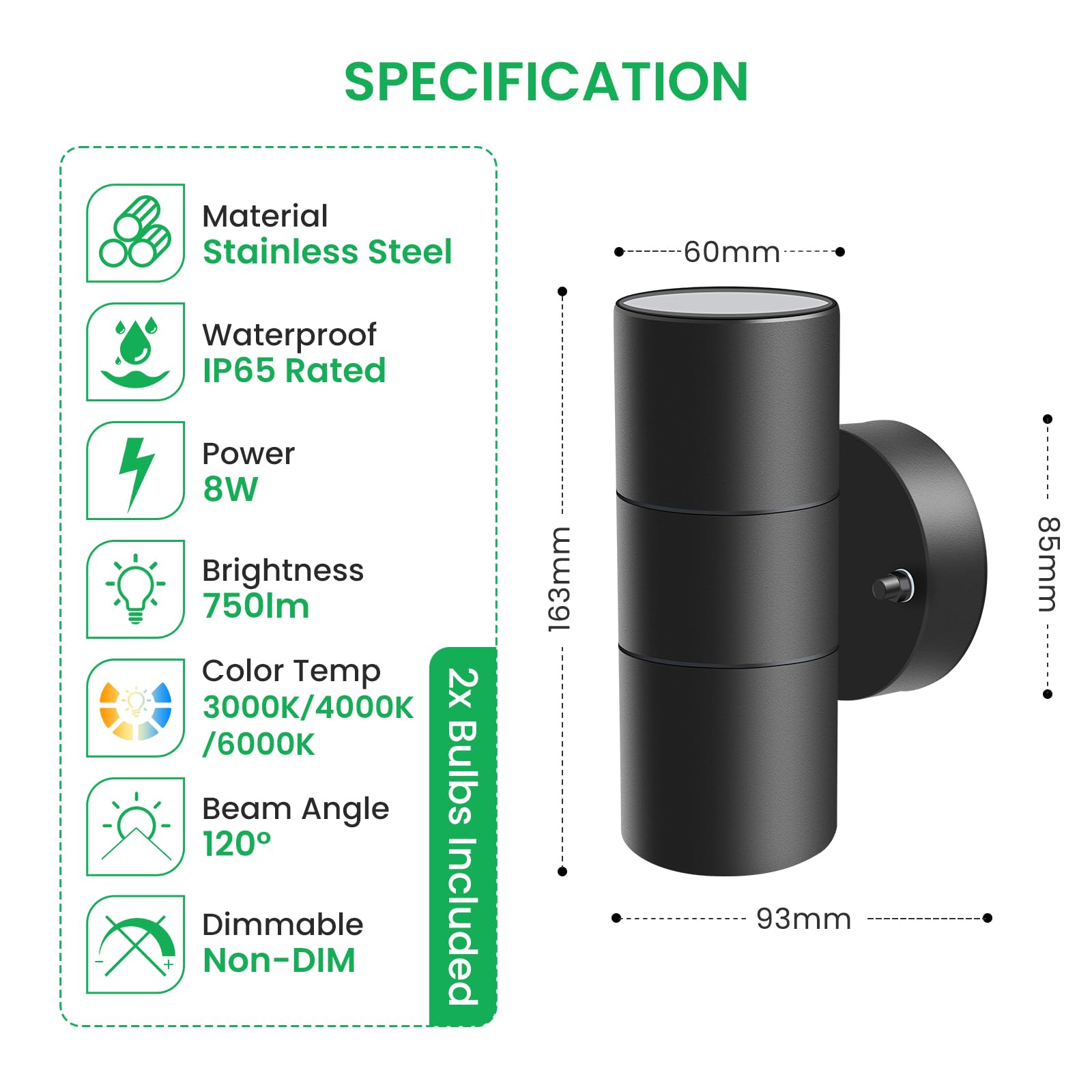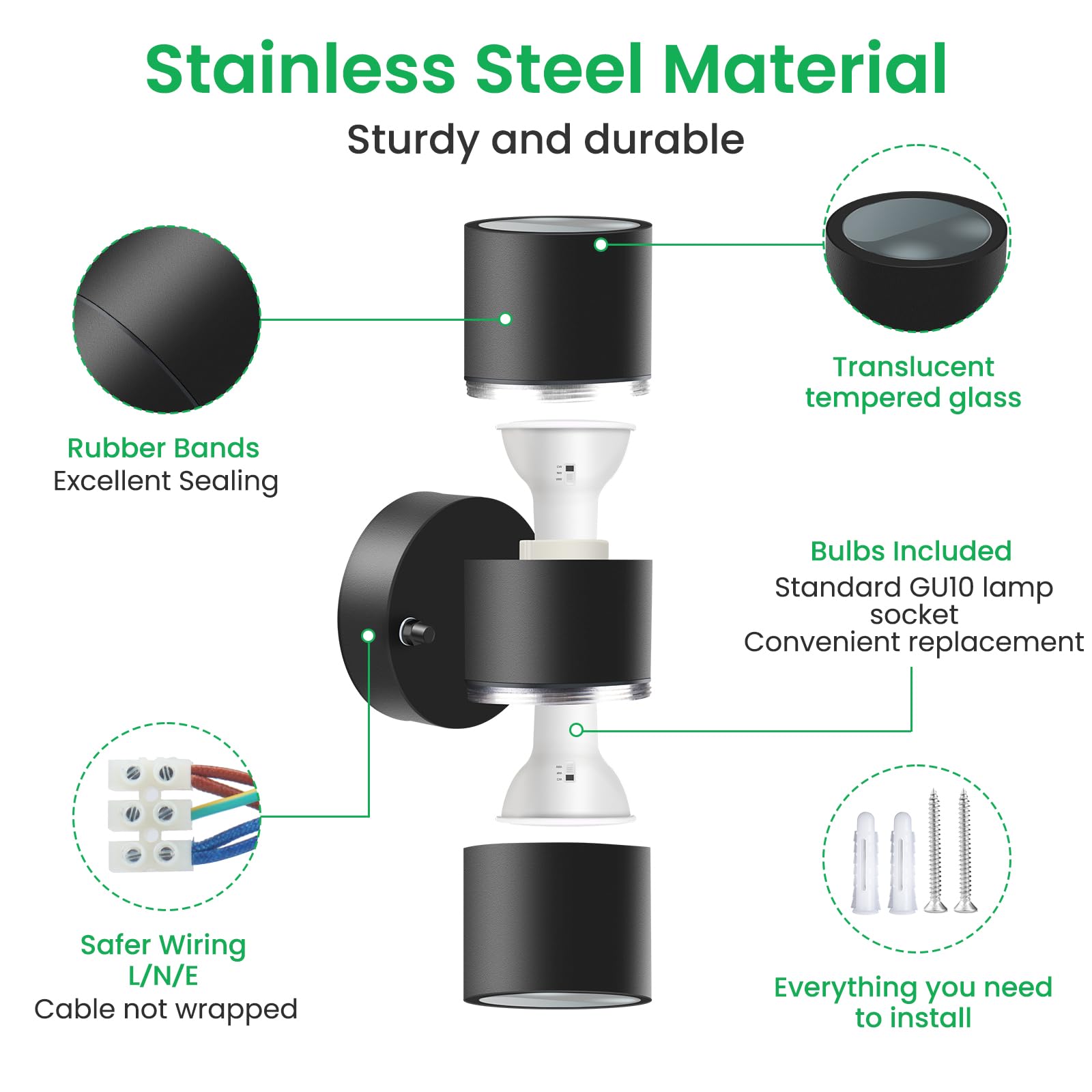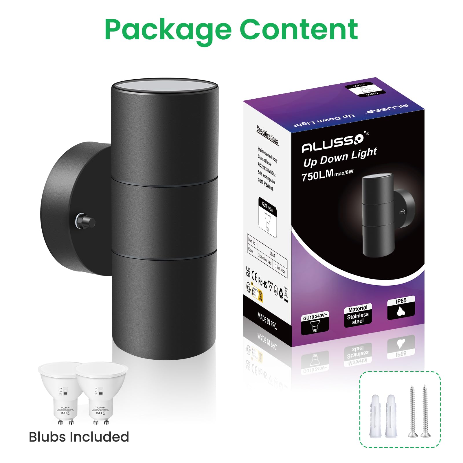 ALUSSO LIGHTING LED Aussenlampe Innen/Aussen Edelstahl Up Down Wandleuchte, Aussenlampe inkl. 2x 8W GU10 Glühbirnen 750LM 3000K/4000K/6000K Aussenleuchte, Wandlampe IP65 Wasserdicht für Garten, Schwarz