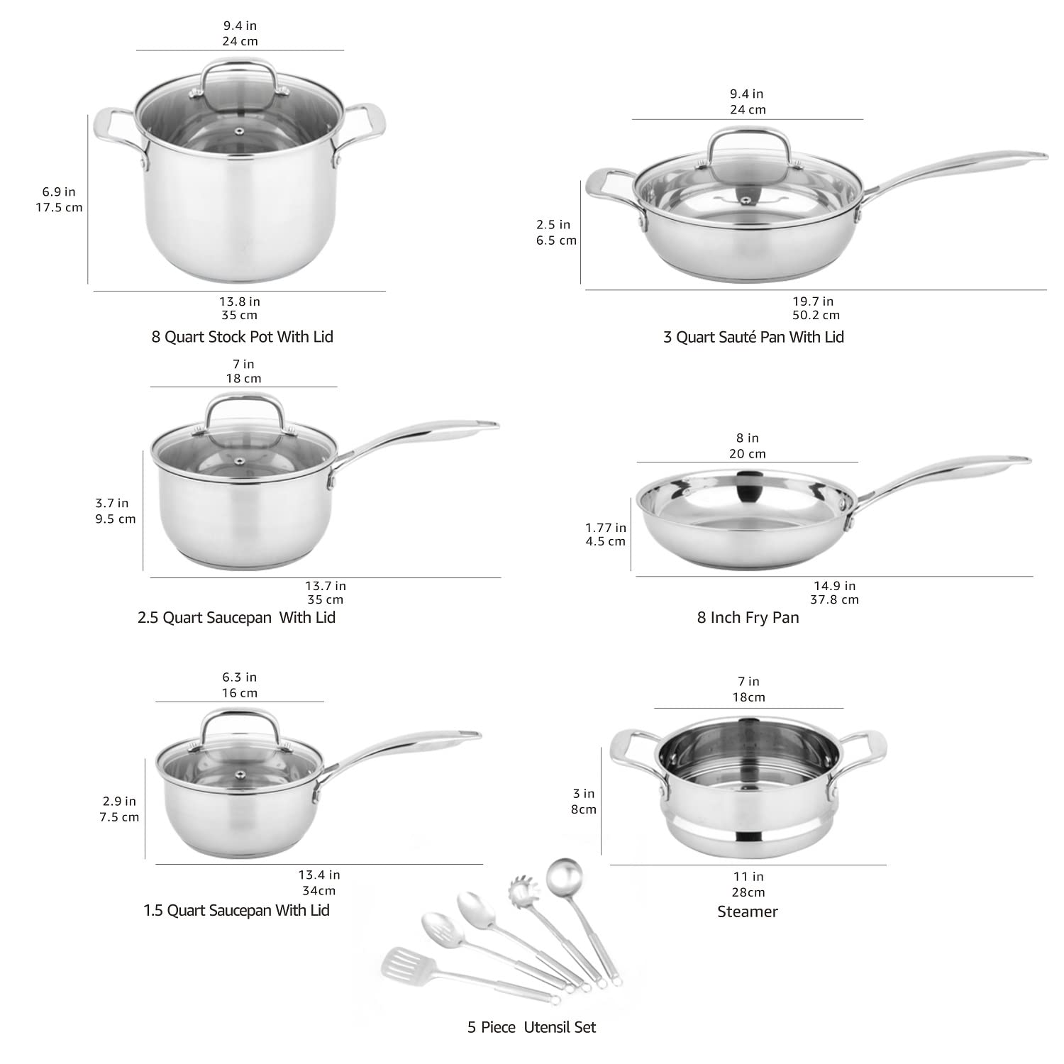Amazon Basics Kochgeschirr-Set, Edelstahl, 15Stück, Töpfe, Pfannen und Kochutensilien