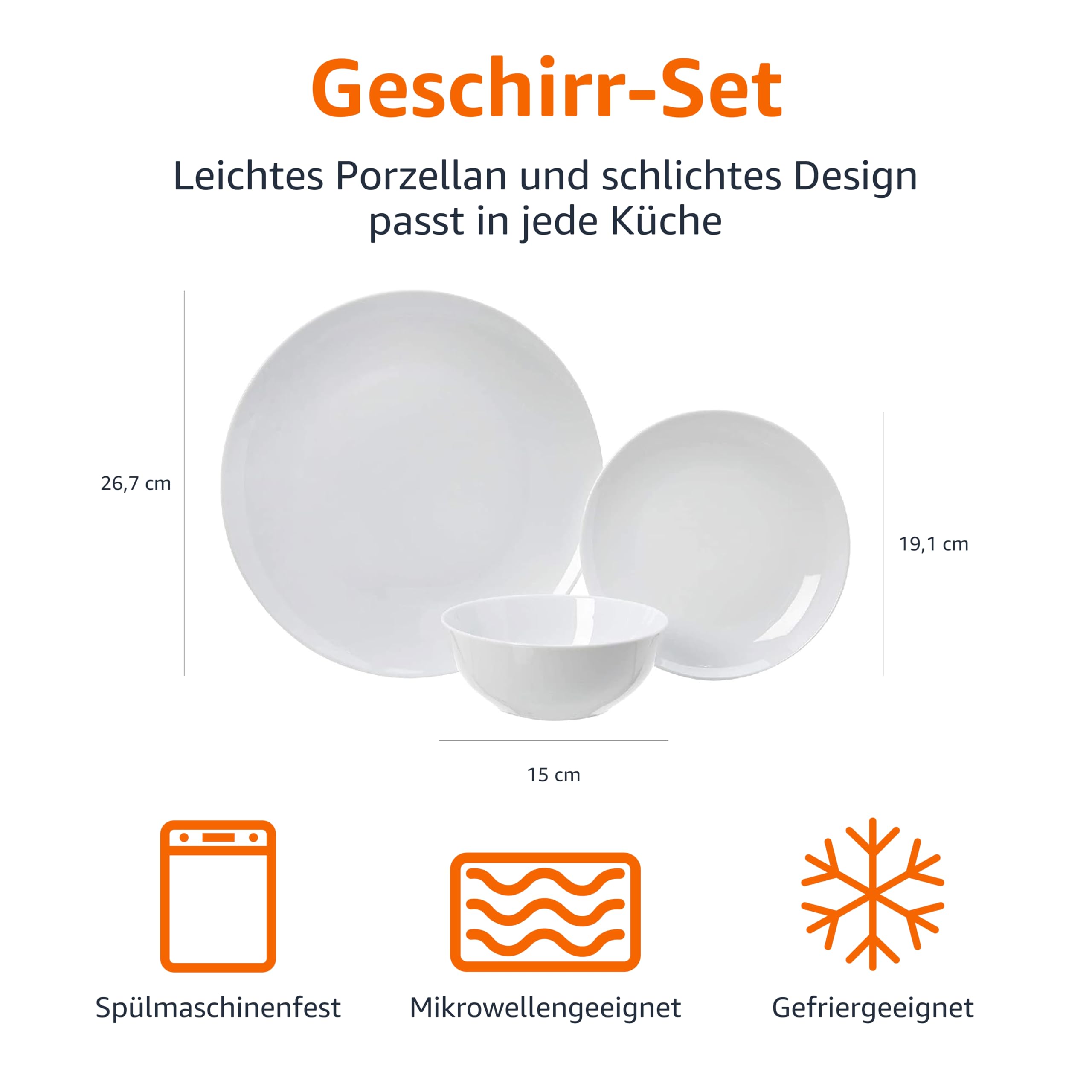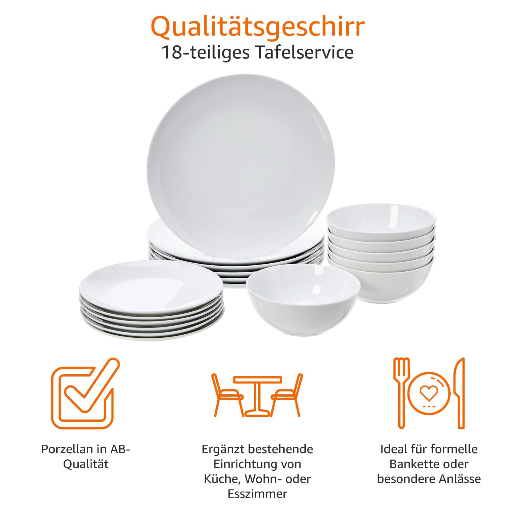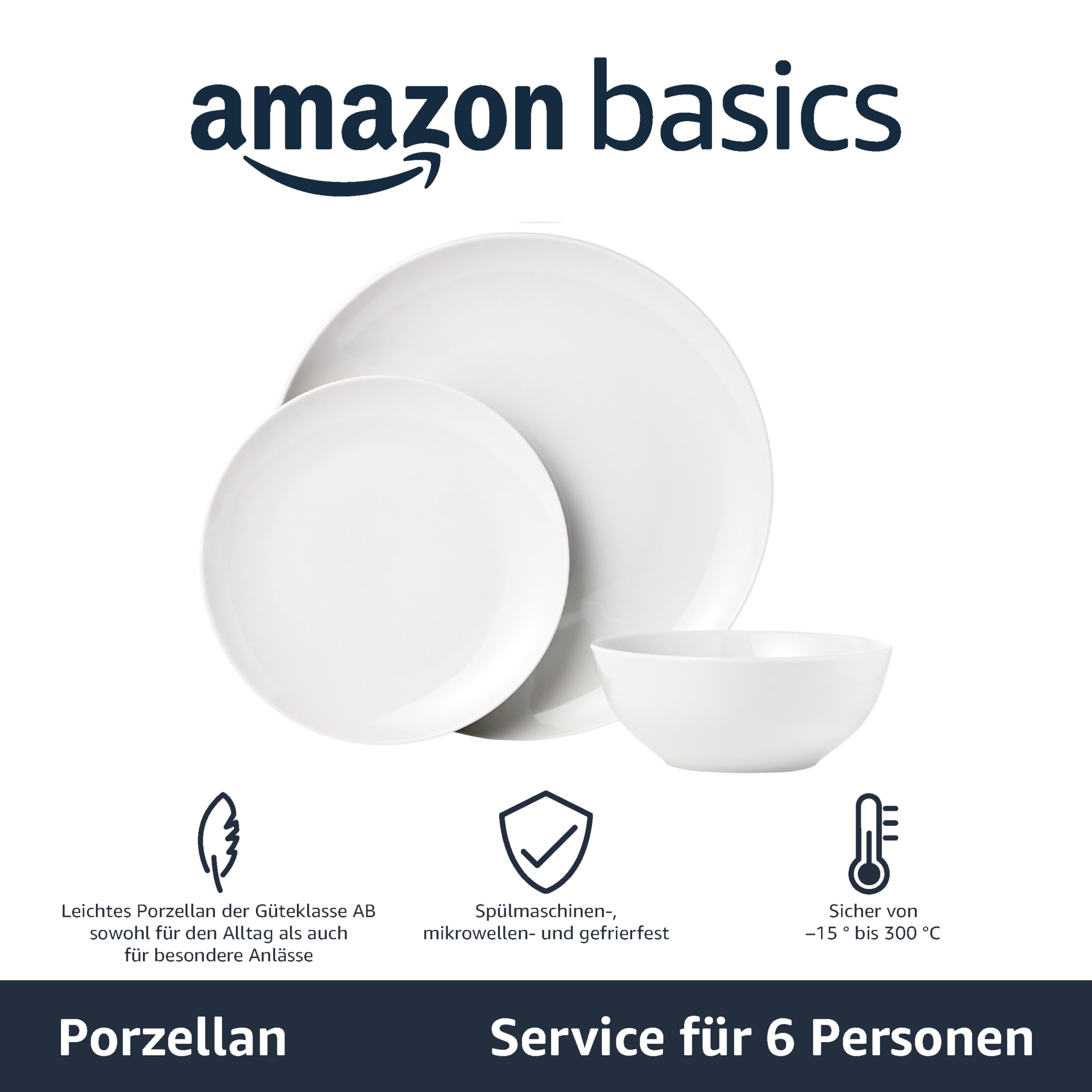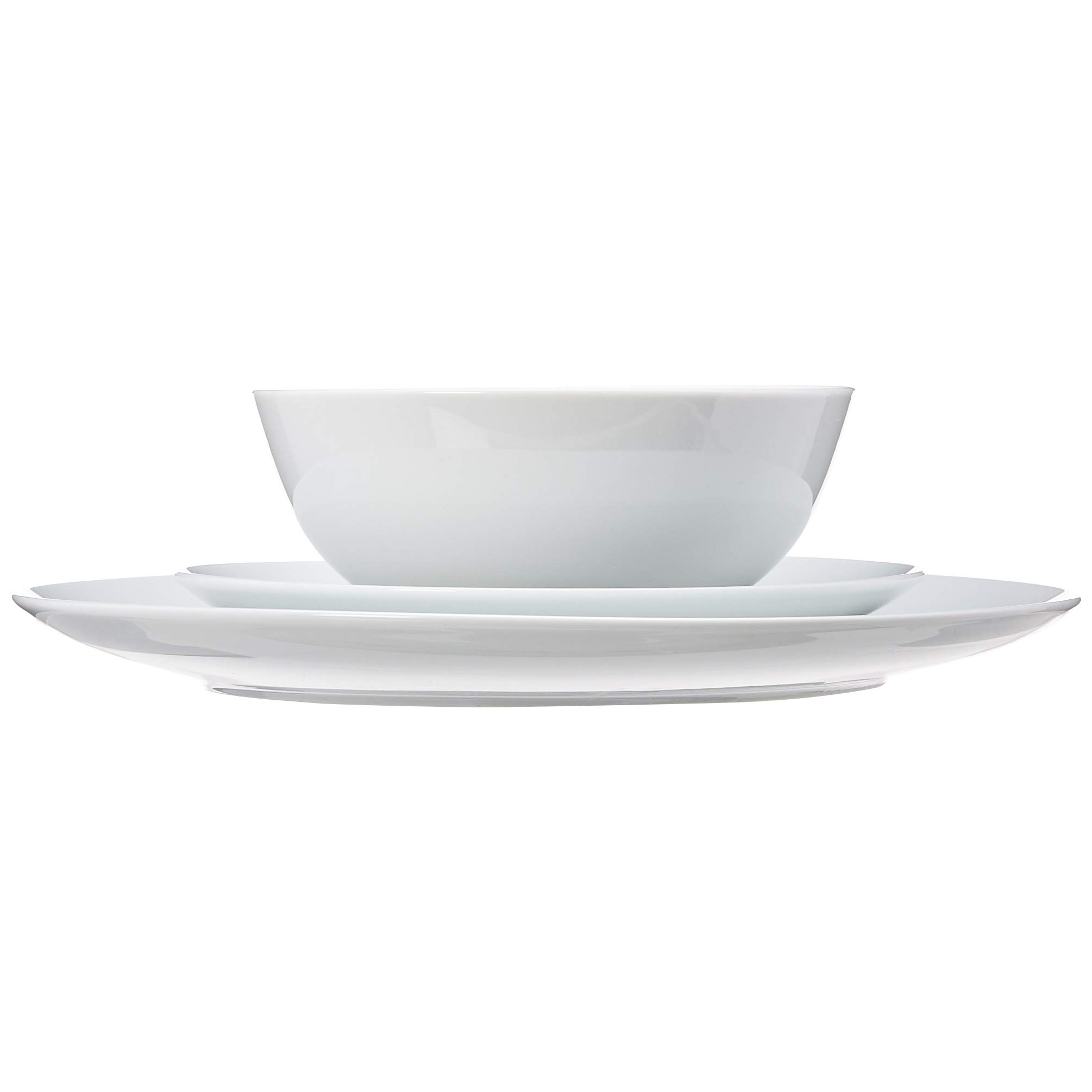 Amazon Basics Geschirrservice für 6 Personen, 18 Stück, Weisses Porzellan Coupe