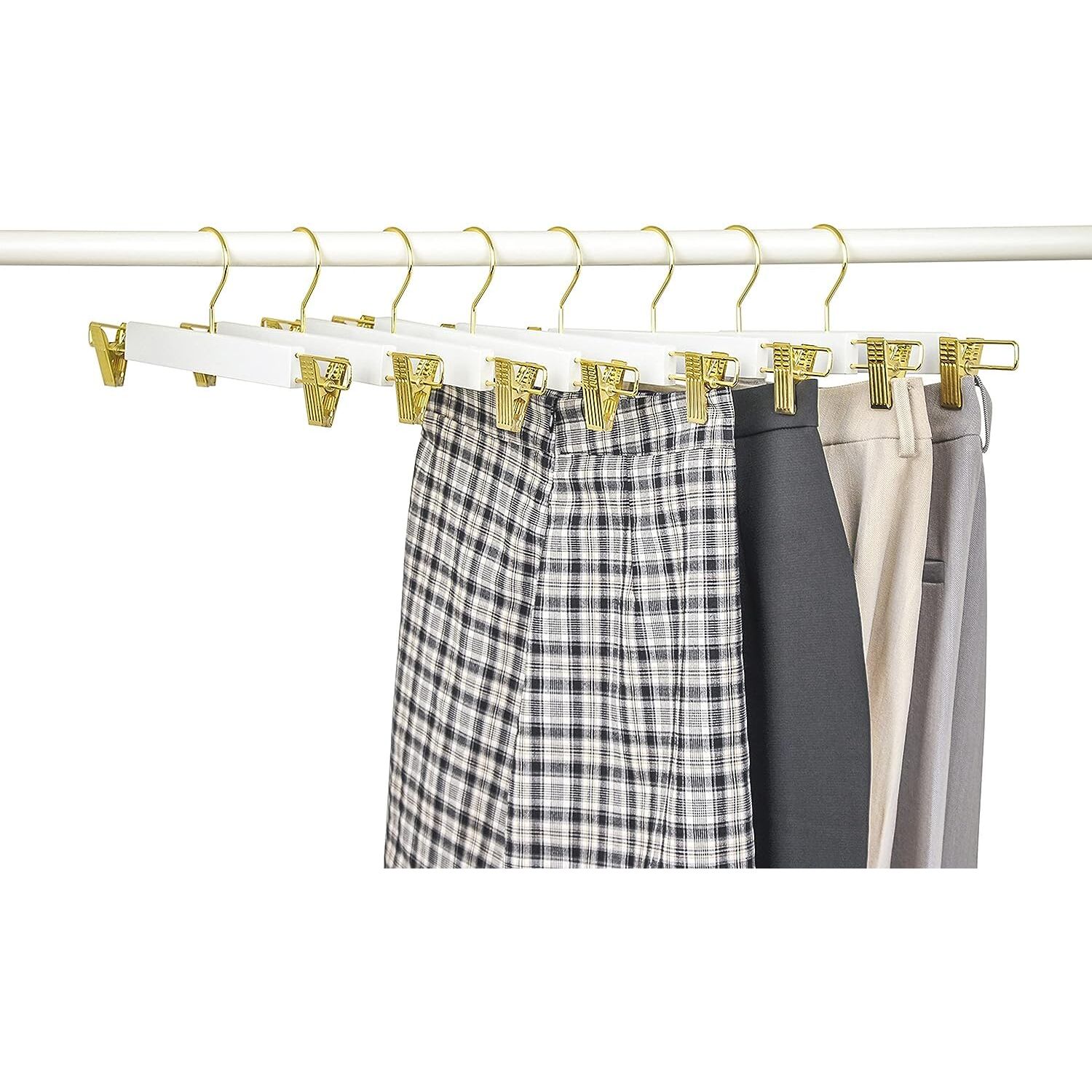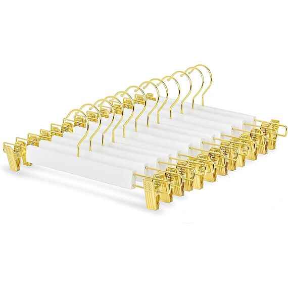 Amber Home 10 Stück 36cm Weiss Kleiderbügel aus Holz, Robust und Glänzend Hosenbügel Aufhänger für Hosen Shorts Rock Socken Unterwäsche, mit rutschfest Clips und Drehbar Haken (Gold 10)