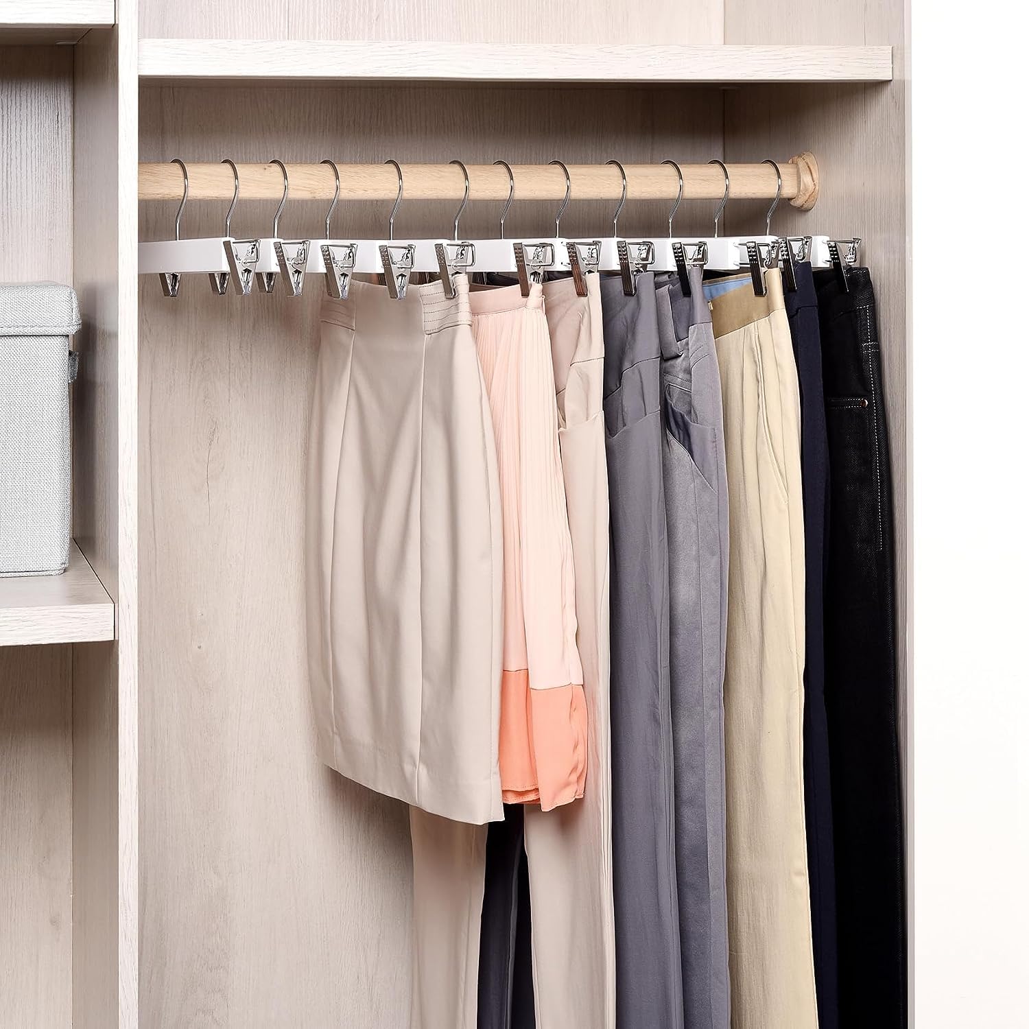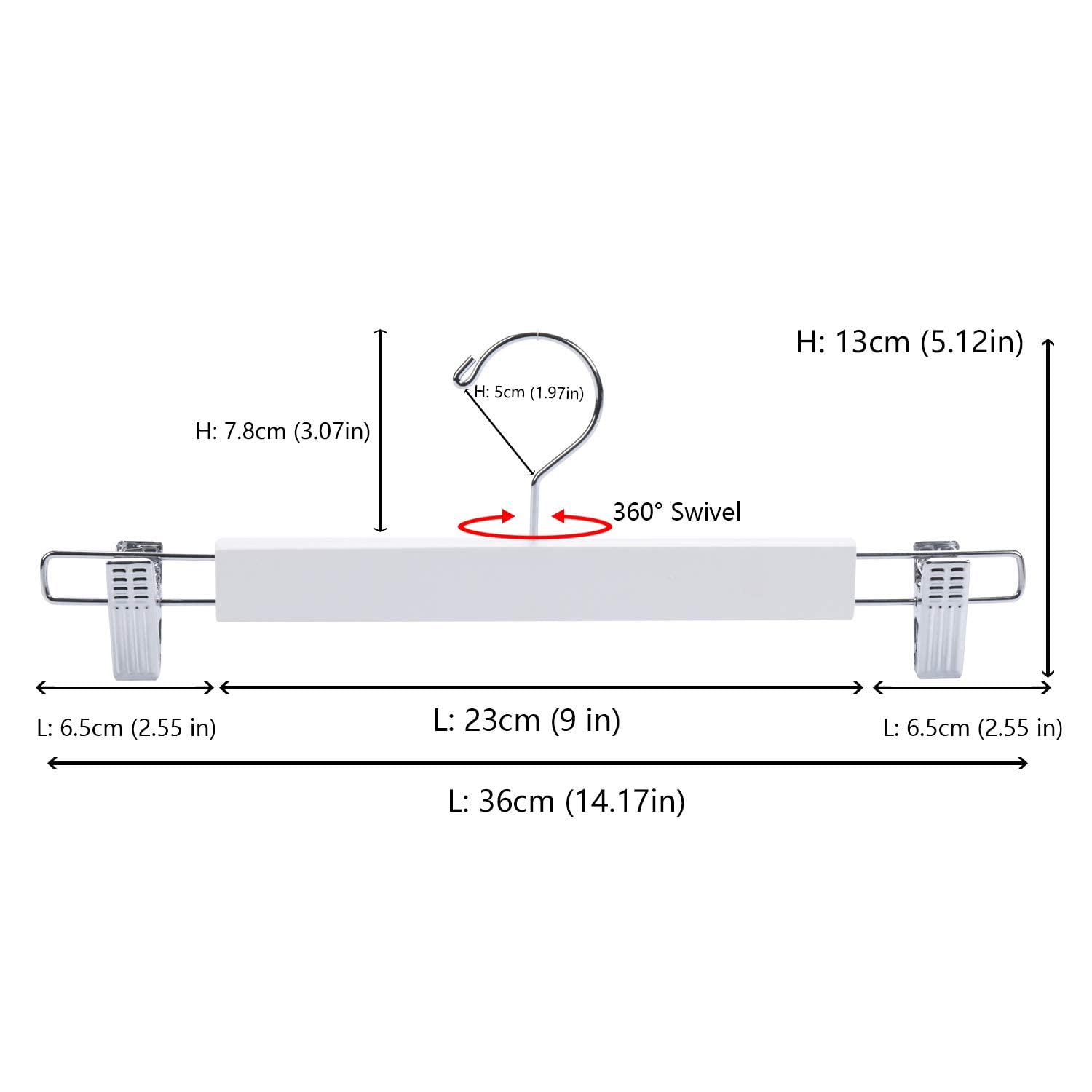 Amber Home 20 Stück 36cm Weiss Kleiderbügel aus Holz, Robust und Glänzend Hosenbügel Aufhänger für Hosen Shorts Rock Socken Unterwäsche, mit rutschfest Clips und Drehbar Haken