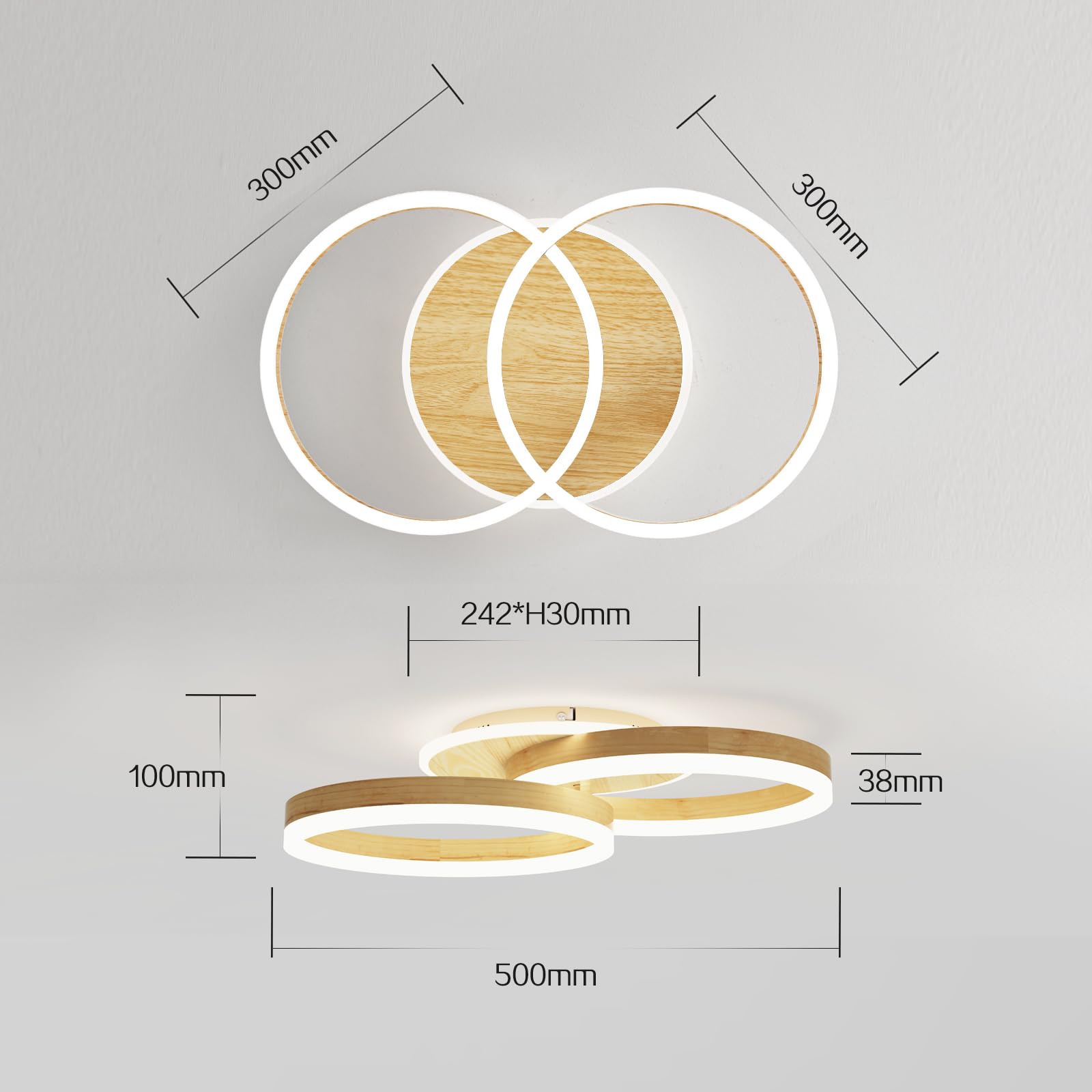 - [2-RINGEN-KREIS-DESIGN] Kreis ist ein klassisches geometrisches Element, diese Deckenlampe besteht aus 2 ausgehöhlten Ringen mit einem Durchmesser von 30 cm und einem massiven kleinen Kreis an der Basis, Die sich symmetrisch überschneidenden Ringe und die geordnete Verflechtung machen die Deckenlampe sehr vielschichtig und räumlich.
