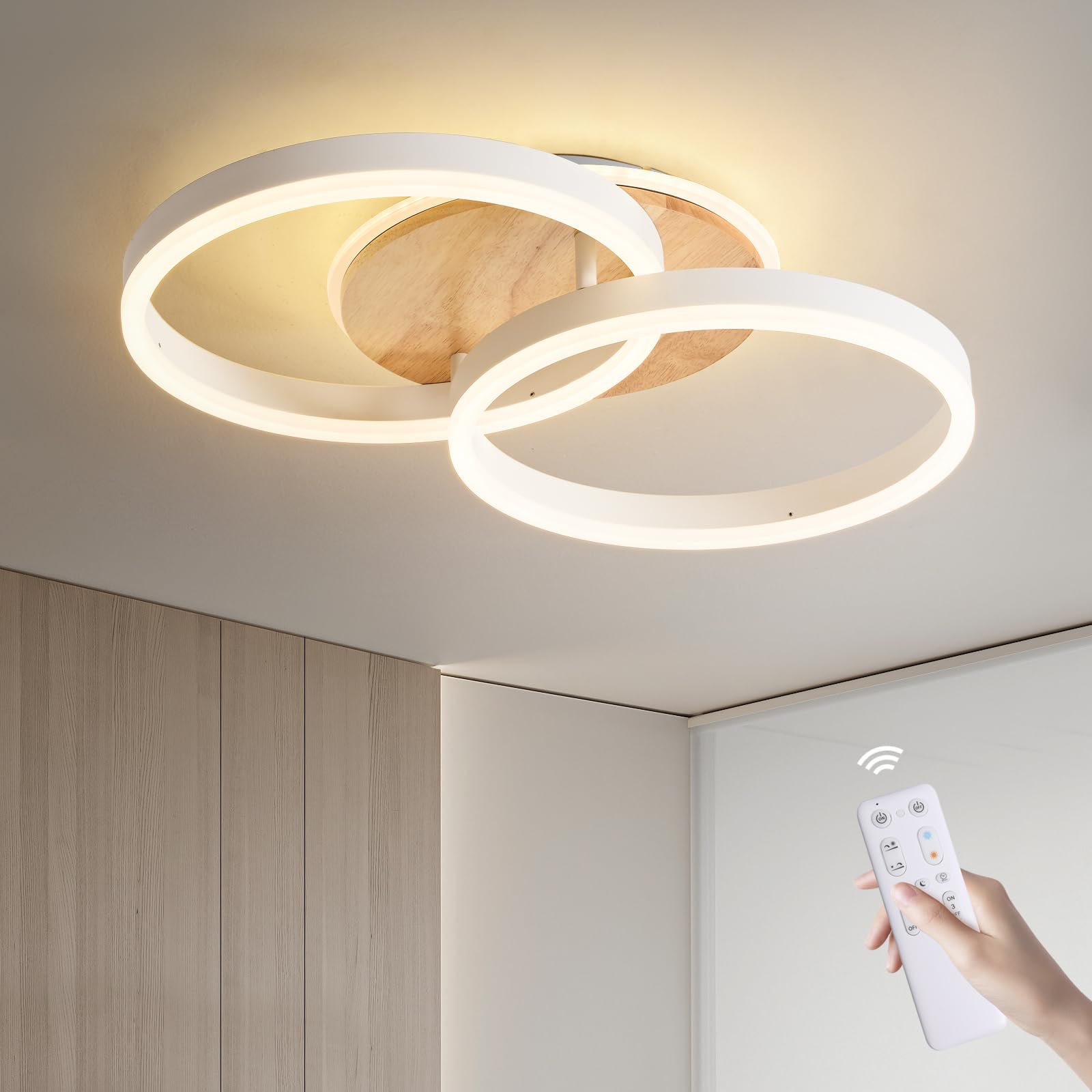 Amdelne LED Deckenlampe Wohnzimmer 50cm 2-Ringe Design, 36W Deckenleuchte Moderne mit Fernbedienung Dimmbar, aus Metall+Acryl, mit Speicherfunktion, für Schlafzimmer Esszimmer Büro, Weiss+holz