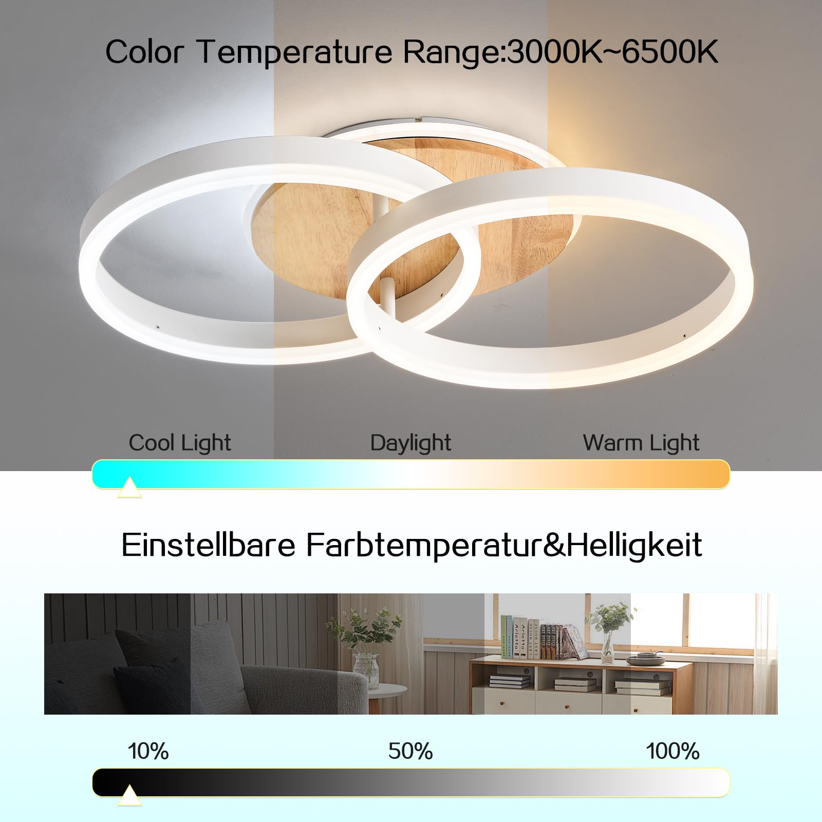 - [DECKENLAMPE MIT DIMMFUNKTION] Sie können die Deckenlampe personalisieren, indem Sie die Farbtemperatur (3000K-6500K) und die Helligkeit (10%-100%) präzise und feinfühlig über die Fernbedienung steuern, so dass die Deckenlampe Ihnen genau die richtige Lichtmenge spendet. Ausserdem können Sie über den Wandschalter zwischen den 4 Modi Warmweiss-Neutralweiss-Kaltweiss-Nachtlicht wechseln.