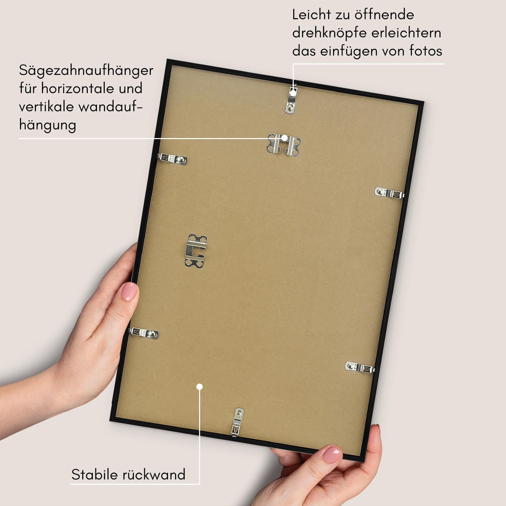 Der Americanflat 30x45 cm Kunststoff-Bilderrahmen zum Aufhängen - modern, klassisch und zeitlos Mit seinen nur 1,7 cm schlanken Rahmenleisten bietet dieser Bilderrahmen den perfekten Platz, um besondere Erinnerungen stilvoll zu präsentieren. Dank der robusten PVC-Konstruktion, einer stabilen Rückwand und der Kristallklare Abdeckung aus plexi-scheibe der Rahmen über viele Jahre hinweg erhalten und schützt das Bild vor Beschädigungen. Der Posterrahmen kann sowohl Quer- als auch im Hochformat an der Wand montiert werden - die dafür notwendige Aufhängevorrichtung ist bereits integriert. Rückwand und Glasscheibe sind mit Flexpoints im Rahmen fixiert, was einen unkomplizierten Bilderwechsel ermöglicht. Der Bilderrahmen passt hervorragend zu unterschiedlichsten Wohnungseinrichtungen und ist nicht nur im Wohnzimmer ein Hingucker - er macht sich auch wunderbar in der Küche, im Gästezimmer oder im Büro. Mit seinem zeitlosen Design ist er auch in Cafés oder Restaurants eine stilvolle Ergänzung. Americanflat bietet ein umfangreiches Sortiment an stylishen und modernen Rahmen für Ihr Zuhause. Seit 2015 begeistert das amerikanische Unternehmen mit Sitz in New York seine Kunden mit hochwertigen Rahmen aller Art und Wohnaccessoires. Geschätzt und beliebt bei Millionen von Haushalten in ganz Amerika - und jetzt auch bei uns in Deutschland. Entdecken Sie die vielfältige Auswahl von Americanflat und lassen Sie sich von Qualität und Design begeistern.