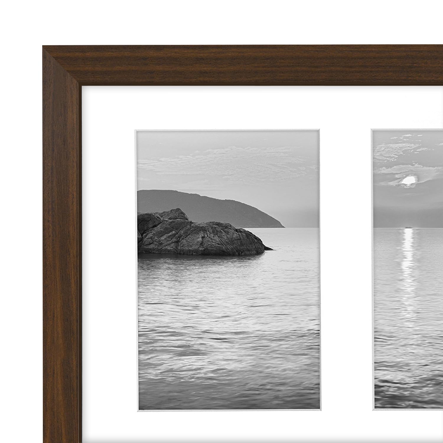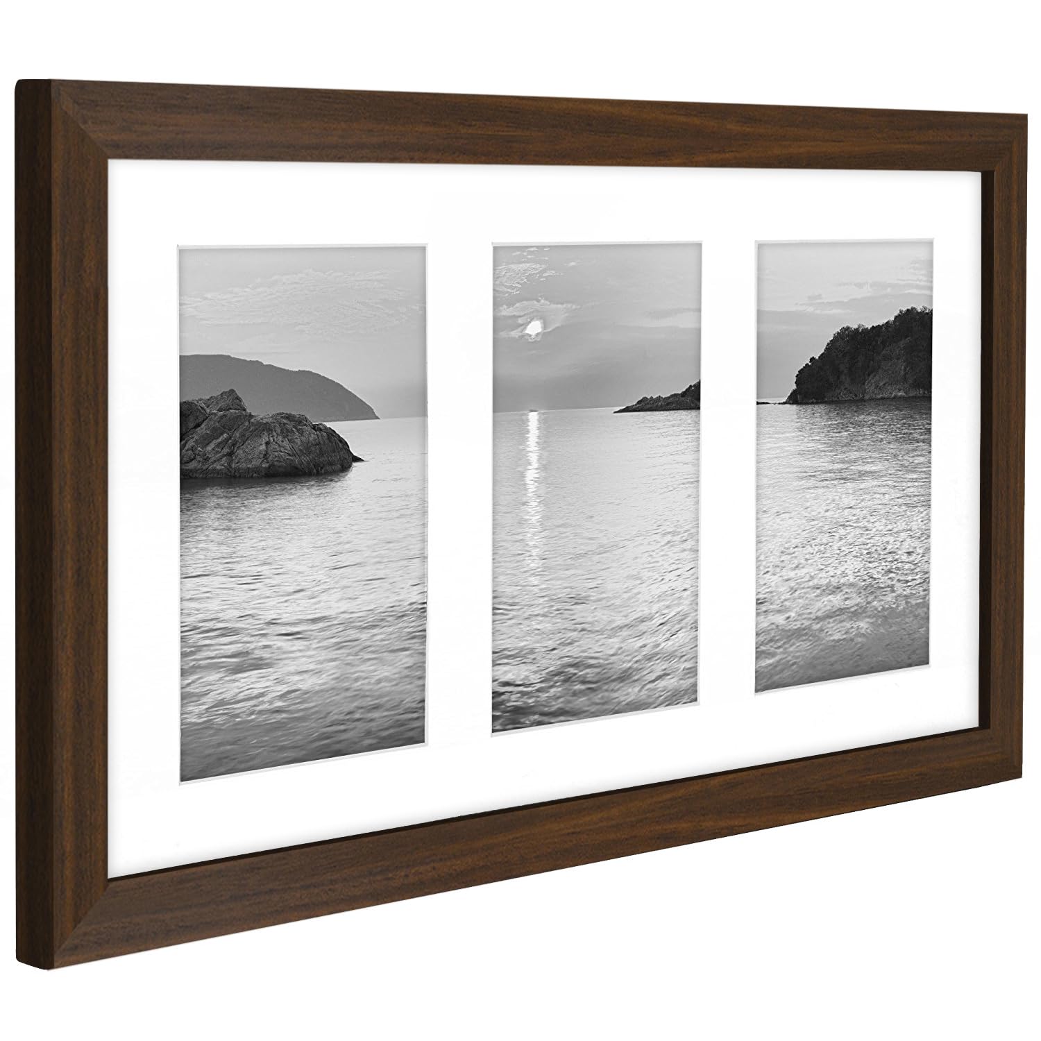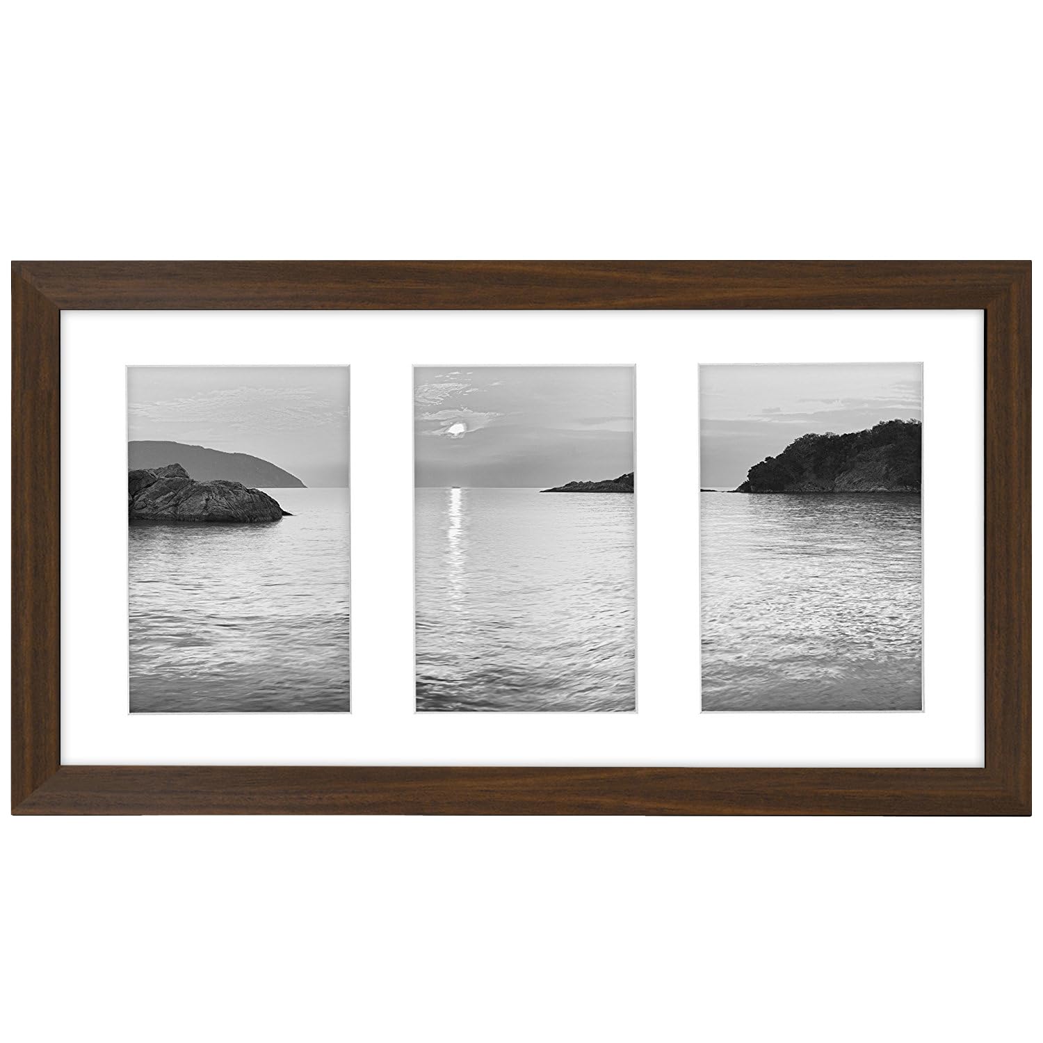 We are dedicated to providing quality frames that will allow your keepsake to be prominent and maintain its distinction through time. Our Walnut Collage Picture Frame comes with an acid-free white mat with three 4x6 inch openings elegantly placed side by side. The actual mat opening is 0. 5 inch smaller. It is designed to hold 4x6 inch pictures in place. We recommend taping the photos to the back of the mat. This is great for displaying three of your favorite memories together in one frame. Our Collage Picture Frame is crafted for durability and the glass front will preserve your document for years to come. It is simple and easy to use. The easy-open tabs allow you to load your pictures quickly and fit securely. Order your collage frame now and join thousands of other satisfied customers who love our products.