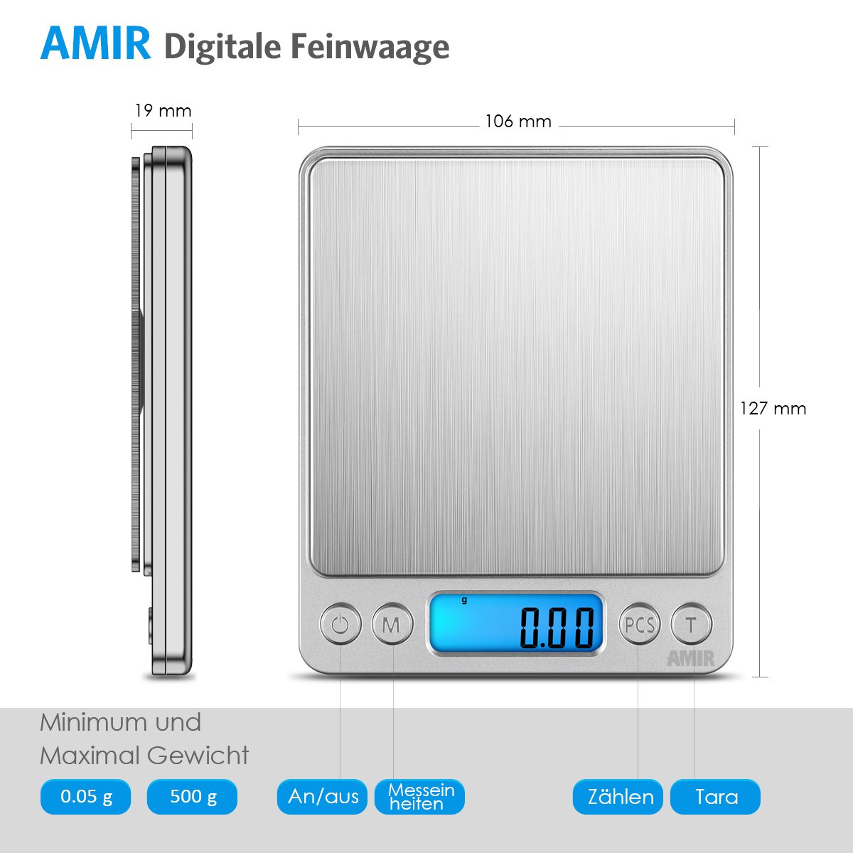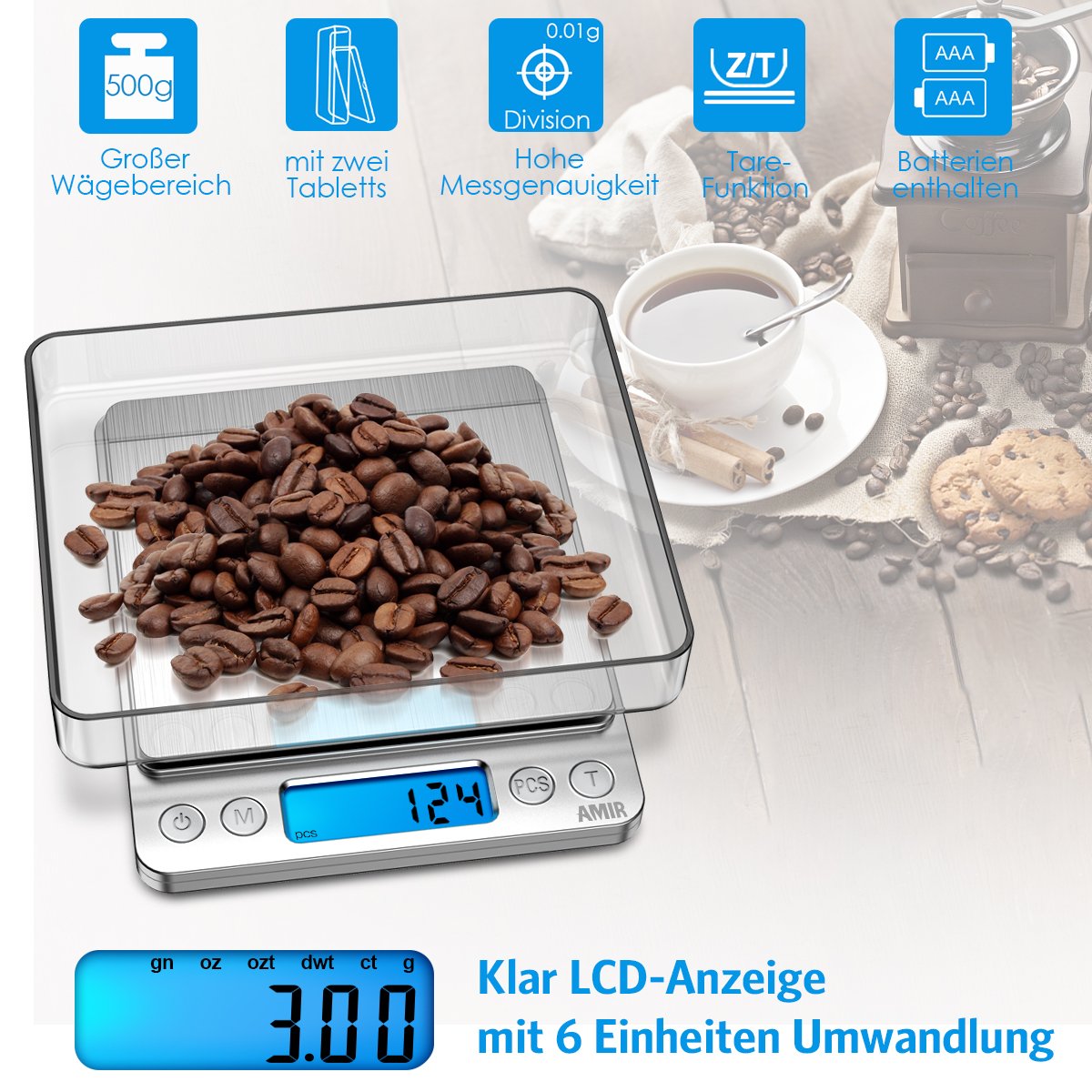 AMIR Feinwaage 0.01g, Digitalwaage 500g/0.01g Taschenwaage, Briefwaage, Grammwaage, Digital Feinwaage mit PCS Funktion, Tara-Funktion, 6 Einheiten Konvertierung, LCD-Display, Auto-Off