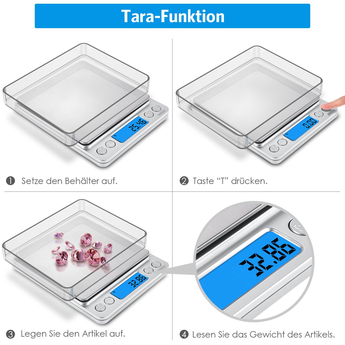 Size Name:Digitalwaage, Haushaltswaage, waageDie hochpräzise und mit grosser Kapazität digitale waage können Sie Ihre persönlichen und kommerziellen Bedürfnisse zu erfüllen - ideal für Wohnungen, Küchen, Büros, etc. Es gibt viele Dinge die wir in unserem täglichen Leben messen müssen: die genaue Menge an Mehl für den nächsten Kuchen, die beste Menge an Reis für das neue indische Rezept oder auch die korrekte Menge an Medikamenten. Unsere Amir Präzisionswaage lässt Sie hierbei nie im Stich. Technische DatenStückzählen: 25 ,50 ,65 ,75 ,100Umschaltbar zwischen G, OZ, OZT, DWT, GN, CT500g TragkraftProduktgrösse: 127mm*106mm*19 mm(L * W * H)Packungsgrösse: 735 mm *365 mm *19 mm Nettogewicht: 21KGPackungsinhalt1x Digitale Taschenwaage 2x Wiegeschalen1x HandbuchGarantien: