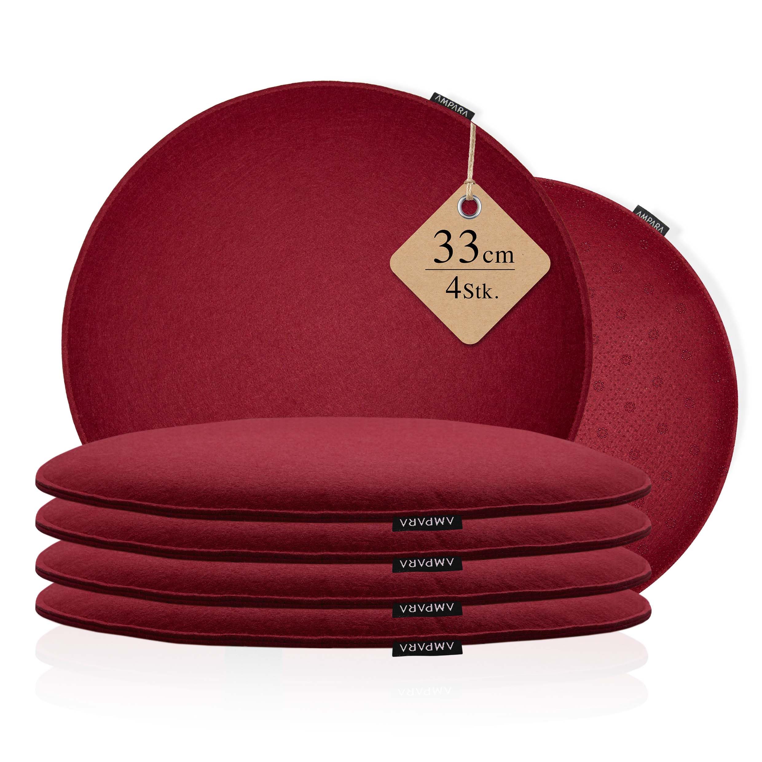 Ampara - 4er Set Stuhlkissen rund 33 cm - rutschfest & Gemütlich - Sitzkissen Filz rund | für Stuhl, Bank, Hocker etc. (Weinrot)