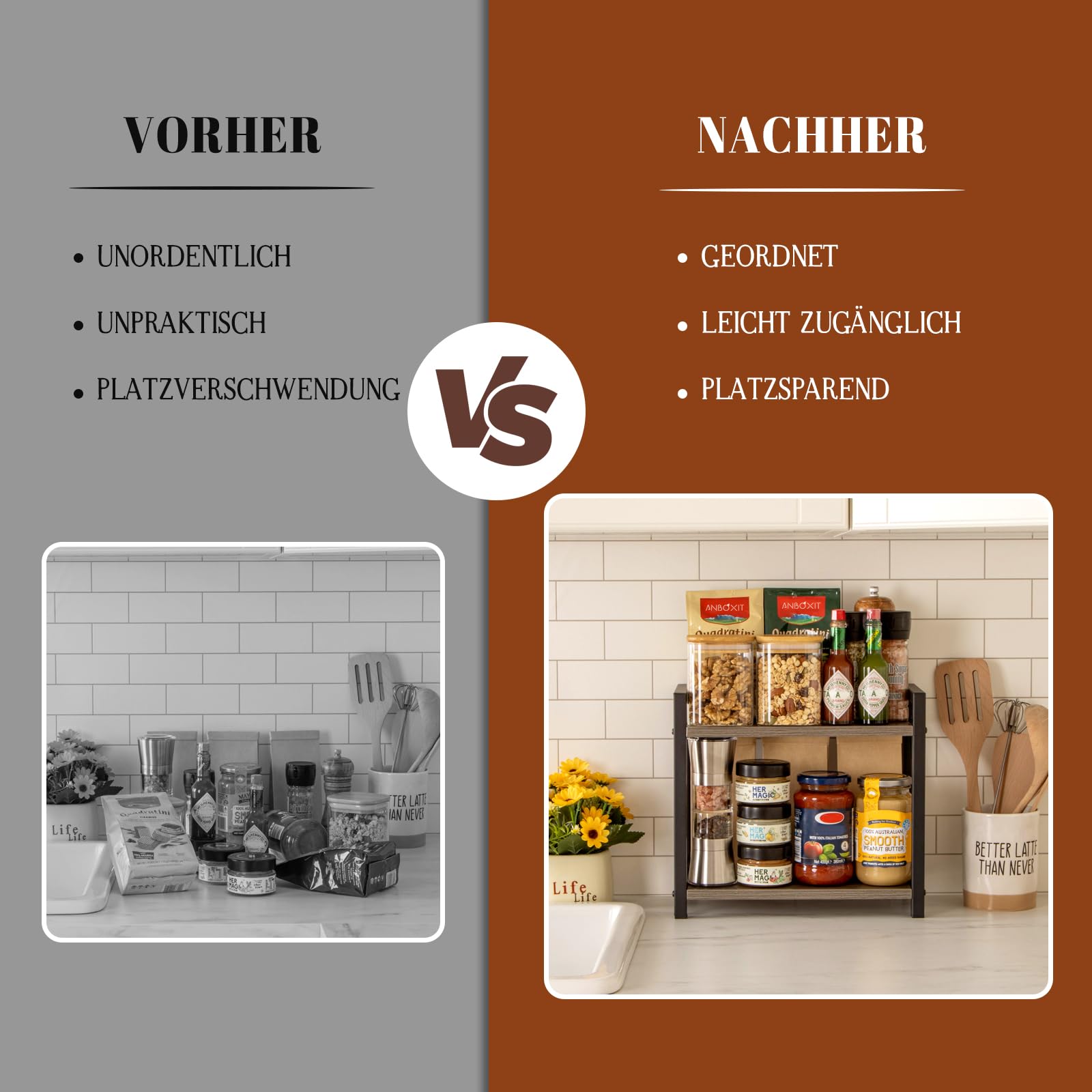 - MULTIFUNKTIONALER ARBEITSPLATTENREGAL: Unser arbeitsplattenorganizer ist nicht nur für Gewürze gedacht - er ist eine vielseitige Aufbewahrungslösung. Lagern Sie Kaffeebohnen, Sirup, Gewürze, Saucen, Snacks, Vitamine, Nahrungsergänzungsmittel und mehr mühelos. Er dient auch als grossartiger kaffee organizer und kann in Büros, Badezimmern, Schlafzimmern und mehr verwendet werden. Seine robuste Konstruktion gewährleistet Langlebigkeit und Stabilität, egal wo Sie ihn platzieren.