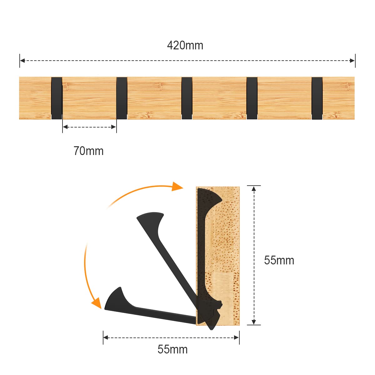 Anjuer Garderobenständer, Wandmontage, Kleiderständer, 5 einziehbare Haken, robust, Huthalter, Bambusbrett, Haken, Schwarz