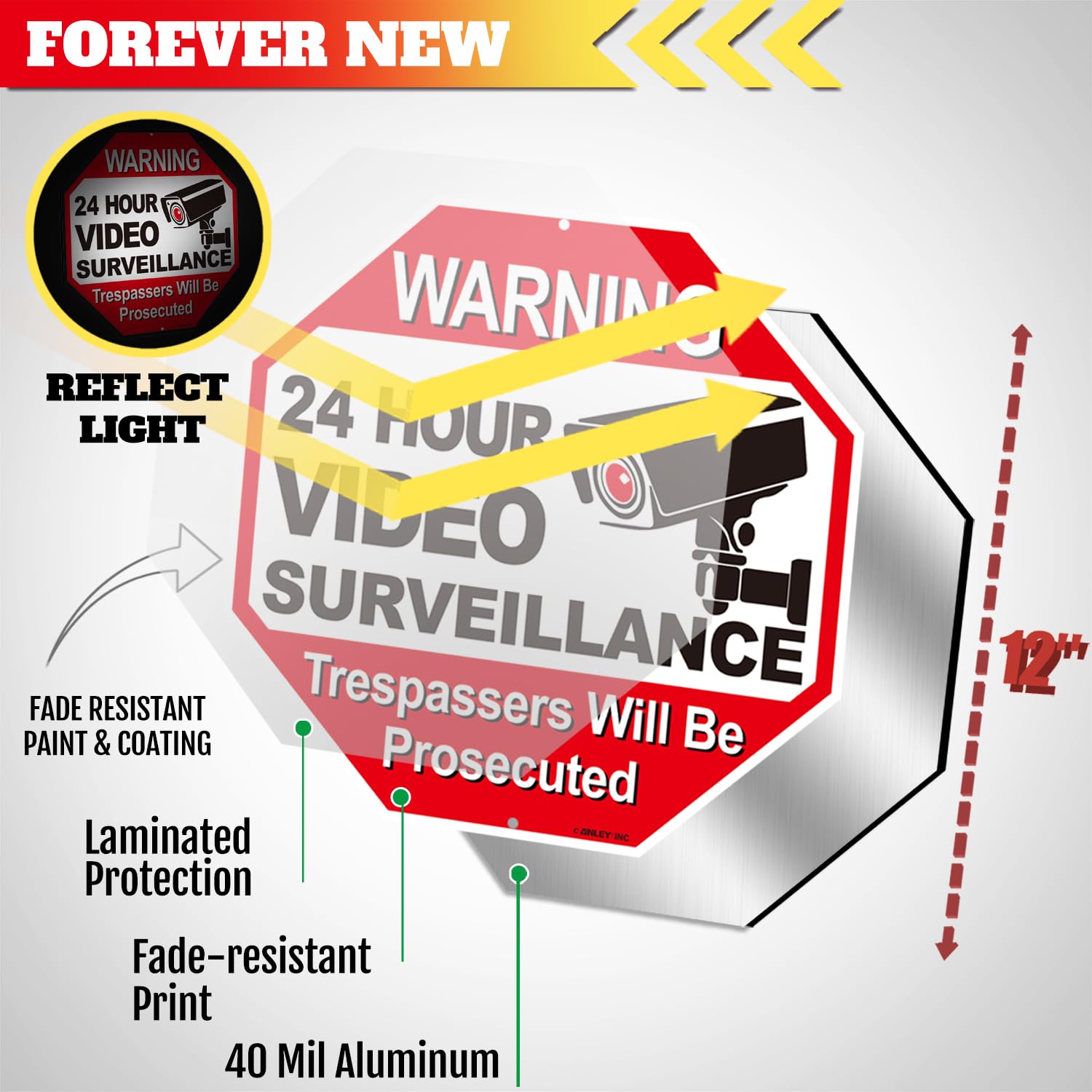 ANLEY 24-Stunden-Videoüberwachungs-Warnschild aus Aluminium, Eindringlinge werden strafrechtlich verfolgt - Kein Sicherheitsalarm - UV-geschützt und wetterfest - 12 "x 12"