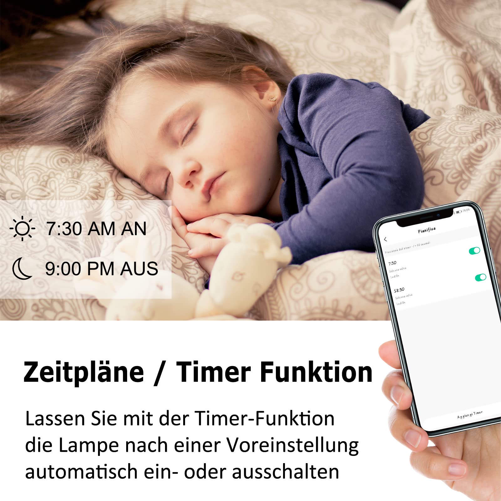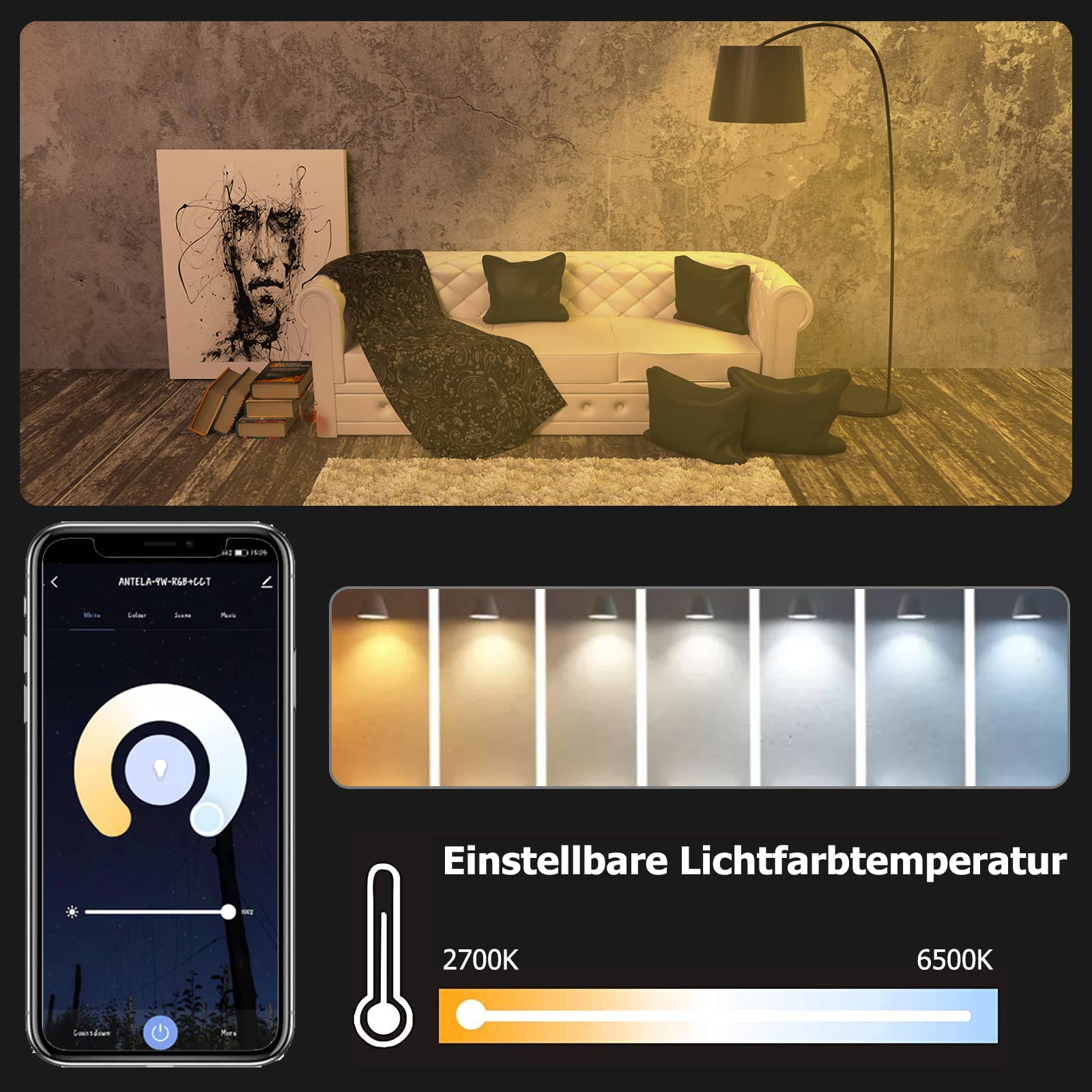 ANTELA Wlan E27 Alexa GlühbirneFarbe: RGB+CCT 2700 K ~ 6500 KDimmable: Ja.Buntes Licht: JaSpannung: 220-240 V, 50HzLeistung: 9 wLumen: 806 lmArt des Wi-Fi: 2,4 GHzLebensdauer: 15000 StundenWenn Sie Fragen haben, werden wir Ihnen innerhalb von 24 Stunden beantworten.
