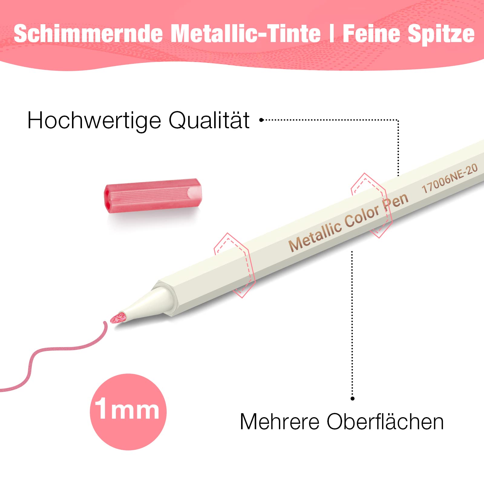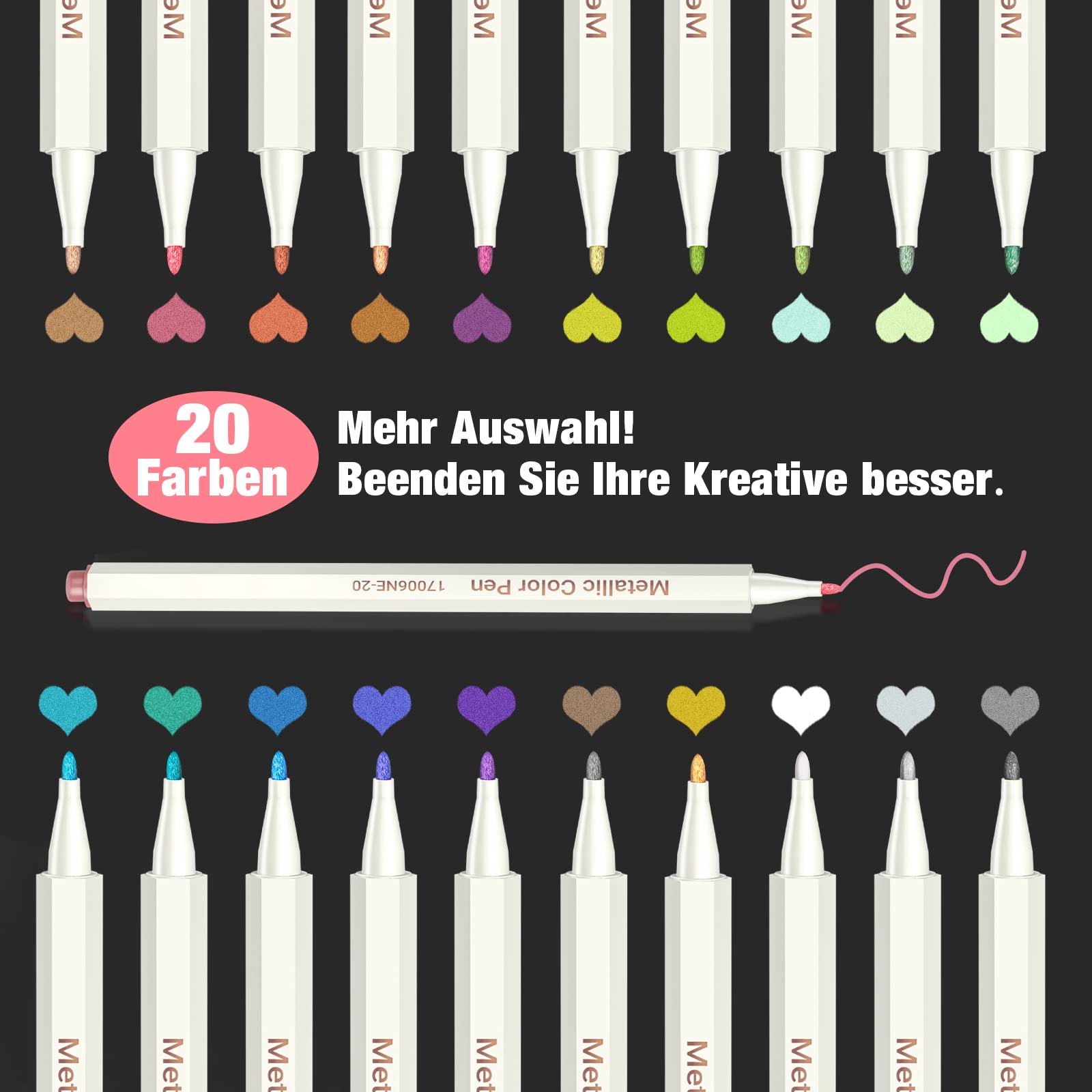• ❤ 20 Schöne Metallic Farben: Das Metallic stift set einschliesslich 20 Farben. Opake Tinten kontrastieren gut mit farbigen und schwarzes papier, unglaublich beliebt bei Kinder und Erwachsene. Es ist ein gut Bastelset Marker set für Familien oder Student, um zu Hause oder schule gemeinsam zu basteln oder zu Gestalten