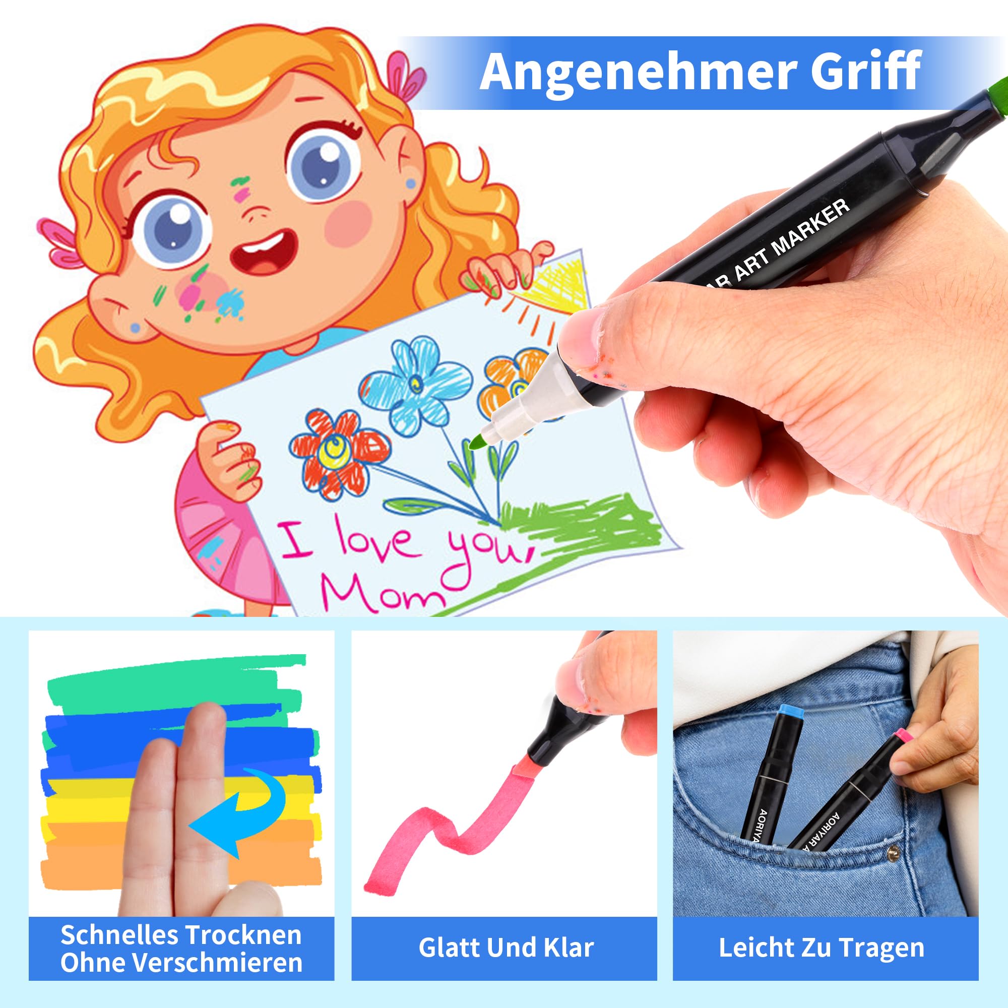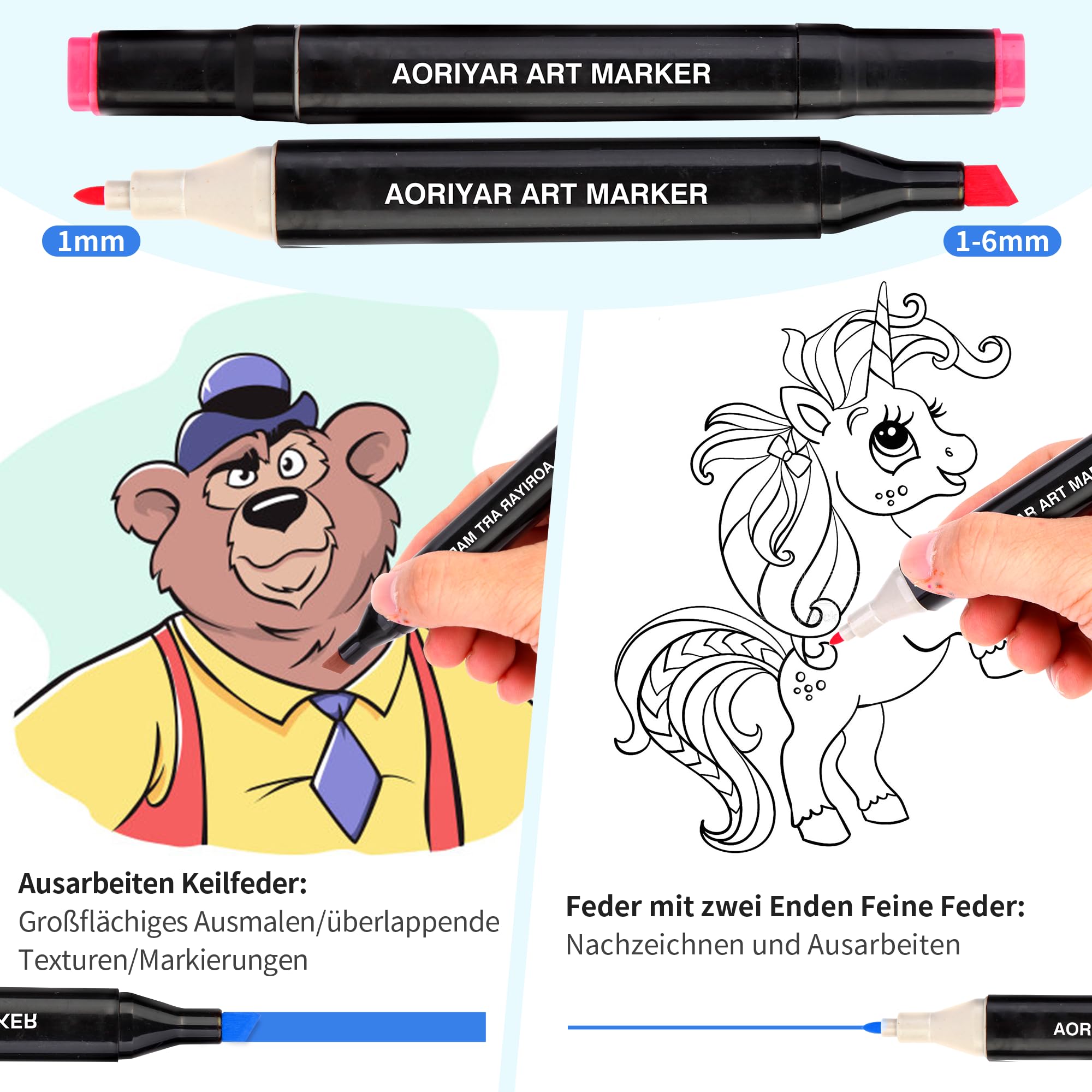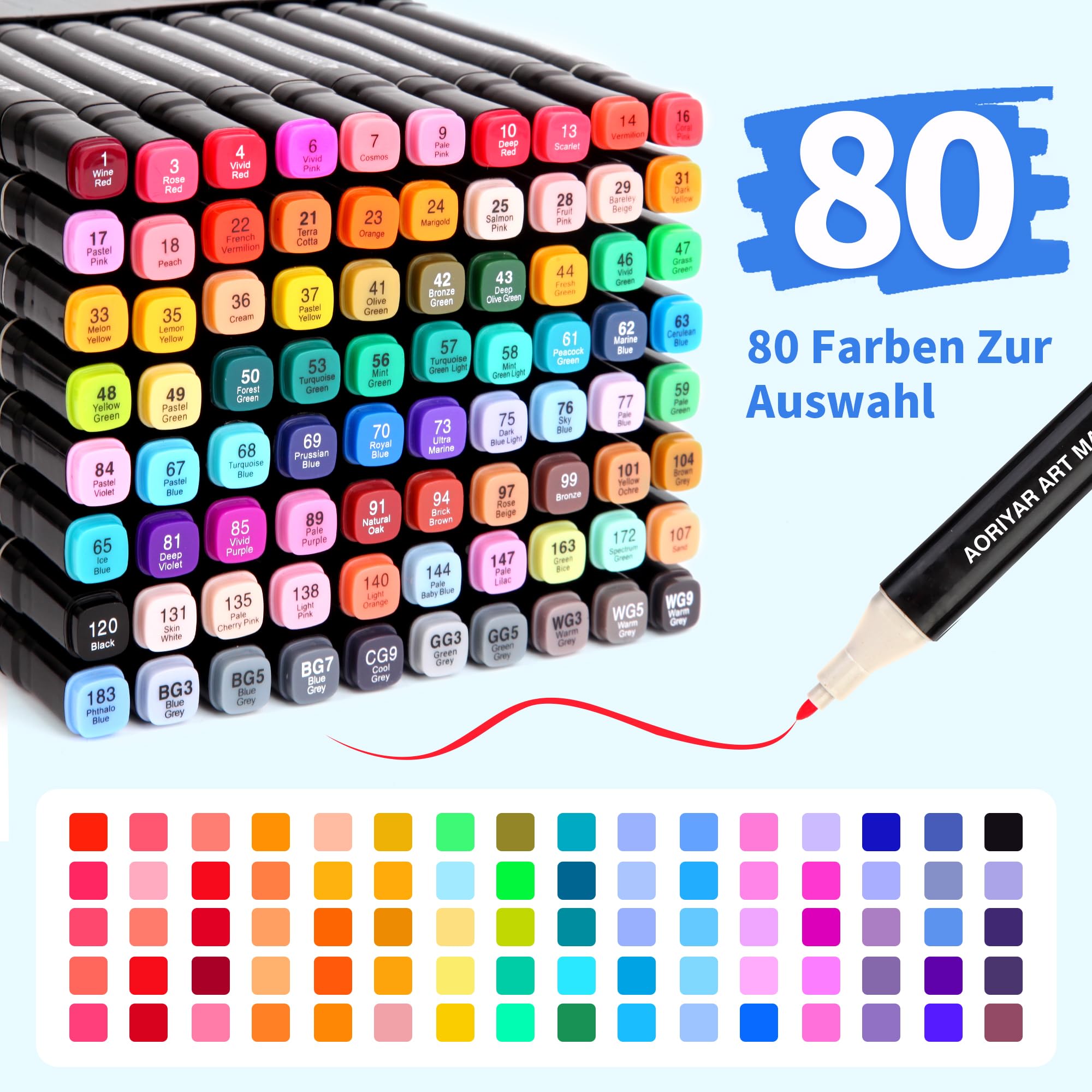 Permanentmarker in professioneller Künstlerqualität mit doppelseitigem Ende. AORIYARMARKERS hat bisher 1 Million Familien auf der ganzen Welt betreten. Von Erwachsenen und Kindern geliebt. Es wird Sie in eine bunte Welt eintauchen und das Glück geniessen, Kreativität in die Realität umzusetzen. 1. Konzentrieren Sie sich auf die Herstellung nur dieses Markers, was zu einem Beruf führt. 2. Doppelspitzen. Feine Spitze und breite Spitze für verschiedene Bedürfnisse. Glattes Schreiben. 3. Geeignet für Kinder, Studenten, Lehrer, Meister, Ausbildungsagentur. 4. Professionell für Kunstmalerei und Arten von Designs, Cartoon, Mode, Architektur, Produkt, Garten, Pop-Werbung, Inneneinrichtung usw. 5. Sie sind die perfekte Geschenkwahl für Geburtstag, Internationalen Kindertag, Halloween, Erntedankfest, Neujahr und Weihnachten. Perfekt für Kinder, Jungen, Mädchen, Studenten, Erwachsene. Perfekt für jedes Kunst- oder Hobby-Projekt sowie zum Skizzieren und Hervorheben. Perfekt für Design, Skizzen, Manga, Marker, Grafiken, Hausaufgaben, Rechnungen, Kalender, Illustrationen, Zeichnungsverzierungen, komplizierte Designs usw. Hochwertige, wasserfeste Tinte in Künstlerqualität, Ihre Farben verbinden sich natürlich ohne Unterschiede. Die universellen Farben erfüllen alle Ihre Zeichenbedürfnisse. Perfekt für Kunstmalerei und Arten von Designs, Cartoon, Mode, Architektur, Produkt, Garten, Pop-AD, Inneneinrichtung usw. Es wird Sie in eine bunte Welt eintauchen und das Glück geniessen, Kreativität in die Realität zu verwandeln. Wir möchten so vielen Menschen wie möglich die Freude an der Kunst bringen. Tipps: Alkoholtinte ist leicht zu trocknen, wenn sie nicht wieder zusammenfällt. Wie alle Alkohol-Marker anderer Marken, werden sie durch normales Färbepapier durchlaufen, ausser sehr dickes Papier, Markerpapier.
