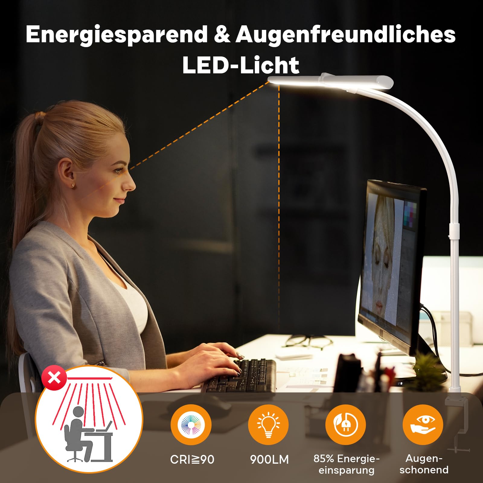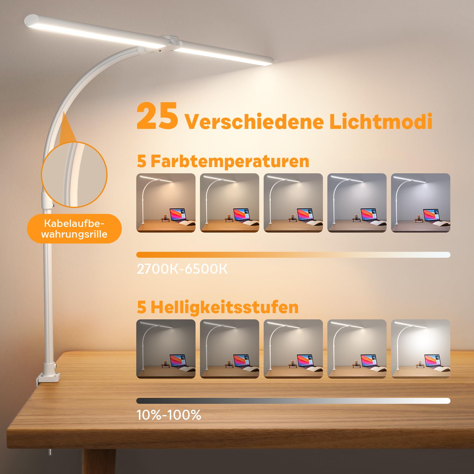 APMIEK Doppelkopf Schreibtischlampe LED Dimmbar, 24W 25 Beleuchtungsmodi, Klemmbar Tageslichtlampe Schreibtisch Lampe, Schwanenhals Büro Tischlampe, Augenschutz Monitor Lampe, Weiss
