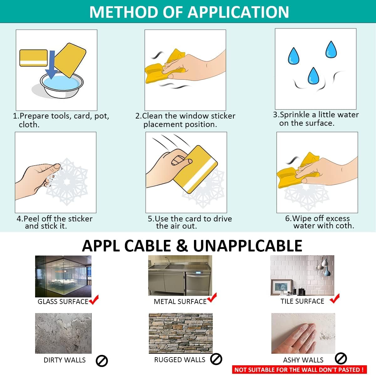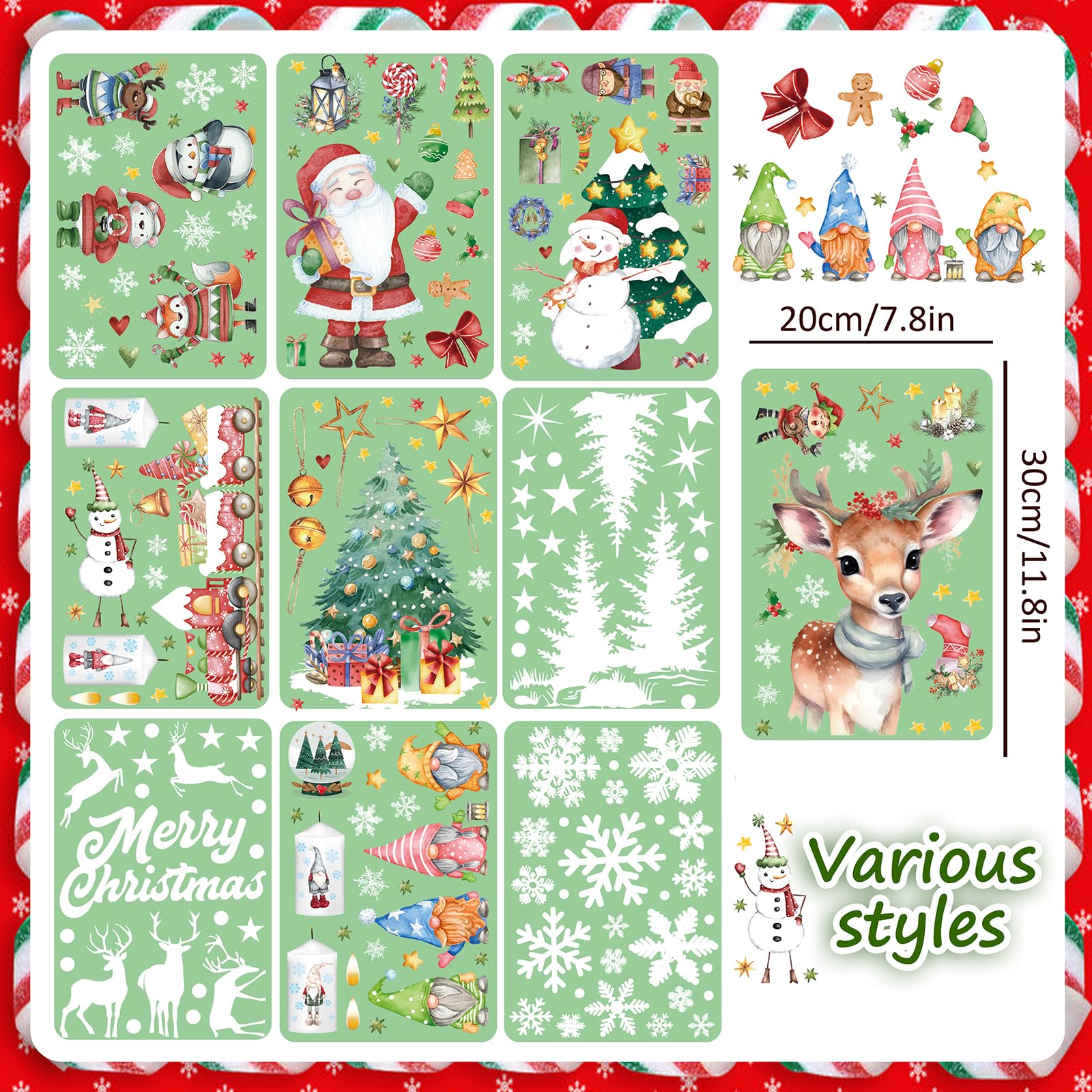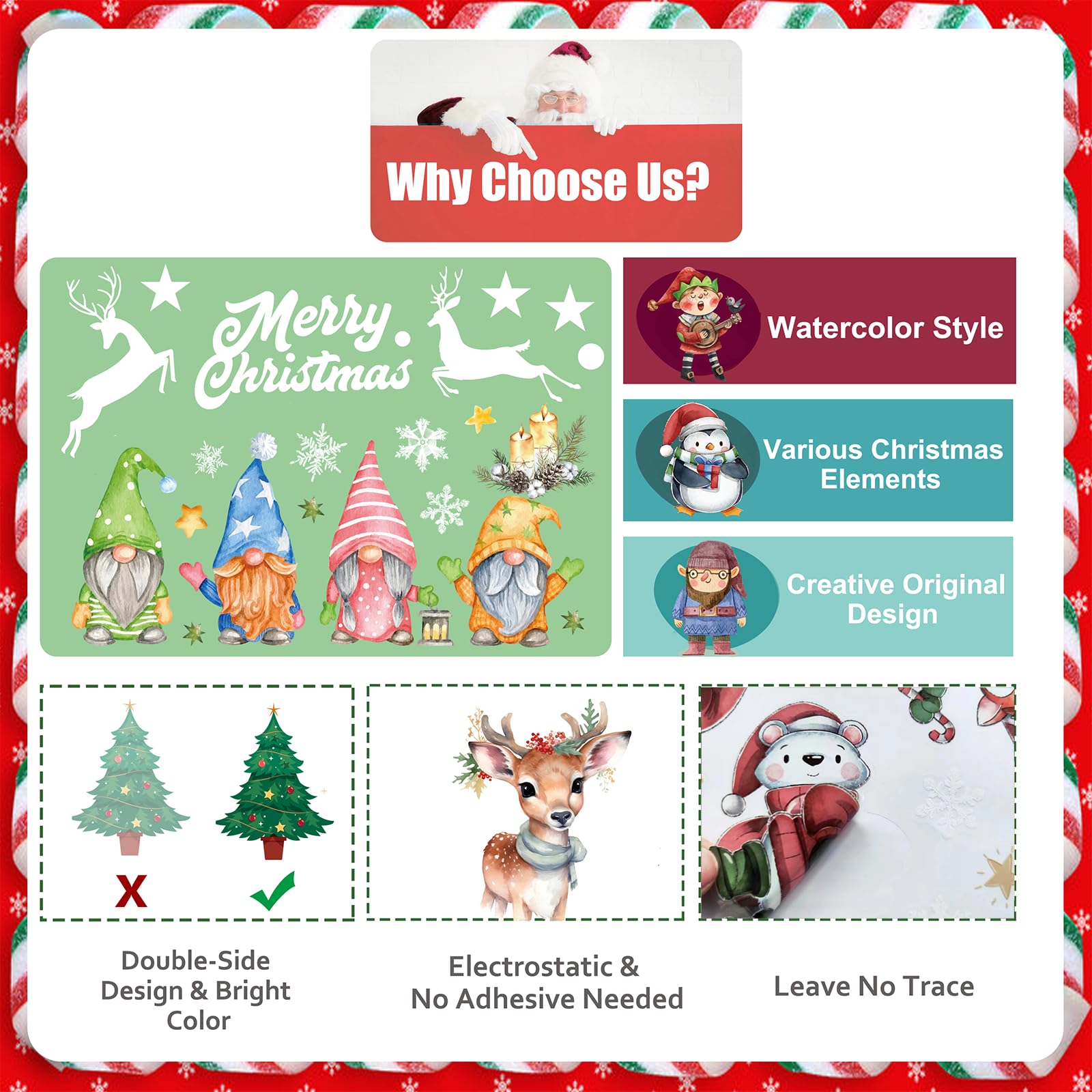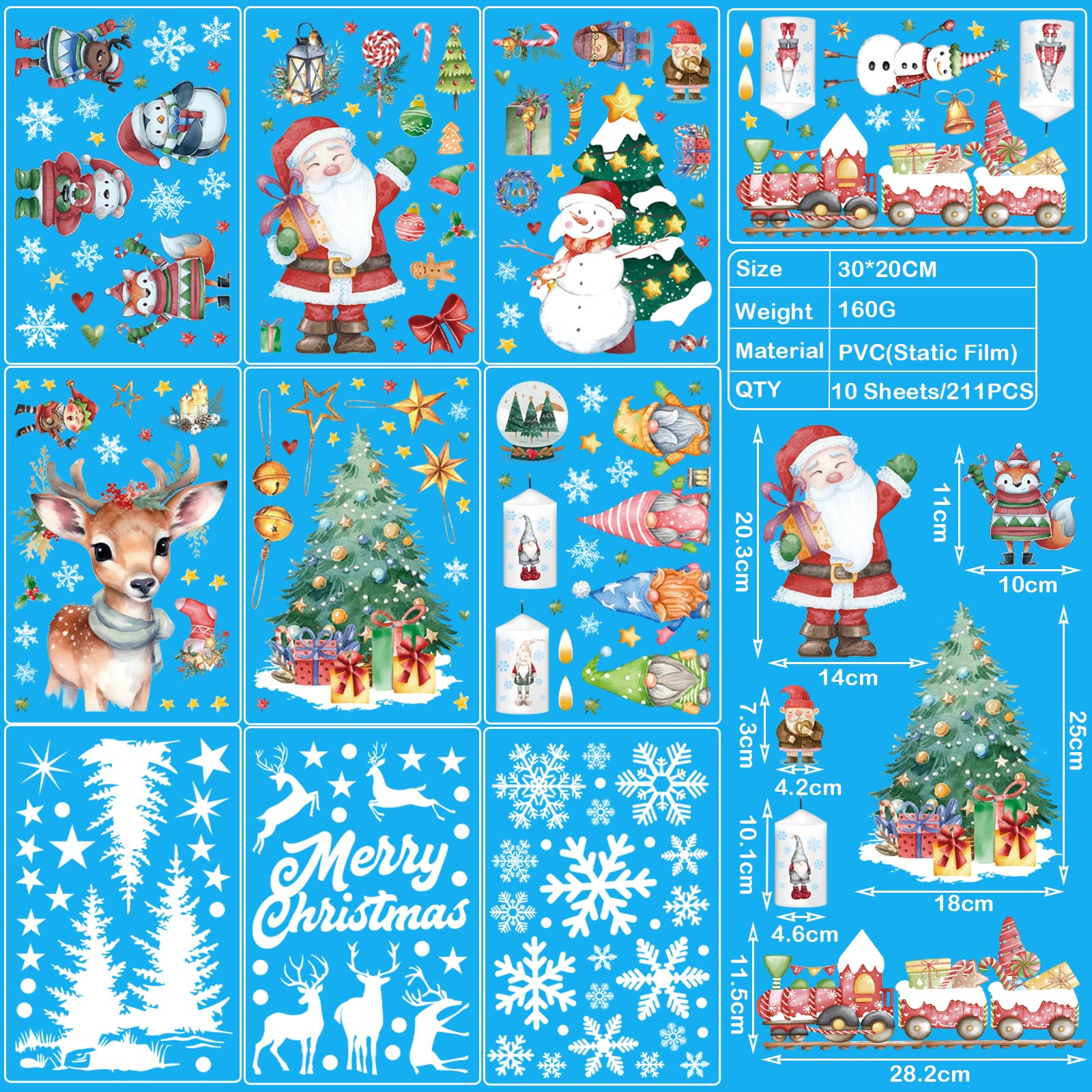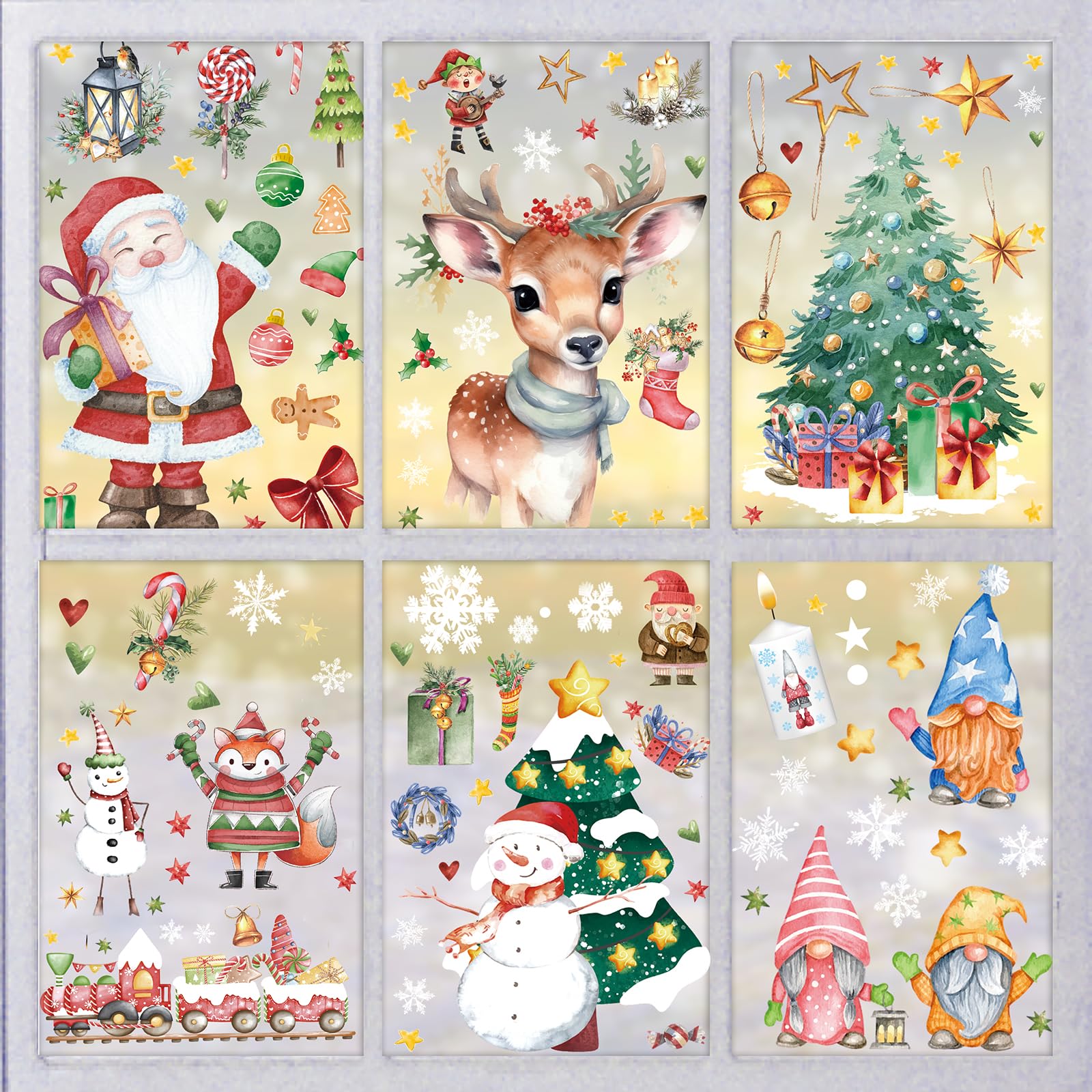 EIGENSCHAFTEN:1. Eigenschaften: Es gibt verschiedene Arten von Weihnachtselementen wie Weihnachtsmann, Schneeflocken, Weihnachtsbaum, Glocken und dekorative Kugeln, alles typische Symbole für Weihnachten.2. Klebstofffreier Aufkleber: Dies ist ein statischer Weihnachtsaufkleber ohne Klebstoff, einfach zu verwenden und leicht abzuziehen.3. Statisch und wirtschaftlich und repositionierbar: Es ist statisch, Sie können es entfernen und so lange zurücklegen, wie Sie möchten, also sehr wirtschaftlich.4. Wiederverwendbar: Im nächsten Jahr sind diese Wintersticker noch erhältlich. Dies sind wiederverwendbare Aufkleber, damit Sie sie aufbewahren können!5. Keine Rückstände hinterlassen: Die Fensteraufkleber haften leicht auf glatten Oberflächen wie Fenstern, Keramikfliesen, Türen und Spiegeln, Haushaltsgeräten, Klimaanlagen, Büros, Schlafsälen, Geschäften oder Kaffee.6. Doppelseitiges Design: Diese Fensteraufkleber Weihnachten haben doppelseitige Designs, diese lebendigen Designs können sowohl innen als auch aussen betrachtet werden.Wie benutzt man:1. Stellen Sie sicher, dass die Oberfläche glatt und ohne Textur ist. Andernfalls dringt Luft in den Raum zwischen dem Aufkleber und der Oberfläche ein und der Aufkleber fällt ab.2. Reinigen Sie die Oberfläche, um sicherzustellen, dass sich kein Staub oder Fett auf der Oberfläche befindet.3. Sprühen Sie ein wenig Wasser auf das Glas und Wasser können es viel besser kleben lassen. Aber zu viel Wasser wird den Aufkleber abnehmen.4. Wenn sich zwischen dem Aufkleber und dem Fenster eine kleine Blase befindet, kratzen Sie diese bitte mit einer Karte ab, bevor Sie sie glätten.Tipp:Um keine Schwierigkeiten zu haben, die Elemente aus dem Blatt zu entfernen, können Sie das blaue/weisse Teil (nicht das Stützpapier) langsam entfernen und jeden Aufkleber auf dem Stützpapier aufbewahren, müssen Sie die Elemente nur durch eine sichtbare Eigenschaft ausziehen Ohne Schwierigkeiten.