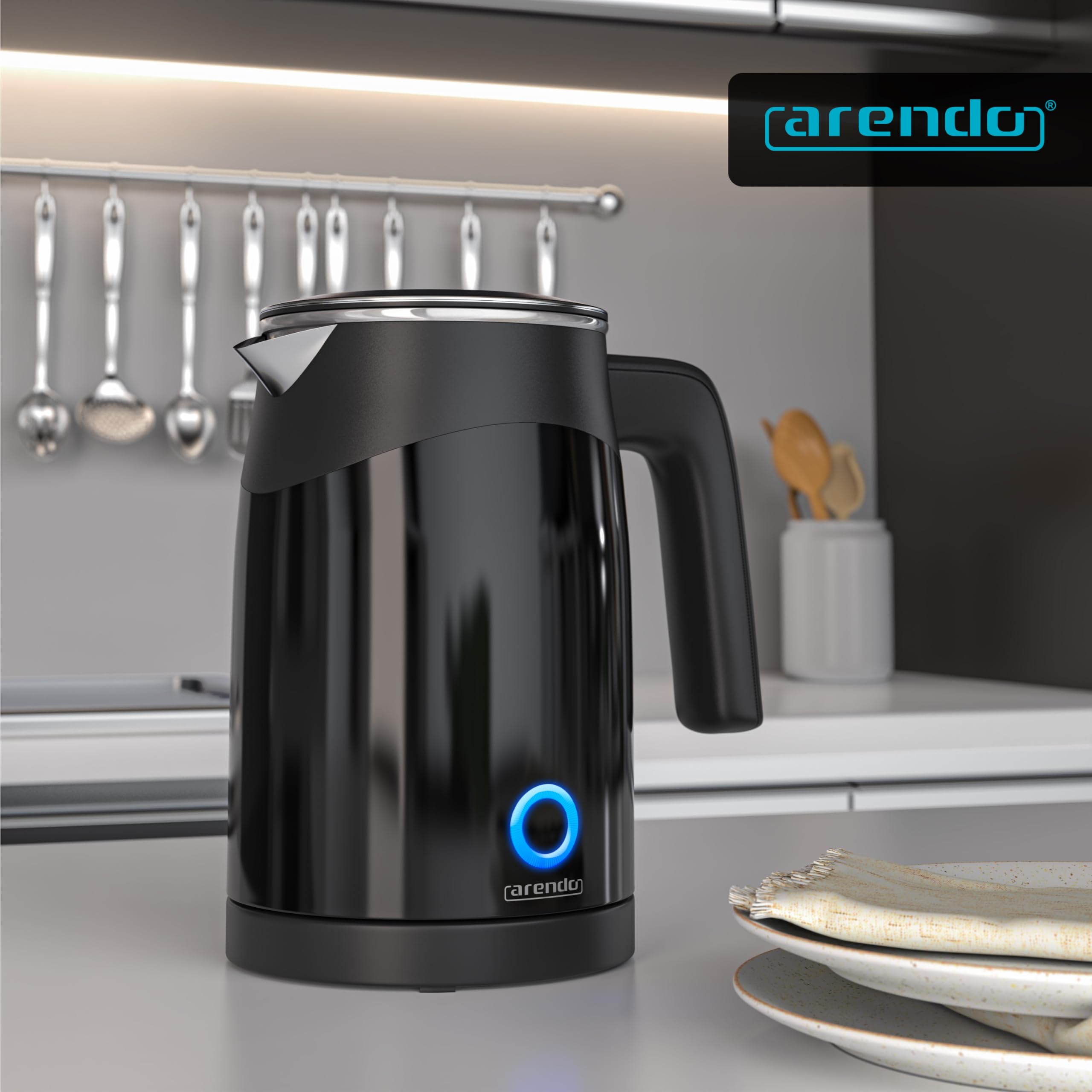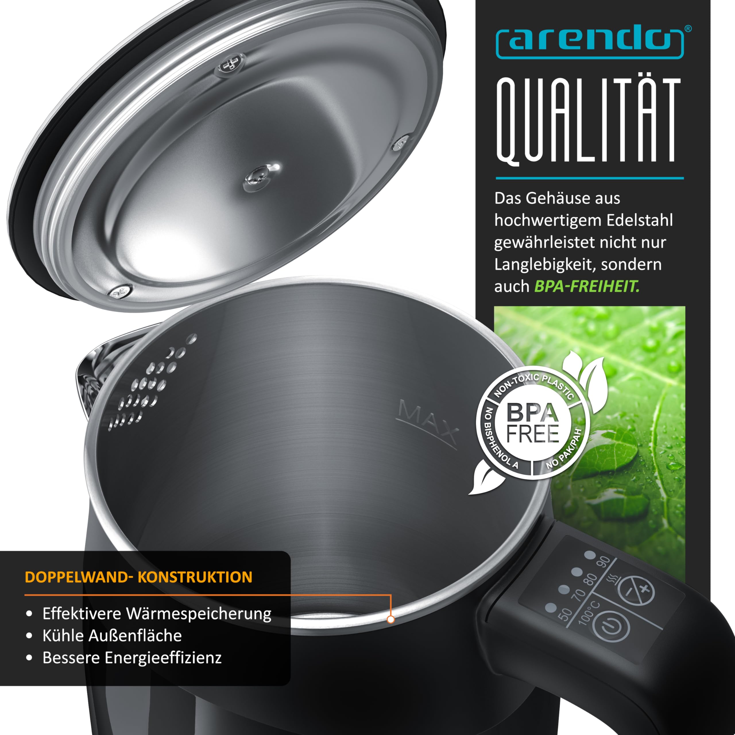 ProduktvorteileAutomatische Endabschaltung (Auto Off)Multicolour Power-LED (zeigt per definierter Farbe die eingestellte Zieltemperatur mit verschiedenen Farben an: grün, blau, pink, gelb, rot)blaue Status-LED (Bedienfeld)Trockengeh- und Überhitzungsschutzrobuster Deckel mit DichtungsringAkustisches Signal (Buzzer): Signalisiert die Bedienung des Gerätes und die Beendigung des AufkochensAnti-Rutsch-Füssedoppelwandig (bleibt an der Aussenfläche angenehm kühl)Warmhaltefunktion (für Temperaturen bis 90°) für 1 StundeKompaktes und handliches DesignEnergiesparend durch wählbare Temperatureinstellung, max. Leistungsaufnahme 1100 WInnengehäuse aus Edelstahl – Wasser kommt beim Aufkochen nicht in Kontakt mit Kunststoffen; BPA-freiStrix-Controller360° Basisstation mit Anschlussleitung, Wasserkocher schnurlos Abmessungen: 19,5 x 12,5 x 18,5 cm (H x B x T) | Länge des Anschlusskabels: 65 cm Gewicht: 665 g (nur Gerät) / 165 g (Basisstation) | Material: Kunststoff (aussen) und Edelstahl (innen) Farbe: schwarz Lieferumfang: Arendo Single-Wasserkocher inkl. Bodenplatte + Bedienungsanleitung (GER, ENG) Technische DatenSpannungsversorgung: 220-240 V AC, 50/60HzLeistungsaufnahme: 920-1100 WStandby-Verbrauch: Wasser-Füllmenge: 0,5 lTemperaturstufen und Farben der Status-LED: 50°C – Grün / 70°C – Blau / 80°C – Pink / 90°C – Gelb / 100°C – Rot2-Tasten-Bedienung auf dem Griff: 1) Power ON (100°C) /OFF; lange gedrückt halten: Warmhaltefunktion. 2) Temperaturauswahl