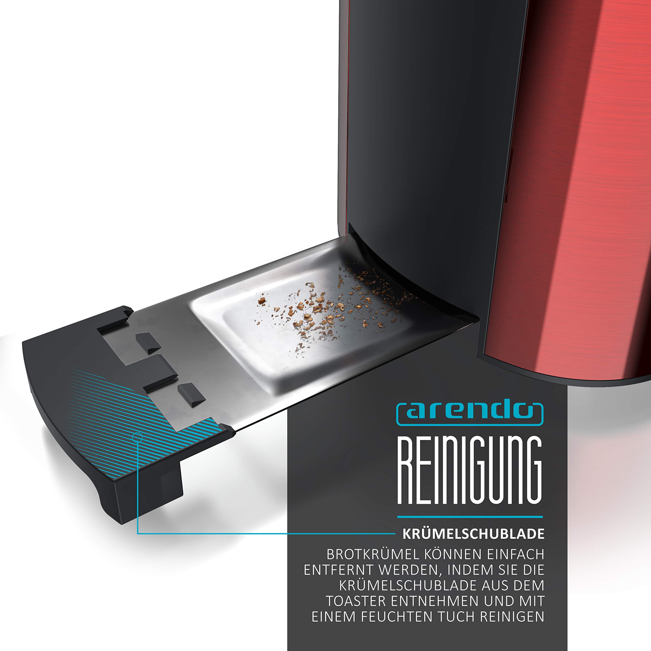 die herausnehmbare Krümelschublade eine unkomplizierte und schnelle Reinigung.Technische DatenLeistungsaufnahme: 1250 W - 1500 WSpannungsversorgung: 220-240V 50/60HzWärmeisolierendes DoppelwandgehäuseDrehregler für die Bräunungsgrade 1-6Mit Display: zeigt die Restzeit des Toastvorgangs Automatische BrotscheibenzentrierungHerausnehmbare KrümelschubladeIntegrierter Brötchenaufsatz für Baguettes, Bagels, Brötchen, Croissants etc.KabelaufwicklungGummifüsse für stabilen Stand3 Tasten (CANCEL/ REHEAT/ DEFROST) mit blauer Bestätigungs-LED1 Bedienhebel für Röstschacht + 1 für integrierten BrötchenaufsatzAutomatische AbschaltungGS-zertifiziertAbmessungen (ohne Brötchenaufsatz): (H x B x L) 19,5 x 38,5 x 19 cm | Kabellänge: 88 cmGewicht: 1938 gLieferumfang: Arendo Frukost 4-Scheiben Langschlitztoaster plus Bedienungsanleitung