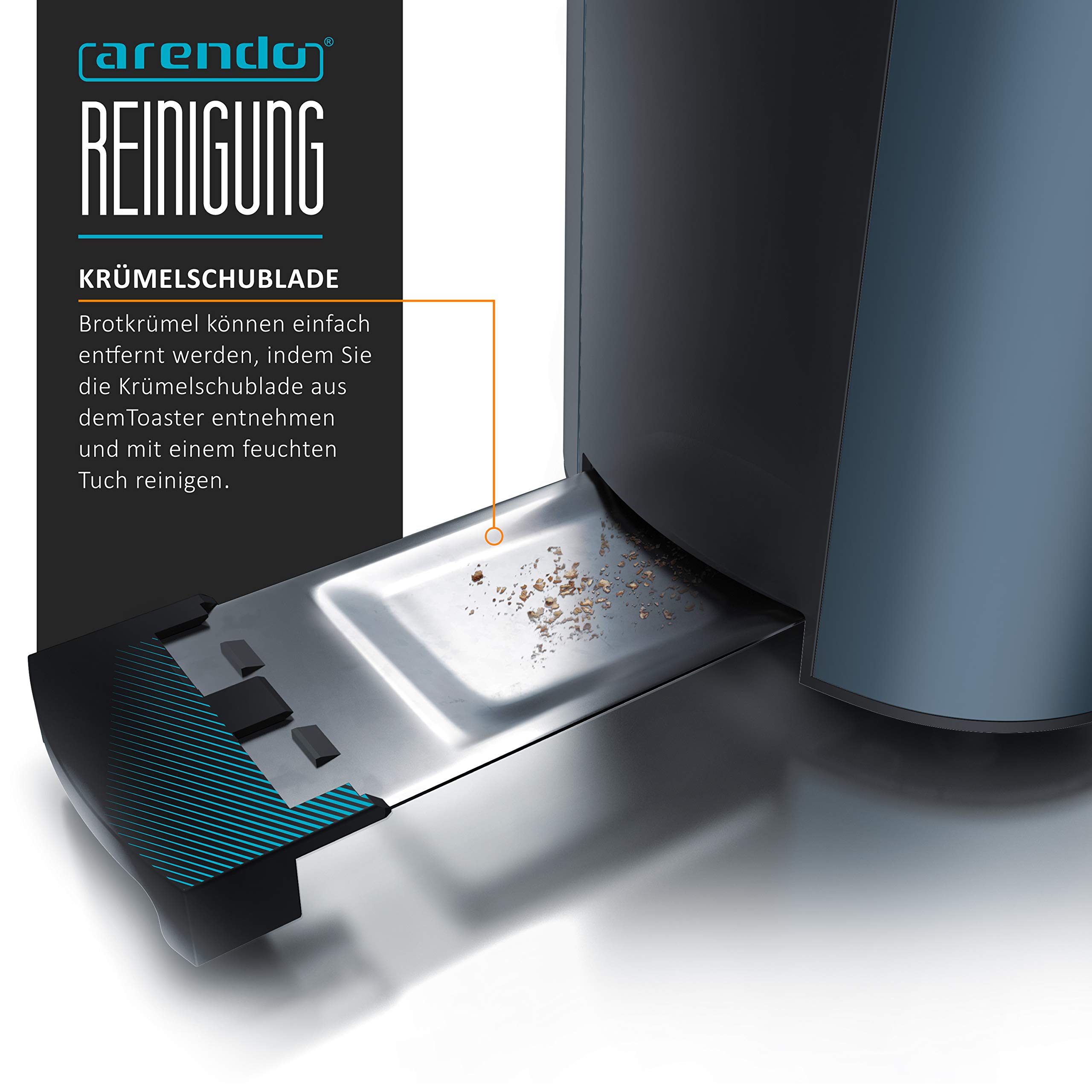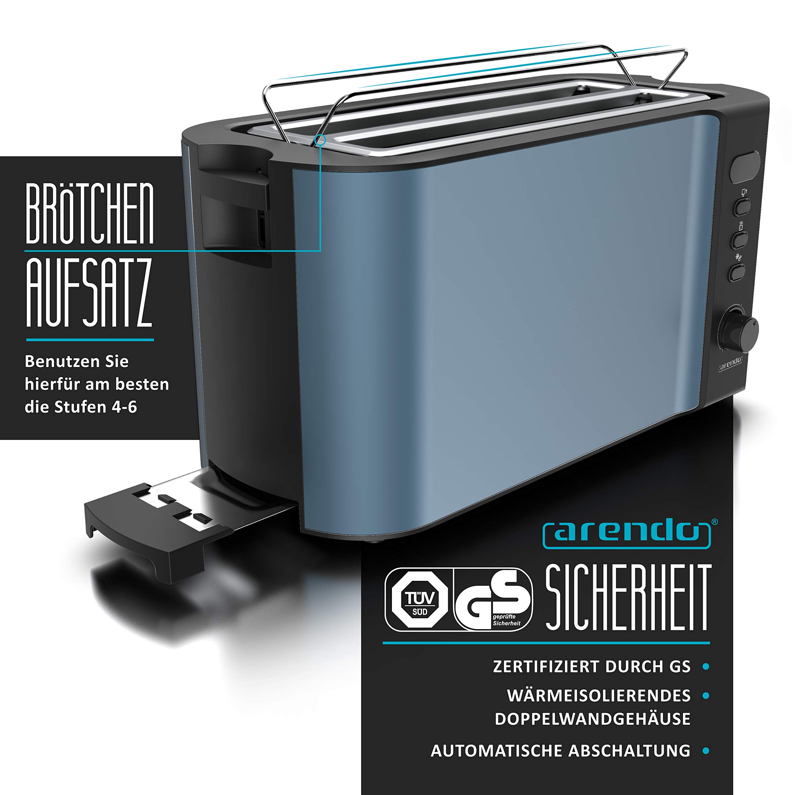 Stilvoller 4-Scheiben-Langschlitz-Toaster mit Displayanzeige und integriertem Brötchenaufsatz: für das perfekte Frühstück! Der elegante Arendo Frukost Langschlitz-Toaster überzeugt auf ganzer Linie. Ob Baguettes, Bagels, Brötchen, Croissants oder dicke und dünne Brotscheiben - der hochwertige Edelstahl-Toaster bräunt bis zu 4 Scheiben knusprig und kross. Sein besonderes Highlight ist das Display mit Anzeige der Restzeit des aktuellen Toastvorgangs und des gewählten Bräunungsgrades (1-6), angezeigt in leuchtend blauen, gut ablesbaren Ziffern. Durch die Auftau-Funktion kann gefrorenes Brot schnell getoastet werden. Zusätzlich lässt die Aufwärmfunktion (Reheat) bereits geröstetes Brot auf Knopfdruck wieder warm werden. Zudem erleichtert die herausnehmbare Krümelschublade eine unkomplizierte und schnelle Reinigung. Technische Daten Leistungsaufnahme: 1250 W - 1500 W Spannungsversorgung: 220-240V 50/60Hz Wärmeisolierendes Doppelwandgehäuse Drehregler für die Bräunungsgrade 1-6 Mit Display: zeigt die Restzeit des Toastvorgangs und die aktuell gewählte Toaststufe Automatische Brotscheibenzentrierung Herausnehmbare Krümelschublade Integrierter Brötchenaufsatz für Baguettes, Bagels, Brötchen, Croissants etc. Kabelaufwicklung Gummifüsse für stabilen Stand 3 Tasten (CANCEL/ REHEAT/ DEFROST) mit blauer Bestätigungs-LED 1 Bedienhebel für Röstschacht + 1 für integrierten Brötchenaufsatz Automatische Abschaltung GS-zertifiziert Abmessungen (ohne Brötchenaufsatz): (H x B x L) 19,5 x 38,5 x 19 cm Kabellänge: 88 cm Gewicht : 1938 g Lieferumfang : Arendo Frukost 4-Scheiben Langschlitztoaster plus Bedienungsanleitung