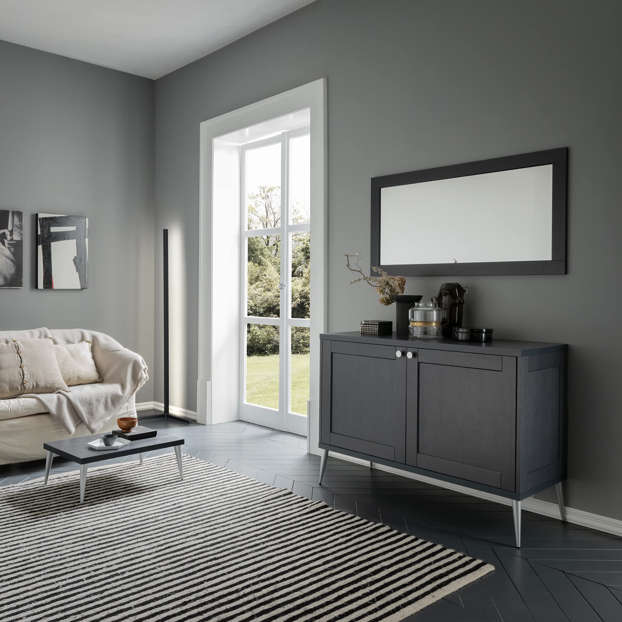 Masse (L x H x T): 60 x 160 x 2 cm. Farbe: Nachtblau Material: MDF beschichtet mit Dekor in Holzoptik, die das Finish und die Maserung imitiert. Die Dekoration ist mit Syncropor-Technologie hergestellt, die Holzmaserung ist sichtbar und fühlt sich an. Spiegel mit hohem Reflexionsindex und hoher Qualität. Der Mirror Safe Schutz garantiert die Sicherheit des Benutzers im Falle eines Bruchs des Spiegels. Installation: Der Spiegel kann auf den Boden gestellt werden (durch Befestigung der Wandhalterungen), kann aber horizontal oder vertikal mit der mitgelieferten Doppelbefestigung an der Wand montiert werden (Dübel zur Wandbefestigung nicht im Lieferumfang enthalten). Beschreibung: Der Spiegel ist ein Element, das nicht nur eine sehr nützliche Funktion bietet, sondern auch mit extremem Geschmack, viel Raffinesse und Eleganz dekorieren kann. Der Schminktisch kann in verschiedenen Räumen im Eingangsbereich oder im Wohnzimmer verwendet werden, um Räume optisch zu dekorieren und zu erweitern oder im Schlafzimmer als Hilfe beim Schminken und Überprüfen der Kleidung. Durch sein Design und seine Form passt unser Spiegel perfekt zu jedem Stil und jeder Einrichtung. Modularität: Es ist für eine einzelne Installation konzipiert und eignet sich perfekt für Schlafzimmer oder Wohnzimmer.
