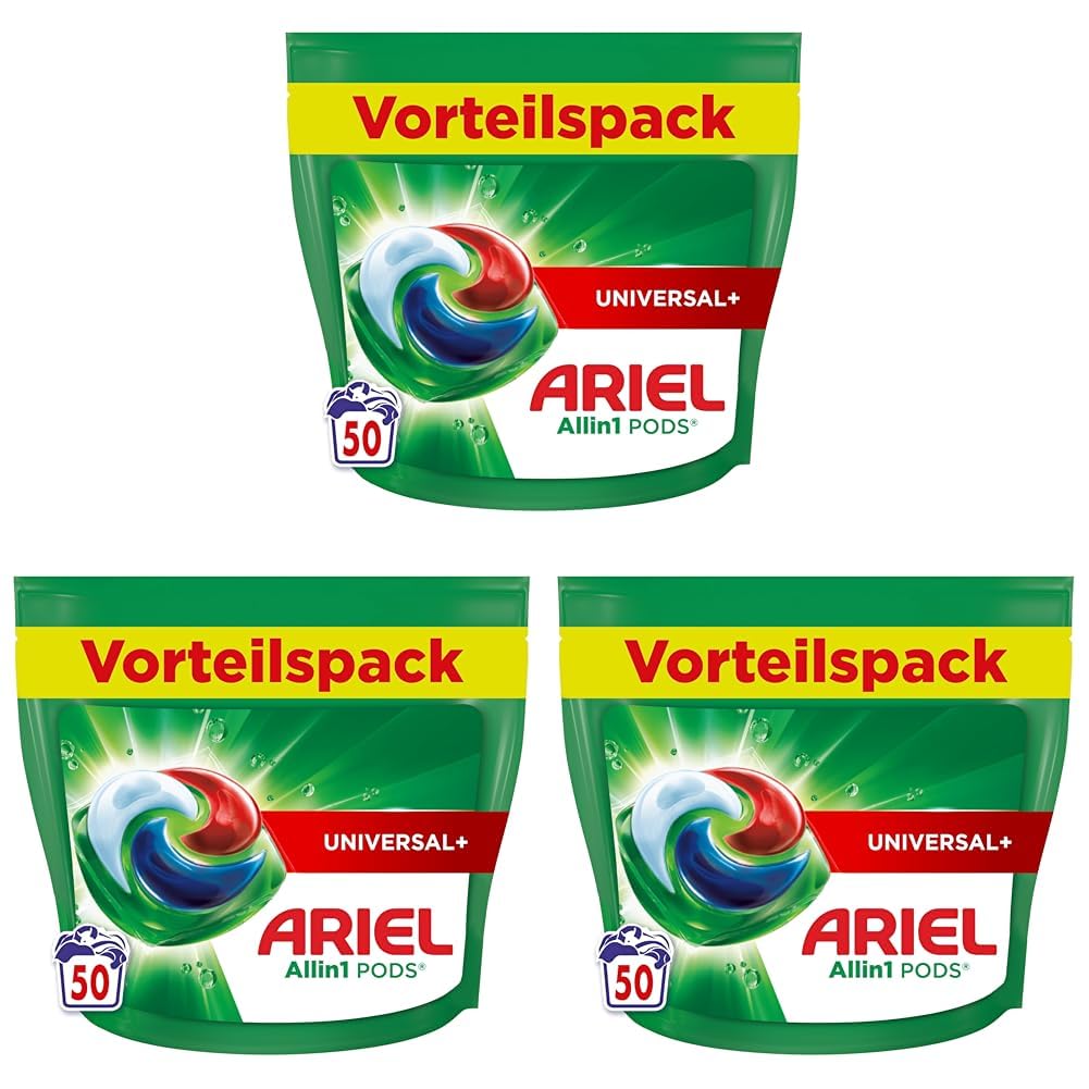 Ariel Waschmittel Pods All-in-1, Flüssigwaschmittel Kapseln 50 Waschladungen, Universal+, Kraftvolle Fleckentfernung ab der 1. Wäsche (Packung mit 3)