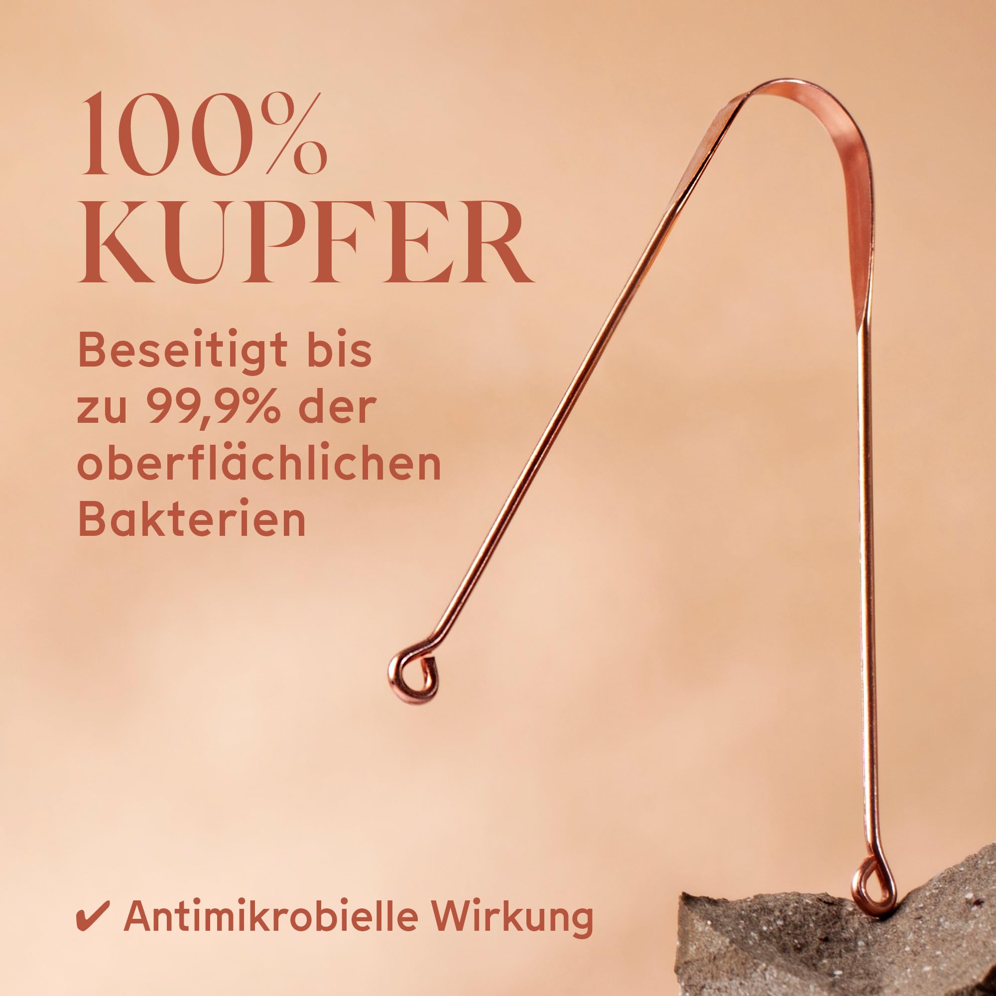• 100% Kupfer: Dieser Zungenkratzer wurde konzipiert, um die gesamte Zunge effektiv zu reinigen. Er ist aus reinem Kupfer, dem hygienischsten Material aufgrund seiner antibakteriellen und antimikrobiellen Eigenschaften.