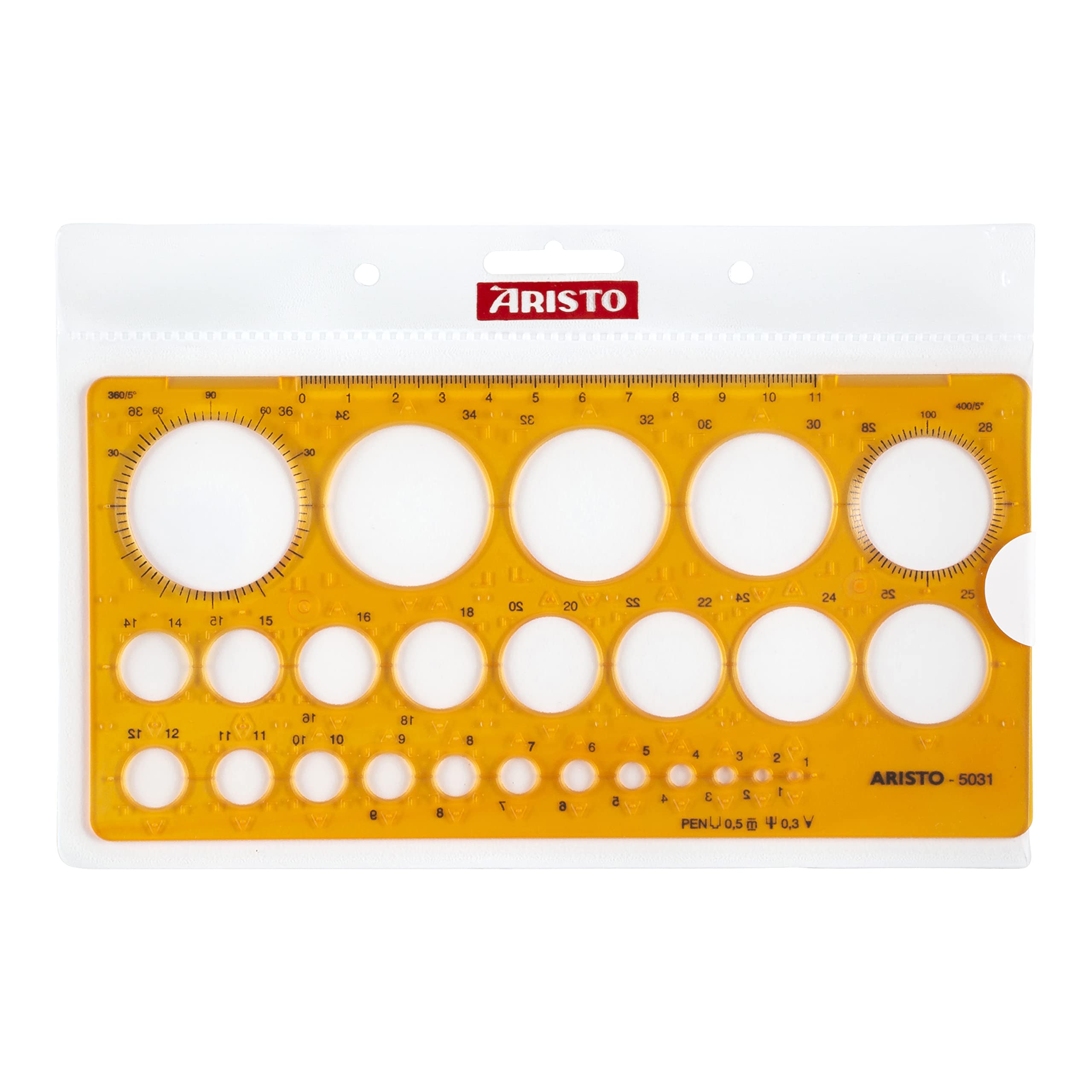 Aristo Kreisschablone AH5031, 1-36 mm (25 Kreise, Durchmesser 1 bis 36 mm, Tuschenoppen, formstabiler Kunststoff) orange-transparent