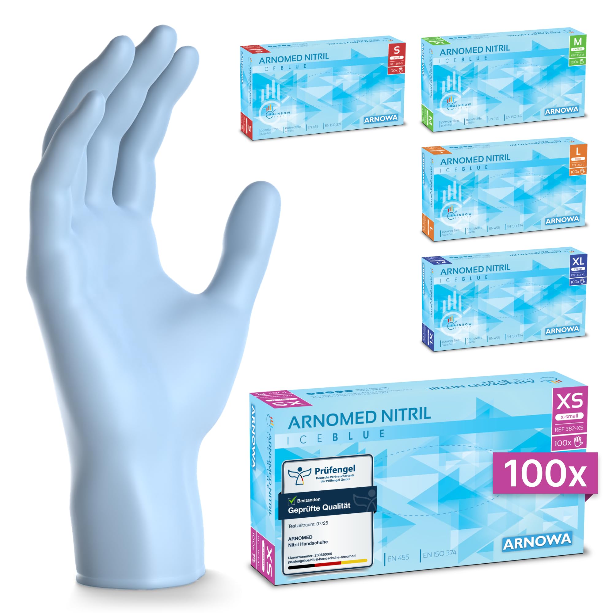 ARNOMED Einweghandschuhe Hellblau 100 Stück/Box, Einmalhandschuhe XS, Nitrilhandschuhe, Handschuhe Einweg puderfrei, latexfreie Gummihandschuhe, Einweghandschuhe in XS, S, M, L & XL verfügbar