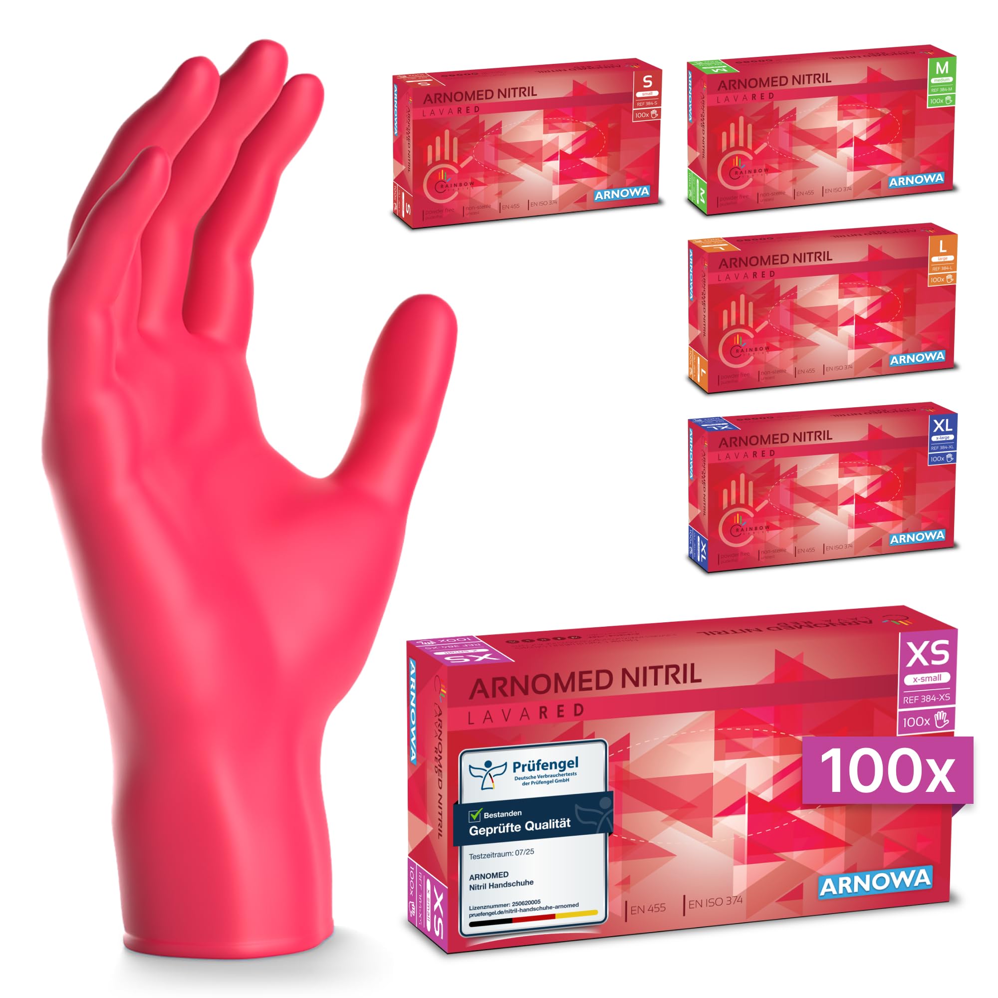ARNOMED Einweghandschuhe Rot 100 Stück/Box, Einmalhandschuhe XS, Nitrilhandschuhe, Handschuhe Einweg puderfrei, latexfreie Gummihandschuhe, Einweghandschuhe in XS, S, M, L & XL verfügbar