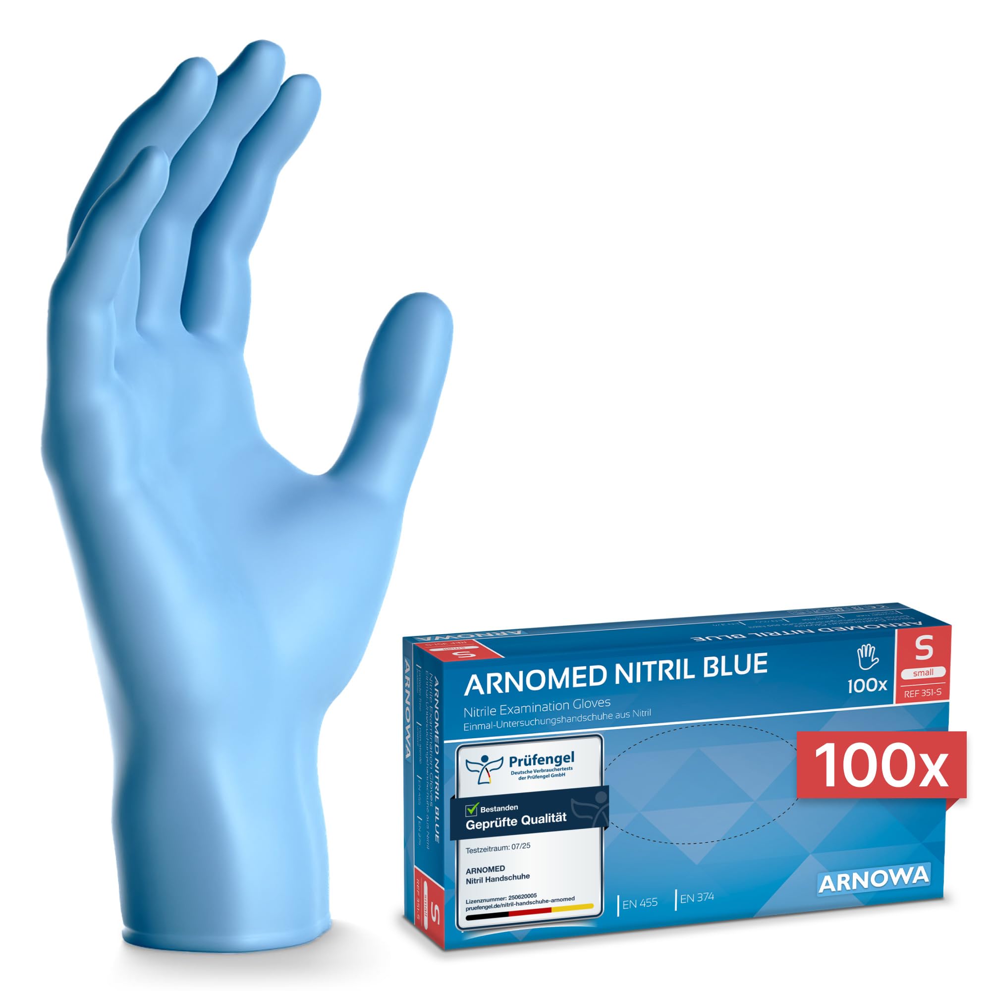 ARNOMED Nitril Einweghandschuhe 100 Stück/Box, S, puderfreie & latexfreie Einmalhandschuhe, Blaue Nitrilhandschuhe, in Gr. XS, S, M, L, XL & XXL verfügbar