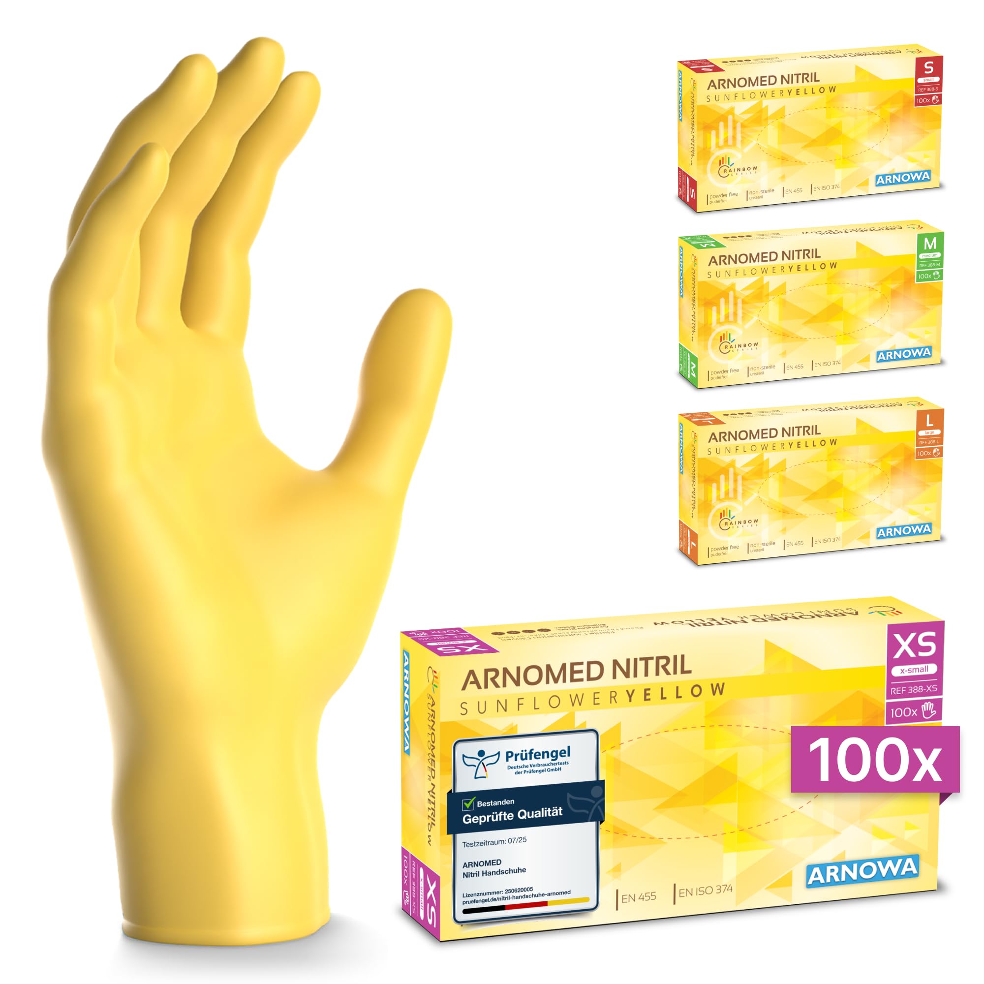 ARNOMED Einweghandschuhe Gelb 100 Stück/Box, Einmalhandschuhe XS, Nitrilhandschuhe, Handschuhe Einweg puderfrei, latexfreie Gummihandschuhe, Einweghandschuhe in XS, S, M & L verfügbar