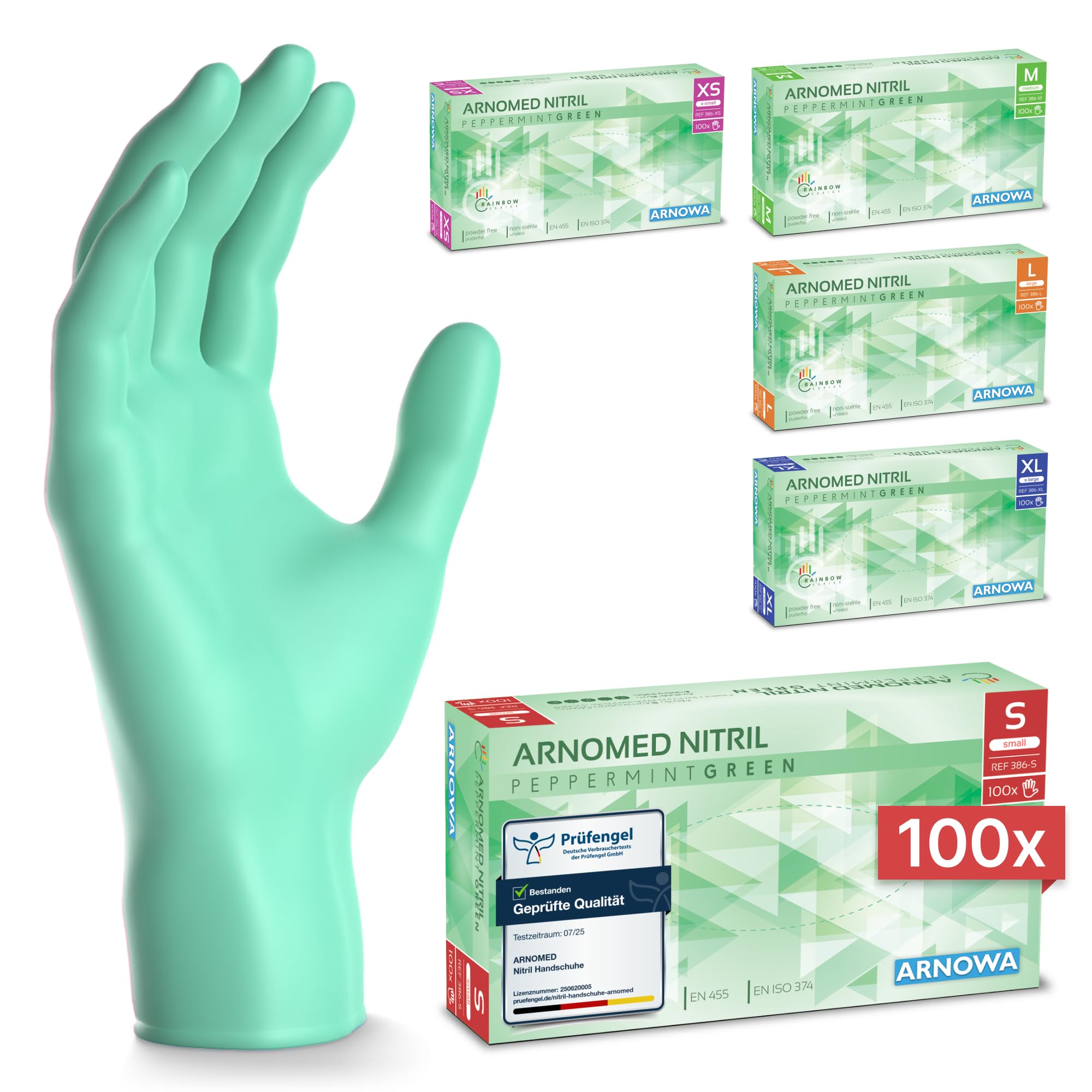 ARNOMED Einweghandschuhe Grün 100 Stück/Box, Einmalhandschuhe S, Nitrilhandschuhe, Handschuhe Einweg puderfrei, latexfreie Gummihandschuhe, Einweghandschuhe in XS, S, M, L & XL verfügbar